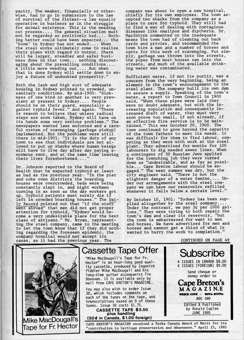 Published by Ronald Caplan on 1985/6/1 (287 reads)pacity. The weaker, financially or other? wise, had to go in submission to the law of survival of the fittest--a law equally operative in business as in the struggle for animal existence. This is the weeding out process.... The general situation must not be regarded as positively bad.... Noth? ing better could have been expected... the 'boom' in Sydney has not ended.... When the steel works ultimately come to realize their plans with regard to output, there will be larger, steadier and safer busi? ness done in that town... nothing discour? aging about the prevailing conditions.... A little more weeding out,... But when that is done Sydney will settle down to en? joy a future of undoubted prosperity." Both the lack and high cost of adequate housing in Sydney pointed to crowded, un? sanitary conditions. By mid-1900: "Sick? ness of one kind or another is very prev? alent at present in Sydney.... People should be on their guard, especially a- gainst typhoid fever." And again: "There is reason to believe that unless radical steps are soon taken, Sydney will have on its hands some very serious problems." The newspapers wanted laws enforced and a care? ful system of scavenging (garbage pickup) implemented. But the problems were still there in mid-1901: "It is the duty of any town to see that individuals are not al? lowed to put up shacks where human beings will have to live day after day paying e- normous rent, and at the same time leaving their lives foreshortened...." Dr. Johnson reported to the Board of Health that he expected typhoid at least as bad as the previous year: "In the pier and coke oven districts the boarding houses were overcrowded, beds were being constantly slept in, and night workmen turning in as soon as the day workers got up. Typhoid patients must surely die if left in crowded boarding houses." The Dai- ly Record pointed out that "if the story" went abroad" that men did not get proper attention for typhoid, "Sydney would be? come a very undesirable place for the best class of artisans." Mr. Bryan, represent? ing the steel company, came to the meeting to let the town know that if they did noth? ing regarding the foreseen epidemic, the company hospital would not accept its cases, as it had the previous year. The company was about tiD open a new hospital, chiefly for its own employees. The town ac? cepted two shacks from the company as a place to care for typhoid. They still had to find a way of dealing with contagious diseases like smallpox and diptheria. Dr. Maclntyre commented on the inadequate means the town had of cleaning out back yards and privies, and recommended the town hire a man and a ntimber of horses and carts for this work of scavenging. Put sim? ply, garbage was thrown into the streets, the pipes from most houses ran into the streets, and much of the available drink? ing water was contaminated. Sufficient water, if not its purity, was a concern from the very beginning, being an element in the town's encouragement to the steel plant. The company built its own dam to assure a supply. Speaking of the town's water, a report to Town Council in 1900 said, "When these pipes were laid they were no doubt adequate, but with the in? creasing population and consequently in? creased draft of water, they must very soon prove too small, if not already, if an effective fire service is to be main? tained." This was October 20, 1900. The town continued to grow beyond the capacity of the town fathers to meet its needs. It was difficult for them to find labour, com? peting as they were with work at the steel plant. They advertised for months for 100 labourers to dig needed sewer lines. When a contingent of 30 Russian Jews applied for the trenching job they were turned down as "undesirable, and as far as possi? ble... Cape Breton labour should be en? gaged." The next summer was dry, but the city engineer said, "There is not the slightest danger of a water famine.... Un? der our arrangements with the steel com? pany we can have our reservoirs refilled whenever it falls below a certain level." By October 10, 1901: "Sydney has been sup? plied altogether by the steel company.... Under the contract, we pay 3o per 1000 gal? lons ." They were trying to both repair the town's dam and clear its reservoir, "but the town is embarrassed for want to men and horses. We have advertised for men and horses and cannot get a third of what is wanted to hurry the work to completion."