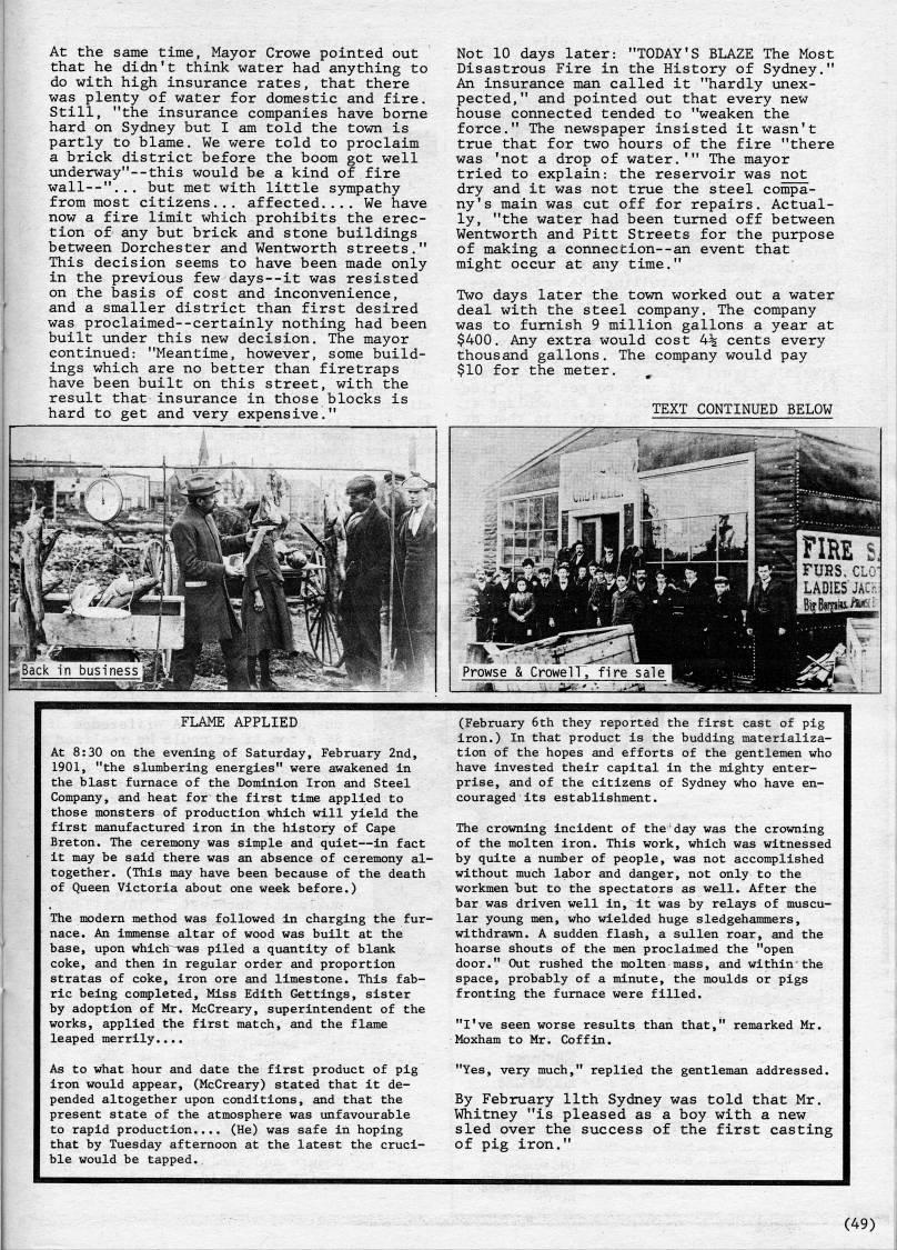 Published by Ronald Caplan on 1985/6/1 (199 reads)At the same time, Mayor Crowe pointed out that he didn't think water had anything to do with high insurance rates, that there was plenty of water for domestic and fire. Still, "the insurance companies have borne hard on Sydney but I am told the town is partly to blame. We were told to proclaim a brick district before the boom got well underway"--this would be a kind of fire wall--"... but met with little sympathy from most citizens... affected.... We have now a fire limit which prohibits the erec? tion of any but brick and stone buildings between Dorchester and Wentworth streets." This decision seems to have been made only in the previous few days--it was resisted on the basis of cost and inconvenience, and a smaller district than first desired was proclaimed--certainly nothing had been built under this new decision. The mayor continued: "Meantime, however, some build? ings which are no better than firetraps have been built on this street, with the result that insurance in those blocks is hard to get and very expensive." Not 10 days later: "TODAY'S BLAZE The Most Disastrous Fire in the History of Sydney." An insurance man called it "hardly unex? pected," and pointed out that every new house connected tended to "weaken the force." The newspaper insisted it wasn't true that for two hours of the fire "there was 'not a drop of water.'" The mayor tried to explain: the reservoir was not dry and it was not true the steel compa? ny's main was cut off for repairs. Actual? ly, "the water had been turned off between Wentworth and Pitt Streets for the purpose of making a connection--an event that might occur at any time." Two days later the town worked out a water deal with the steel company. The company was to furnish 9 million gallons a year at $400. Any extra would cost 4% cents every thousand gallons. The company would pay $10 for the meter. TEXT CONTINUED BELOW At 8:30 on the evening of Saturday, February 2nd, 1901, "the slumbering energies" were awakened in the blast furnace of the Dominion Iron and Steel Company, and heat for the first time applied to those monsters of production which will yield the first manufactured iron in the history of Cape Breton. The ceremony was simple and quiet • in fact it may be said there was an absence of ceremony al? together. (This may have been because of the death of Queen Victoria about one week before.) The modem method was followed in charging the fur? nace. An immense altar of wood was built at the base, upon which~was piled a quantity of blank coke, and then in regular order and proportion stratas of coke, iron ore and limestone. This fab? ric being completed. Miss Edith Gettings, sister by adoption of Mr. McCreary, superintendent of the works, applied the first match, and the flame leaped merrily.... As to what hour and date the first product of pig iron would appear, (McCreary) stated that it de? pended altogether upon conditions, and that the present state of the atmosphere was unfavourable to rapid production.... (He) was safe in hoping that by Tuesday afternoon at the latest the cruci? ble would be tapped. (February 6th they reported the first cast of pig iron.) In that product is the budding materializa? tion of the hopes and efforts of the gentlemen who have invested their capital in the mighty enter? prise, and of the citizens of Sydney who have en? couraged its establishment. The crowning incident of the day was the crowning of the molten iron. This work, which was witnessed by quite a number of people, was not accomplished without much labor and danger, not only to the workmen but to the spectators as well. After the bar was driven well in, it was by relays of muscu? lar young men, who wielded huge sledgehammers, withdrawn. A sudden flash, a sullen roar, and the hoarse shouts of the men proclaimed the "open door." Out rushed the molten mass, and within the space, probably of a minute, the moulds or pigs fronting the furnace were filled. "I've seen worse results than that," Moxham to Mr. Coffin. remarked Mr. "Yes, very much," replied the gentleman addressed. By February 11th Sydney was told that Mr. Whitney "is pleased as a boy with a new sled over the success of the first casting of pig iron." (49)