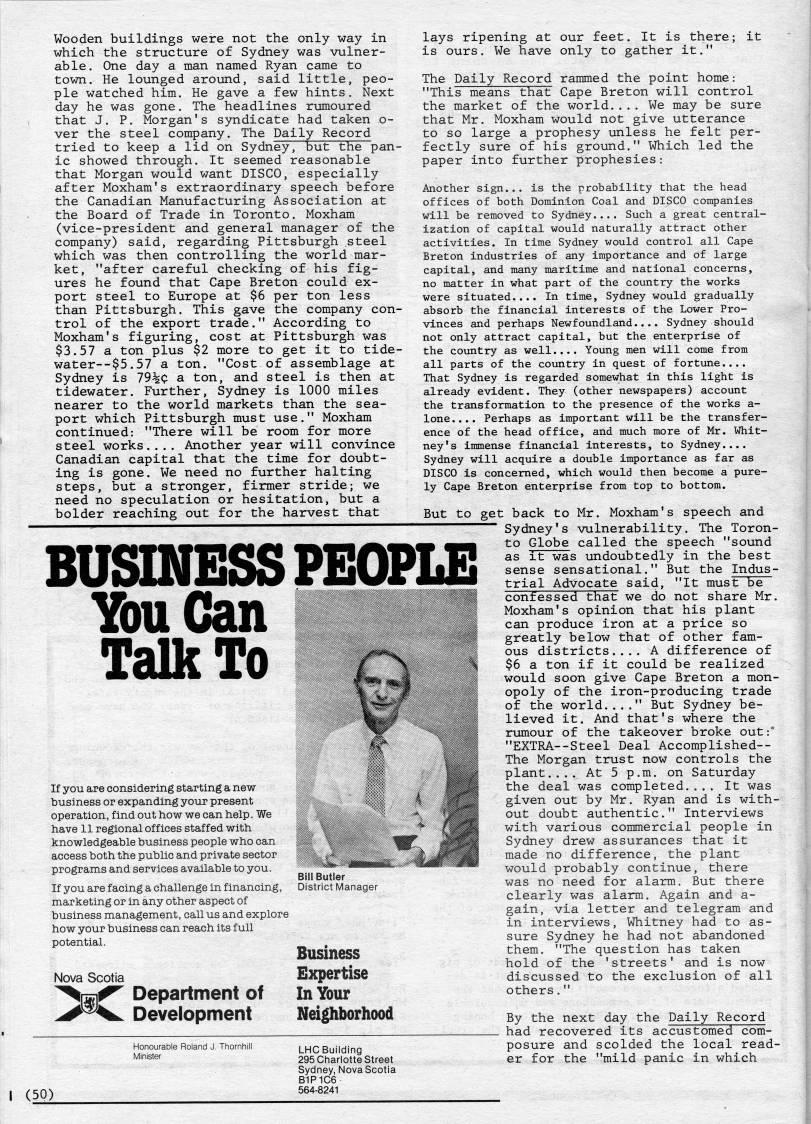 Published by Ronald Caplan on 1985/6/1 (199 reads)Wooden buildings were not the only way in which the structure of Sydney was vulner? able. One day a man named Ryan came to town. He lounged around, said little, peo? ple watched him. He gave a few hints. Next day he was gone. The headlines rumoured that J. P. Morgan's syndicate had taken o- ver the steel company. The Daily Record tried to keep a lid on Sydney, but the pan- ic showed through. It seemed reasonable that Morgan would want DISCO, especially after Moxham's extraordinary speech before the Canadian Manufacturing Association at the Board of Trade in Toronto. Moxham (vice-president and general manager of the company) said, regarding Pittsburgh steel which was then controlling the world mar? ket, "after careful checking of his fig? ures he found that Cape Breton could ex? port steel to Europe at $6 per ton less than Pittsburgh. This gave the company con? trol of the export trade." According to Moxham's figuring, cost at Pittsburgh was $3.57 a ton plus $2 more to get it to tide- water--$5.57 a ton. "Cost of assemblage at Sydney is 79%C a ton, and steel is then at tidewater. Further, Sydney is 1000 miles nearer to the world markets than the sea? port which Pittsburgh must use." Moxham continued: "There will be room for more steel works.... Another year will convince Canadian capital that the time for doubt? ing is gone. We need no further halting steps, but a stronger, firmer stride; we need no speculation or hesitation, but a bolder reaching out for the harvest that BUSINESS PEOPLE You Can Talk To If you are considering starting a new business or expanding your present operation, find out how we can help. We have 11 regional offices staffed with knowledgeable business people who can access both the public and private sector programs and services available to you. If you are facing a challenge in financing, marketing or in any other aspect of business management, call us and explore how your business can reach its full potential. Nova Scotia "'r'' Department of ''' Development Bill Butler District Manager Business Expertise In Your Neighborhood (50) LHC Building 295 Cliarlctte Street Sydney, NovaScotia B1P1G6 564-8241 lays ripening at our feet. It is there; it is ours. We have only to gather it." The Daily Record rammed the point home: "This means that Cape Breton will control the market of the world.... We may be sure that Mr. Moxham would not give utterance to so large a prophesy unless he felt per? fectly sure of his ground." Which led the paper into further prophesies: Another sign... is the probability that the head offices of both Dominion Coal and DISCO companies will be removed to Sydney.... Such a great central? ization of capital would naturally attract other activities. In time Sydney would control all Cape Breton industries of any importance and of large capital, and many maritime and national concerns, no matter in what part of the country the works were situated.... In time, Sydney would gradually absorb the financial interests of the Lower Pro? vinces and perhaps Newfoundland.... Sydney should not only attract capital, but the enterprise of the country as well.... Young men will come from all parts of the country in quest of fortune.... That Sydney is regarded somewhat in this light is already evident. They (other newspapers) account the transformation to the presence of the works a- lone.... Perhaps as important will be the transfer? ence of the head office, and much more of Mr. Whit? ney's immense financial interests, to Sydney.... Sydney will acquire a double importance as far as DISCO is concerned, which would then become a pure? ly Cape Breton enterprise from top to bottom. But to get back to Mr. Moxham's speech and Sydney's vulnerability. The Toron? to Globe called the speech "sound as It was undoubtedly in the best sense sensational." But the Indus- trial Advocate said, "It must be confessed that we do not share Mr. Moxham's opinion that his plant can produce iron at a price so greatly below that of other fam? ous districts.... A difference of $6 a ton if it could be realized would soon give Cape Breton a mon? opoly of the iron-producing trade of the world...." But Sydney be? lieved it. And that's where the rumour of the takeover broke out:' "EXTRA--Steel Deal Accomplished-- The Morgan trust now controls the plant.... At 5 p.m. on Saturday the deal was completed.... It was given out by Mr. Ryan and is with? out doubt authentic." Interviews with various commercial people in Sydney drew assurances that it made no difference, the plant would probably continue, there was no need for alarm. But there clearly was alarm. Again and a- gain, via letter and telegram and in interviews, Whitney had to as? sure Sydney he had not abandoned them. "The question has taken hold of the 'streets' and is now discussed to the exclusion of all others." By the next day the Daily Record had recovered its accustomed com- posure and scolded the local read? er for the "mild panic in which