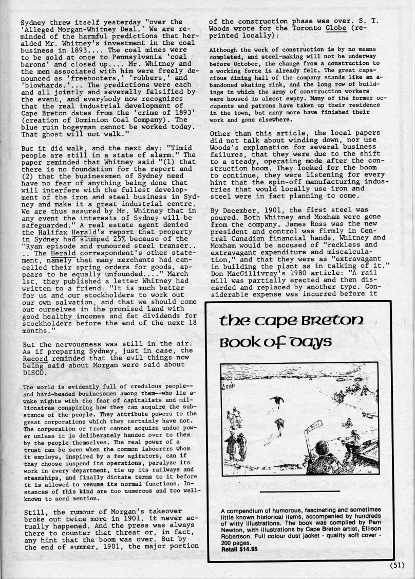 Published by Ronald Caplan on 1985/6/1 (169 reads)Sydney threw itself yesterday "over the 'Alleged Morgan-Whitney Deal.' We are re? minded of the harmful predictions that her? alded Mr. Whitney's investment in the coal business in 1893.... The coal mines were to be sold at once to Pennsylvania 'coal barons' and closed up.... Mr. Whitney and the men associated with him were freely de? nounced as 'freebooters,' 'robbers,' and 'blowhards.'... The predictions were each and all jointly and severally falsified by the event, and everybody now recognizes that the real industrial development of Cape Breton dates from the 'crime of 1893' (creation of Dominion Coal Company). The blue ruin bogeyman cannot be worked today. That ghost will not walk." But it did walk, and the next day: "Timid people are still in a state of alarm." The paper reminded that Whitney said "(1) that there is no foundation for the report and (2) that the businessmen of Sydney need have no fear of anything being done that will interfere with the fullest develop? ment of the iron and steel business in Syd? ney and make it a great industrial centre. We are thus assured by Mr. Whitney that in any event the interests of Sydney will be safeguarded." A real estate agent denied the Halifax Herald's report that property in Sydney had sliomped 25% because of the "Ryan episode and rumoured steel transer.. .. The Herald correspondent's other state? ment, namely that many merchants had can? celled their spring orders for goods, ap? pears to be equally unfounded...." March 1st, they published a letter Whitney had written to a friend: "It is much better for us and our stockholders to work out our own salvation, and that we should come out ourselves in the promised land with good healthy incomes and fat dividends for stockholders before the end of the next 18 months." But the nervousness was still in the air. As if preparing Sydney, just in case, the Record reminded that the evil things now being said about Morgan were said about DISCO. The world is evidently full of credulous people • ?? and hard-headed businessmen among them • who lie a- wake nights with the fear of capitalists and mil? lionaires conspiring how they can acquire the sub? stance of the people. They attribute powers to the great corporations which they certainly have not. The corporation or trust cannot acquire undue pow? er unless it is deliberately handed over to them by the people themselves. The real power of a trust can be seen when the common labourers whom it employs, inspired by a few agitators, can if they choose suspend its operations, paralyze its work in every department, tie up its railways and steamships, and finally dictate terms to it before it is allowed to resume its normal functions. In? stances of this kind are too numerous and too well- known to need mention. Still, the ramour of Morgan's takeover broke out twice more in 1901. It never ac? tually happened. And the press was always there to counter that threat or, in fact, any hint that the boom was over. But by the end of summer, 1901, the major portion of the construction phase was over. S. T. Woods wrote for the Toronto Globe (re? printed locally): Although the work of construction is by no means completed, and steel-making will not be xinderway before October, the change from a construction to a working force is already felt. The great capa? cious dining hall of the company stands like an a- bandoned skating rink, and the long row of build? ings in which the army of construction workers were housed is almost empty. Many of the former oc? cupants and patrons have taken up their residence in the town, but many more have finished their work and gone elsewhere. Other than this article, the local papers did not talk about winding down, nor use Woods's explanation for several business failures, that they were due to the shift to a steady, operating mode after the con? struction boom. They looked for the boom to continue, they were listening for every hint that the spin-off manufacturing indus? tries that would locally use iron and steel were in fact planning to come. By December, 1901, the first steel was poured. Both Whitney and Moxham were gone . from the company. James Ross was the new president and control was firmly in Cen? tral Canadian financial hands. Whitney and Moxham would be accused of "reckless and extravagant expenditure and miscalcula? tion," and that they were as "extravagant in building the plant as in talking of it." Don MacGillivray's 1980 article: "A rail mill was partially erected and then dis? carded and replaced by another type. Con? siderable expense was incurred before it tbe cape Brz&Con; BooicofXDoys 'x-' ' s '"' A compendium of humorous, fascinating and sometimes little known historical items, accompanied by hundreds of witty illustrations. The book was compiled by Pam Newton, with illustrations by Cape Breton artist, Ellison Robertson. Full colour dust jacket - quality soft cover - 200 pages. Retail $14.95 (51)