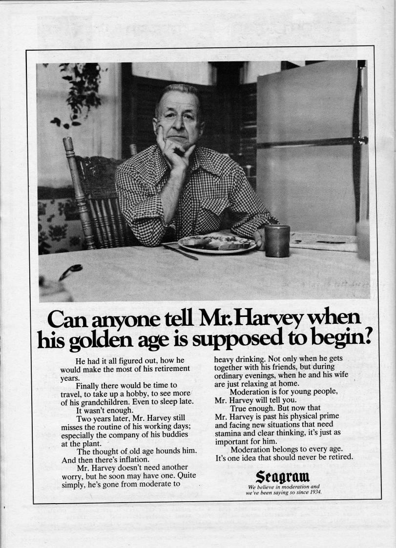 Published by Ronald Caplan on 1985/6/1 (253 reads)He had it all figured out, how he would make the most of his retirement years. Finally there would be time to travel, to take up a hobby, to see more of his grandchildren. Even to sleep late. It wasn't enough. Two years later, Mr. Harvey still misses the routine of his working days; especially the company of his buddies at the plant. The thought of old age hounds him. And then there's inflation. Mr, Harvey doesn't need another worry, but he soon may have one. Quite simply, he's gone from moderate to heavy drinking. Not only when he gets together with his friends, but during ordinary evenings, when he and his wife are just relaxing at home. Moderation is for young people, Mr. Harvey will tell you. True enough. But now that Mr. Harvey is past his physical prime and facing new situations that need stamina and clear thinking, it's just as important for him. Moderation belongs to every age. It's one idea that should never be retired. Seaaram We believe in moderation and we 've been saying so since 1934.