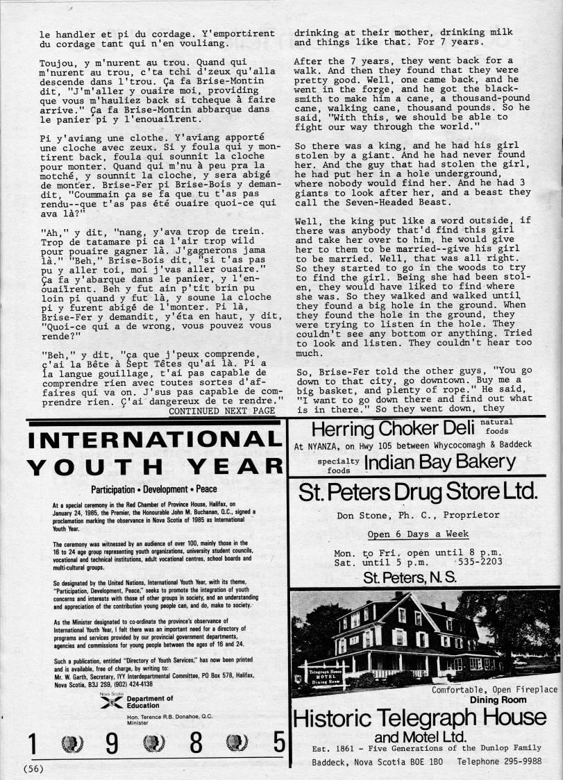 Published by Ronald Caplan on 1985/6/1 (300 reads)le handler et pi du cordage. Y'emportirent du cordage tant qui n'en vouliang. Toujou, y m'nurent au trou. Quand qui m'nurent au trou, c'ta tchi d'zeux qu'alla descende dans I'trou. Qa. fa Brise-Montin dit, "J'm'aller y ouaire moi, providing que vous m'hauliez back si tcheque a faire arrive." Ca fa Brise-Montin abbarque dans le panier'pi y 1'enouailrent. Pi y'aviang une clothe. Y'aviang apporte une cloche avec zeux. Si y foula qui y mon- tirent back, foula qui sounnit la cloche pour monter. Quand qui m'nu a peu pra la motche, y sounnit la cloche, y sera abige de monter. Brise-Fer pi Brise-Bois y deman- dit, "Coummain ca se fa que tu t'as pas rendu--que t'as'pas ete ouaire quoi-ce qui ava la?" "Ah," y dit, "nang, y'ava trop de trein. Trop de tatamare pi ca I'air trop wild pour pouaire gagner la. J'gagnerons jama la." "Beh," Brise-Bois dit, "si t'as pas pu y aller toi, moi j'vas aller ouaire." Ca fa y'abarque dans le panier, y 1'en? ouailrent . Beh y fut ain p'tit brin pu loin pi quand y fut la, y soune la cloche pi y furent abige de 1'monter. Pi la, Brise-Fer y demandit, y'eta en haut, y dit, "Quoi-ce qui a de wrong, vous pouvez vous rende?" "Beh," y dit, "ca que j'peux comprende, c'ai la Bete a ??ept Tetes qu'ai la. Pi a ia langue gouillage, t'ai pas capable de comprendre rien avec toutes sortes d'af? faires qui va on. J'sus pas capable de com? prendre rien. C'ai dangereux de te rendre." CONTINUED NEXT PAGE drinking at their mother, drinking milk and things like that. For 7 years. After the 7 years, they went back for a walk. And then they found that they were pretty good. Well, one came back, and he went in the forge, and he got the black? smith to make him a cane, a thousand-pound cane, walking cane, thousand pounds. So he said, "With this, we should be able to fight our way through the world." So there was a king, and he had his girl stolen by a giant. And he had never found her. And the guy that had stolen the girl, he had put her in a hole underground, where nobody would find her. And he had 3 giants to look after her, and a beast they call the Seven-Headed Beast. Well, the king put like a word outside, if there was anybody that'd find this girl and take her over to him, he would give her to them to be married--give his girl to be married. Well, that was all right. So they started to go in the woods to try to find the girl. Being she had been stol? en, they would have liked to find where she was. So they walked and walked imtil they found a big hole in the ground. When they found the hole in the ground, they were trying to listen in the hole. They couldn't see any bottom or anything. Tried to look and listen. They couldn't hear too much. So, Brise-Fer told the other guys, "You go down to that city, go downtown. Buy me a big basket, and plenty of rope." He said, "I want to go down there and find out what is in there." So they went down, they INTERNATIONAL YO U T H YEAR Participation • Development • Peace At a special ceremony in the Red Chamber of Province House, Halifax, on January 24, 1985, the Premier, the Honourable John M. Buchanan, Q.C., signed a proclamation marking the observance in Nova Scotia of 1985 as International The ceremony was witnessed by an audience of over 100, mainly those in the 16 to 24 age group representing youth organizations, university student councils, vocational and technical institutions, adult vocational centres, school boards and multi-cultural groups. So designated by the United Nations, International Youth Year, with its theme, "Participation, Development, Peace," seeks to promote the integration of youth concerns and interests with those of other groups in society, and an understanding and appreciation of the contribution young people can, and do, make to society. As the Minister designated to co-ordinate the province's observance of International Youth Year, I felt there was an important need for a directory of programs and services provided by our provincial government departments, agencies and commissions for young people between the ages of 16 and 24. Such a publication, entitled "Directory of Youtfi Services," has now been printed and is available, free of charge, by writing to: Mr. W. Garth, Secretary, lYY Interdepartmental Committee, PO Box 578, Halifax, Nova Scotia, B3J 2S9, (902) 424-4138 Herring Choker Deli At NYANZA, on. Hwy 105 between Whycocomagh & Baddeck natural foods specialty foods Indian Bay Bakery St. Peters Drug Store Ltd. Don Stone, Ph. C, Proprietor Open 6 Days a Week Mon. to Fri. open until 8 p.m. Sat. until 5 p.m. 535-2203 St Peters, N.S. >CI 9 ? 8 (56) Comfortable, Open Fireplace Dining Room Historic Telegraph House and Motel Ltd. Est. 1861 - Five Generations of the Dunlop Family Baddeck, Nova Scotia BOE IBO Telephone 295-9988