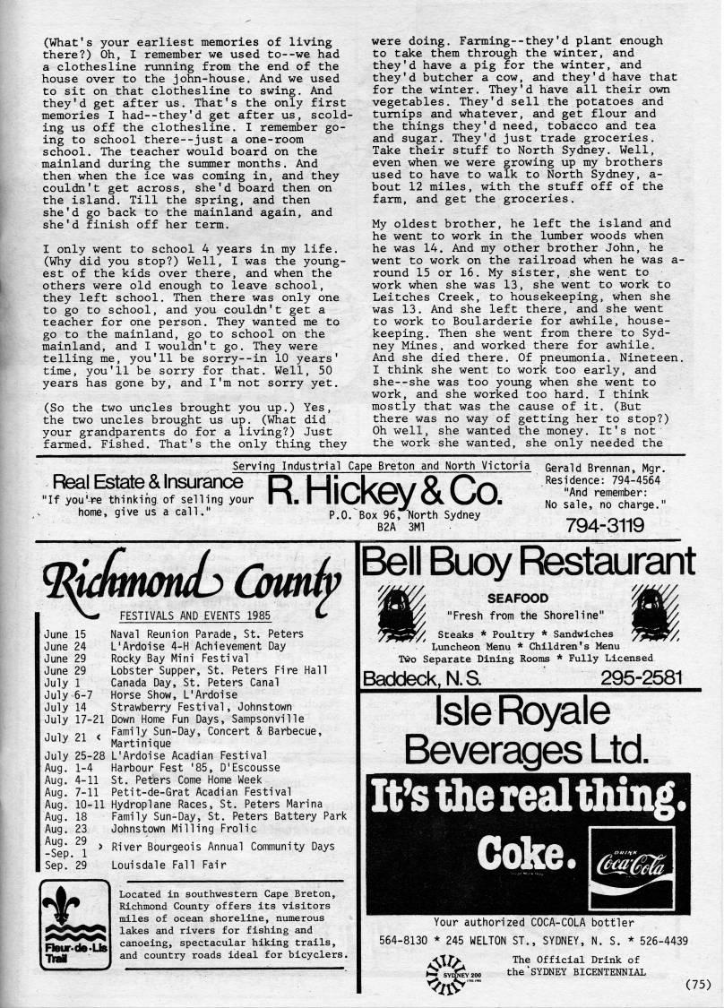 (What's your earliest memories of living there?) Oh, I remember we used to--we had a clothesline running from the end of the house over to the john-house. And we used to sit on that clothesline to swing. And they'd get after us. That's the only first memories I had--they'd get after us, scold? ing us off the clothesline. I remember go? ing to school there--just a one-room school. The teacher would board on the mainland during the summer months. And then when the ice was coming in, and they couldn't get across, she'd board then on the island. Till the spring, and then she'd go back to the mainland again, and she'd finish off her term. I only went to school 4 years in my life. (Why did you stop?) Well, I was the young? est of the kids over there, and when the others were old enough to leave school, they left school. Then there was only one to go to school, and you couldn't get a teacher for one person. They wanted me to go to the mainland, go to school on the mainland, and I wouldn't go. They were telling me, you'll be sorry--in 10 years' time, you'll be sorry for that. Well, 50 years has gone by, and I'm not sorry yet. (So the two uncles brought you up.) Yes, the t:wo uncles brought us up. (What did your grandparents do for a living?) Just farmed. Fished. That's the only thing they were doing. Farming--they'd plant enough to take them through the winter, and they'd have a pig for the winter, and they'd butcher a cow, and they'd have that for the winter. They'd have all their own vegetables. They'd sell the potatoes and turnips and whatever, and get flour and the things they'd need, tobacco and tea and sugar. They'd just trade groceries. Take their stuff to North Sydney. Well, even when we were growing up my brothers used to have to walk to North Sydney, a- bout 12 miles, with the stuff off of the farm, and get the groceries. My oldest brother, he left the island and he went to work in the lumber woods when he was 14. And my other brother John, he went to work on the railroad when he was a- round 15 or 16. My sister, she went to work when she was 13, she went to work to Leitches Creek, to housekeeping, when she was 13. And she left there, and she went to work to Boularderie for awhile, house? keeping. Then she went from there to Syd? ney Mines, and worked there for awhile. And she died there. Of pneumonia. Nineteen. I think she went to work too early, and she--she was too young when she went to work, and she worked too hard. I think mostly that was the cause of it. (But there was no way of getting her to stop?) Oh well, she wanted the money. It's not the work she wanted, she only needed the Serving Industrial Cape Breton and North Victoria Real Estate & Insurance ~~ "If you''pe thinking of selling your home, give us a call." R.Hickey&Co.; P.O. Box 96, B2A 'North Sydney 3M1 Gerald Brennan, Mgr, Residence: 794-4564 "And remember: No sale, no charge." 794-3119 m0 FESTIVALS AND EVENTS 1985 C June June ; June : June ; July July I July July July ; July Aug. Aug. Aug. Aug. Aug. Aug. Aug. -Sep. Sep. FESTIVALS AND Naval Reunion Parade, St. Peters L'Ardoise 4-H Achievement Day Rocky Bay Mini Festival Lobster Supper, St. Peters Fire Hall Canada Day, St. Peters Canal Horse Show, L'Ardoise Strawberry Festival, Johnstown Down Home Fun Days, Sampsonville Family Sun-Day, Concert & Barbecue, Martinique ' L'Ardoise Acadian Festival Harbour Fest '85, D'Escousse St. Peters Come Home Week Petit-de-Grat Acadian Festival Hydroplane Races, St. Peters Marina Family Sun-Day, St. Peters Battery Park Johnstown Milling Frolic River Bourgeois Annual Community Days Louisdale Fall Fair Located in southwestern Cape Breton, Richmond County offers its visitors miles of ocean shoreline, numerous lakes and rivers for fishing and canoeing, spectacular hiking trails, and country roads ideal for bicyclers. Bell Buoy Restaurant SEAFOOD "Fresh from the Shoreline" ' Steaks * Poultry * Sandwiches Luncheon Menu * Children's Menu Two Separate Dining Rooms * Fully Licensed Baddeck, N. a 295-2581 Isle Royale Beverages Ltd. It's the realfhmg. Cote. &ia;' Your authorized COCA-COLA bottler 564-8130 * 245 WELTON ST., SYDNEY, N. S. * 526-4439 P' SYHNEYS The Official Drink of the'SYDNEY BICENTENNIAL (75)