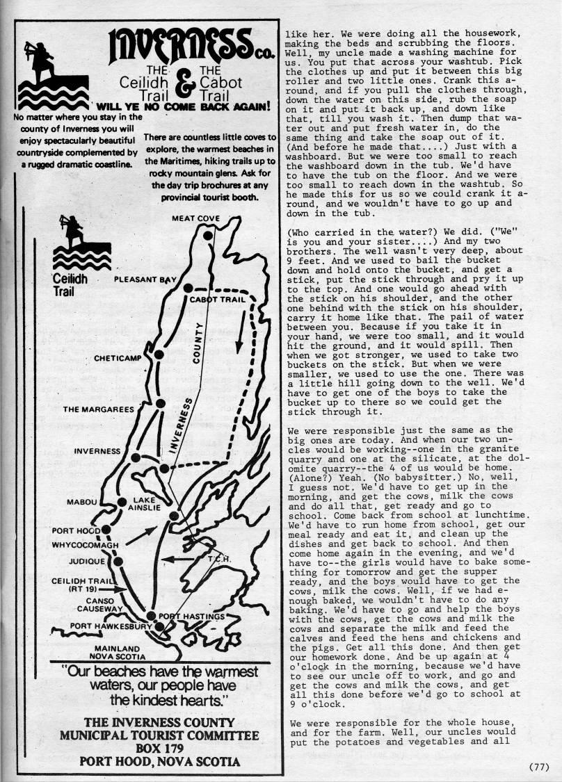 THE A THE Ceilidh XL Cabot Trail ''Trail WILL YE NO COME BACK AOAINI No matter where you stay in the county of Inverness you will enjoy spectacularly beautiful ''?' '''' countless little coves to | countryside con>plemented by explore, the warmest beaches in a rugged dramatic coastline, ''e Maritimes. hiking trails up to rocky mountain glens. Ask for the day trip brochures at any provincial tourist booth. "CXir beadles have th' vyarmest >A/aters, our people have the kindest hearts." THE INVERNESS COUNTY MUNICIPAL TOURIST COMMITTEE BOX 179 PORT HOOD, NOVA SCOTIA like her. We were doing all the housework, making the beds and scrubbing the floors. Well, my uncle made a washing machine for us. You put that across your washtub. Pick the clothes up and put it between this big roller and two little ones. Crank this a- round, and if you pull the clothes through, down the water on this side, rub the soap on it and put it back up, and down like that, till you wash it. Then dxaap that wa? ter out and put fresh water in, do the same thing and take the soap out of it. (And before he made that....) Just with a washboard. But we were too small to reach the washboard down in the tub. We'd have to have the tub on the floor. And we were too small to reach down in the washtub. So he made this for us so we could crank it a- round, and we wouldn't have to go up and down in the tub. (Who carried in the, water?) We did. ("We" is you and your sister....) And my two brothers. The well wasn't very deep, about 9 feet. And we used to bail the bucket down and hold onto the bucket, and get a stick, put the stick through and pry it up to the top. And one would go ahead with the stick on his shoulder, and the other one behind with the stick on his shoulder, carry it home like that. The pail of water between you. Because if you take it in your hand, we were too small, and it would hit the ground, and it would spill. Then when we got stronger, we used to take two buckets on the stick. But when we were smaller, we used to use the one. There was a little hill going down to the well. We'd have to get one of the boys to take the bucket up to there so we could get the stick through it. We were responsible just the same as the big ones are today. And when our two un? cles would be working--one in the granite quarry and one at the silicate, at the dol? omite quarry--the 4 of us would be home. (Alone?) Yeah. (No babysitter.) No, well, I guess not. We'd have to get up in the morning, and get the cows, milk the cows and do all that, get ready and go to school. Come back from school at lunchtime. We'd have to run home from school, get our meal ready and eat it, and clean up the dishes and get back to school. And then come home again in the evening, and we'd have to--the girls would have to bake some? thing for tomorrow and get the supper ready, and the boys would have to get the cows, milk the cows. Well, if we had e- nough baked, we wouldn't have to do any baking. We'd have to go and help the boys with the cows, get the cows and milk the cows and separate the milk and feed the calves and feed the hens and chickens and the pigs. Get all this done. And then get our homework done. And be up again at 4 o'clock in the morning, because we'd have to see our uncle off to work, and go and get the cows and milk the cows, and get all this done before we'd go to school at 9 o'clock. We were responsible for the whole house, and for the farm. Well, our uncles would put the potatoes and vegetables and all (77)