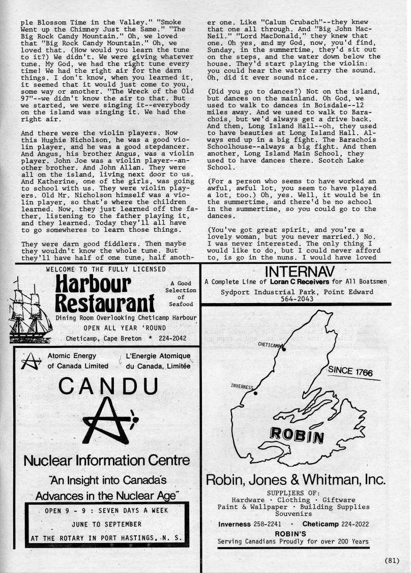 pie Blossom Time in the Valley." "Smoke Went up the Chimney Just the Same." "The Big Rock Candy Mountain." Oh, we loved that "Big Rock Candy Mountain." Oh, we loved that. (How would you learn the tune to it?) We didn't. We were giving whatever tune. My God, we had the right tune every time! We had the right air for the dam things. I don't know, when you learned it, it seemed that it would just come to you, some way or another, "The Wreck of the Old 97"--we didn't know the air to that. But we started, we were singing it--everybody on the island was singing it. We had the right air. And there were the violin players. Now this Hughie Nicholson, he was a good vio? lin player, and he was a good stepdancer. And Angus, his brother Angus, was a violin player. John Joe was a violin player--an? other brother. And John Allan. They were all on the island, living next door to us. And Katherine, one of the girls, was going to school with us. They were violin play? ers. Old Mr. Nicholson himself was a vio? lin player, so that's where the children learned. Now, they just learned off the fa? ther, listening to the father playing it, and they learned. Today they'll all have to go somewheres to learn those things. They were dam good fiddlers. Then maybe they wouldn't know the whole tune. But they'll have half of one tune, half anoth? er one. Like "Calum Crubach"--they knew that one all through. And "Big John Mac? Neil," "Lord MacDonald," they knew that one. Oh yes, and my God, now, you'd find, Sunday, in the sijmmertime, they'd sit out on the steps, and the water down below the house. They'd start playing the violin: you could hear the water carry the sound. Oh, did it ever sound nice. (Did you go to dances?) Not on the island, but dances on the mainland. Oh God, we used to walk to dances in Boisdale--12 miles away. And we used to walk to Bara? chois, but we'd always get a drive back. And then. Long Island Hall--oh, they used to have beauties at Long Island Hall. Al? ways end up in a big fight. The Barachois Schoolhouse--always a big fight. And then another. Long Island Main School, they used to have dances there. Scotch Lake School. (For a person who seems to have worked an awful, awful lot, you seem to have played a lot, too.) Oh, yes. Well, it would be in the summertime, and there'd be no school in the summertime, so you could go to the dances. (You've got great spirit, and you're a lovely woman, but you never married.) No. I was never interested. The only thing I would like to do, but I could never afford to, is go in the nuns. I would have loved WELCOME TO THE FULLY LICENSED Harbour Restaurant A Good Selection of Seafood ng Room Overlooking Cheticamp Harbour OPEN ALL YEAR 'ROUND Cheticamp, Cape Breton * 224-2042 j'" Atomic Energy , L'Energie Atomique Canada Limited du Canada, Limitde CANDU A' Nuclear Information Centre "An Insight into Canada's Advances in the Nuclear Age'' . OPEN 9-9 : SEVEN DAYS A WEEK JUNE TO SEPTEMBER lAT THE ROTARY IN PORT HASTINGS, N. S. I INTERNAV A Complete Line of Loran0Receivers for All Boatsmen Sydport Industrial Park, Point Edward 564-2043 CHETlCAMf INVERNESS Robin, Jones & Whitman, Inc. SUPPLIERS OF: Hardware • Clothing • Giftware Paint 6c Wallpaper ?? Building Supplies Souvenirs Inverness 258-2241 ?? Cheticamp 224-2022 ROBIN'S Serving Canadians Proudly for over 200 Years (81)