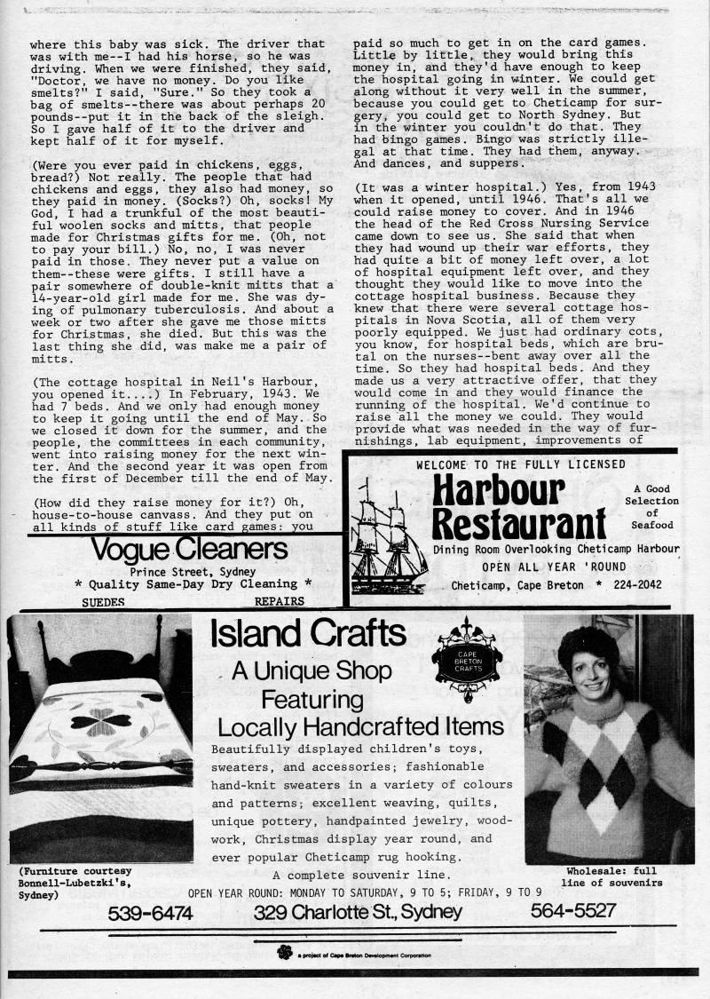 where this baby was sick. The driver that was with me--I had his horse, so he was driving. When we were finished, they said, "Doctor, we have no money. Do you like smelts?" I said, "Sure." So they took a bag of smelts--there was about perhaps 20 pounds--put it in the back of the sleigh. So I gave half of it to the driver and kept half of it for myself. (Were you ever paid in chickens, eggs, bread?) Not really. The people that had chickens and eggs, they also had money, so they paid in money. (Socks?) Oh, socks! My God, I had a trunkful of the most beauti? ful woolen socks and mitts, that people made for Christmas gifts for me. (Oh, not to pay your bill.) No, no, I was never paid in those. They never put a value on them--these were gifts. I still have a pair somewhere of double-knit mitts that a 14-year-old girl made for me. She was dy? ing of pulmonary tuberculosis. And about a week or two after she gave me those mitts for Christmas, she died. But this was the last thing she did, was make me a pair of mitts. (The cottage hospital in Neil's Harbour, you opened it.,..) In February, 1943. We had 7 beds. And we only had enough money to keep it going until the end of May. So we closed it down for the summer, and the people, the committees in each community, went into raising money for the next win? ter. And the second year it was open from the first of December till the end of May. (How did they raise money for it?) Oh, house-to-house canvass. And they put on all kinds of stuff like card games: you paid so much to get in on the card games. Littl-e by little, they would bring this money in, and they'd have enough to keep the hospital going in winter. We could get along without it very well in the summer, because you could get to Cheticamp for sur? gery, you could get to North Sydney. But in the winter you couldn't do that. They had bingo games. Bingo was strictly ille? gal at that time. They had them, anyway. And dances, and suppers 1 (It was a winter hospital.) Yes, from 1943 when it opened, until 1946. That's all we could raise money to cover. And in 1946 the head of the Red Cross Nursing Service came down to see us. She said that when they had wound up their war efforts, they had quite a bit of money left over, a lot of hospital equipment left over, and they thought they would like to move into the cottage hospital business. Because they knew that there were several cottage hos? pitals in Nova Scotia, all of them very poorly equipped. We just had ordinary cots, you know, for hospital beds, which are bru? tal on the nurses--bent away over all the time. So they had hospital beds. And they made us a very attractive offer, that they would come in and they would finance the running of the hospital. We'd continue to raise all the money we could. They would provide what was needed in the way of fur? nishings, lab equipment, improvements of Vogue Gleaners Prince Street, Sydney * Quality Same-Day Dry Cleaning * SUEDES REPAIRS WELCOME TO THE FULLY LICENSED Harbour Restaurant A Good Selection of Seafood Dining Room Overlooking Cheticamp Harbour OPEN ALL YEAR 'ROUND . Cheticamp, Cape Breton * 224-2042 (Furniture courtesy Bonnell-Lubetzkl* s, Sydney) Island Crafts - A Unique Shop Featuring Locally Handcrafted Items Beautifully displayed children's toys, sweaters, and accessories; fashionable hand-knit sweaters in a variety of colours and patterns; excellent weaving, quilts, unique pottery, handpainted jewelry, wood? work, Christmas display year round, and ever popular Cheticamp rug hooking. A complete souvenir line. OPEN YEAR ROUND: MONDAY TO SATURDAY, 9 TO 5; FRIDAY, 9 TO 9 Wholesale: full line of souvenirs 539-6474 329 Charlotte St, Sydney 564-5527 a preiwt of Cap* Braun Owalopmant CorponMon