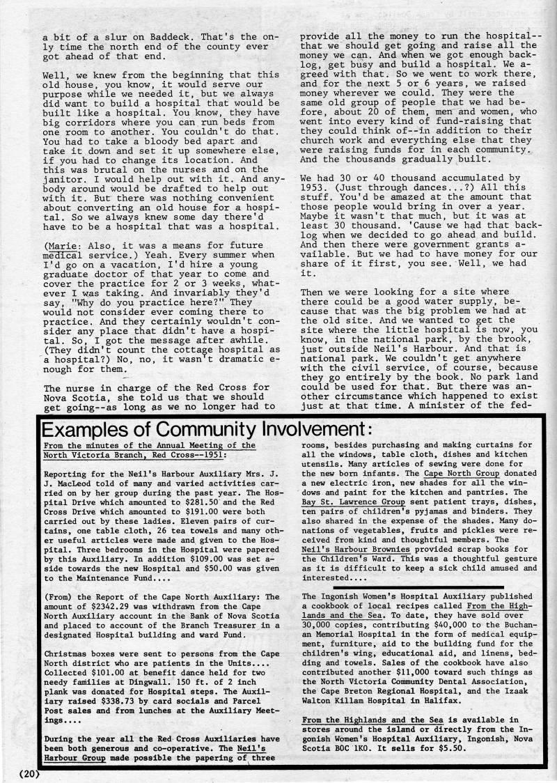 a bit of a slur on Baddeck. That's the on? ly time the north end of the county ever got ahead of that end. Well, we knew from the beginning that this old house, you know, it would serve our purpose while we needed it, but we always did want to build a hospital that would be built like a hospital. You know, they have big corridors where you can.run beds from one room to another. You couldn't do that. You had to take a bloody bed apart and take it down and set it up somewhere else, if you had to change its location. And this was brutal on the nurses and on the janitor. I would help out with it. And any? body around would be drafted to help out with it. But there was nothing convenient about converting an old house for a hospi? tal. So we always knew some day there'd have to be a hospital that was a hospital. (Marie: Also, it was a means for future medical service.) Yeah. Every summer when I'd go on a vacation, I'd hire a young graduate doctor of that year to come and cover the practice for 2 or 3 weeks, what? ever I was taking. And invariably they'd say, "Why do you practice here?" They would not consider ever coming there to practice. And they certainly wouldn't con? sider any place that didn't have a hospi? tal. So, I got the message after awhile. (They didn't count the cottage hospital as a hospital?) No, no, it wasn't dramatic e- nough for them. The nurse in charge of the Red Cross for Nova Scotia, she told us that we should get going--as long as we no longer had to provide all the money to run the hospital-- that we should get going and raise all the money we can. And when we got enough back? log, get busy and build a hospital. We a- greed with that. So we went to work there, and for the next 5 or 6 years, we raised money wherever we could. They were the same old group of people that we had be? fore, about 20 of them, men and women, who went into every kind of fund-raising that they could think of--in addition to their church work and everything else that they were raising funds for in each community. And the thousands gradually built. We had 30 or 40 thousand accumulated by 1953. (Just through dances...?) All this stuff. You'd be amazed at the amount that those people would bring in over a year. Maybe it wasn't that much, but it was at least 30 thousand. 'Cause we had that back? log when we decided to go ahead and build. And then there were government grants a- vailable. But we had to have money for our share of it first, you see. Well, we had it. Then we were looking for a site where there could be a good water supply, be? cause that was the big problem we had at the old site. And we wanted to get the site where the little hospital is now, you know, in the national park, by the brook, just outside Neil's Harbour. And that is national park. We couldn't get an5nArhere with the civil service, of course, because they go entirely by the book. No park land could be used for that. But there was an? other circumstance which happened to exist just at that time. A minister of the fed- Examples of Community Involvement: From the minutes of the Annual Meeting of the North Victoria Branch, Red Cross • 1951: Reporting for the Neil's Harbour Auxiliary Mrs. J. J. MacLeod told of many and varied activities car? ried on by her group during the past year. The Hos? pital Drive which amounted to $281.50 and the Red Cross Drive which amounted to $191.00 were both carried out by these ladies. Eleven pairs of cur? tains, one table cloth, 26 tea towels and many oth? er useful articles were made and given to the Hos? pital. Three bedrooms in the Hospital were papered by this Auxiliary. In addition $109.00 was set a- side towards the new Hospital and $50.00 was given to the Maintenance Fund.... (From) the Report of the Cape North Auxiliary: The amount of $2342.29 was withdrawn from the Cape North Auxiliary account in the Bank of Nova Scotia and placed to account of the Branch Treasurer in a designated Hospital building and ward Fund. Christmas boxes were sent to persons from the Cape North district who are patients in the Units.... Collected $101.00 at benefit dance held for two needy families at Dingwall. 150 ft. of 2 inch plank was donated for Hospital steps. The Auxil? iary raised $338.73 by card socials and Parcel Post sales and from lunches at the Auxiliary Meet? ings .... During the year all the Red Cross Auxiliaries have been both generous and co-operative. The Neil's Harbour Group made possible the papering of three rooms, besides purchasing and making curtains for all the windows, table cloth, dishes and kitchen utensils. Many articles of sewing were done for the new bom infants. The Cape North Group donated a new electric iron, new shades for all the win? dows and paint for the kitchen and pantries. The Bay St. Lawrence Group sent patient trays, dishes, ten pairs of children's pyjamas and binders. They also shared in the expense of the shades. Many do? nations of vegetables, fruits and pickles were re? ceived from kind and thoughtful members. The Neil's Harbour Brownies provided scrap books for the Children's Ward. This was a thoughtful gesture as it is difficult to keep a sick child amused and interested.... The Ingonish Women's Hospital Auxiliary published a cookbook of local recipes called From the High? lands and the Sea. To date, they have sold over 30,000 copies, contributing $40,000 to the Buchan? an Memorial Hospital in the form of medical equip? ment, furniture, aid to the building fund for the children's wing, educational aid, and linens, bed? ding and towels. Sales of the cookbook have also contributed another $11,000 toward such things as the North Victoria Community Dental Association, the Cape Breton Regional Hospital, and the Izaak Walton Killam Hospital in Halifax. From the Highlands and the Sea is available in stores around the island or directly from the In? gonish Women's Hospital Auxiliary, Ingonish, Nova Scotia BOC IKO. It sells for $5.50. (20 '