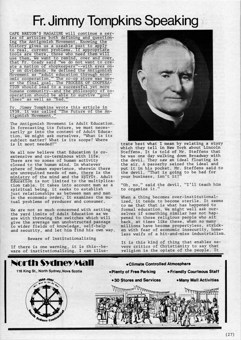 Fr. Jimmy Tompkins Speaking CAPE BRETON'S MAGAZINE will continue a ser? ies of articles both defining and question? ing the Antigonish Movement. Knowing the history gives us a useable past to apply to real, current problems. If appropriate tools are there, those who need them will use them. We want to remind, over and over, that Fr. Coady said "we do not want to cre? ate a nation of shopkeepers"--with eyes on? ly on dividends. He defined the Antigonish Movement as "adult education through econ? omic cooperation." The co-op store was nev? er the final goal. The PROCESS. OF COOPERA- TION should lead to a successful yet more Humane community--and the philosophy of co? operation should be able to survive "good" times" as well as "bad." ' Fr. Jimmy Tompkins wrote this article in 1938. It was called "The Future of the An? tigonish Movement." The Antigonish Movement is Adult Education. In forecasting its future, we must neces? sarily go into the content of Adult Educa? tion. We might ask ourselves, "What is its subject matter? What is its scope? Where is it most needed?" We all now believe that Education is co? extensive and co-terminous with life. There are no zones of human activity closed to the human mind. In whatever sphere of,human experience, wherein there are unrequited needs of man, there is the ministry of the mind and the spirit. Adult Education is not limited to the multiplica? tion table. It takes into account man as a spiritual being, it seeks to establish just relationships as between man and man in the economic order. It examines the mu? tual problems of producer and consumer. We are not so much concerned with setting the yard limits of Adult Education as we are with throwing the switches which will give the average man unobstructed passage to wider fields of knowledge, self-help and security, and let him find his own way. Beware of Institutionalizing If there is one warning, it is this--be? ware of institutionalizing • I can illus? trate best what I mean by relating a story which they tell in New York about Lincoln Steffens. It is told of Mr. Steffens that he was one day walking down Broadway with the devil. They saw an ideal floating in the air. A passerby seized the ideal and put it in his pocket. Mr. Steffens said to the devil, "That is going to be bad for your business, isn't it?" "Oh, no," said the devil, "I'll teach him to organize it." When a thing becomes over-institutional? ized, it tends to become sterile. It seems to me that that is what has happened to formal education. We might well ask our? selves if something similar has not hap? pened to those religious people who sit back, at times like these, when so many millions have become propertyless, strick? en with fear of economic insecurity, home? less waifs of a hit-and-miss industrialism. It is this kind of thing that enables se? vere critics of Christianity to say that religion is the opiate of the people. It Ncrth Sydney Mall 116 King St, North Sydney, Nova Scotia • Climate Controlled Atmosphere • Plenty of Free Parking • Friendly Courteous Staff • 30 Stores and Services • Many Mall Activities "??'VneyC'' (27)