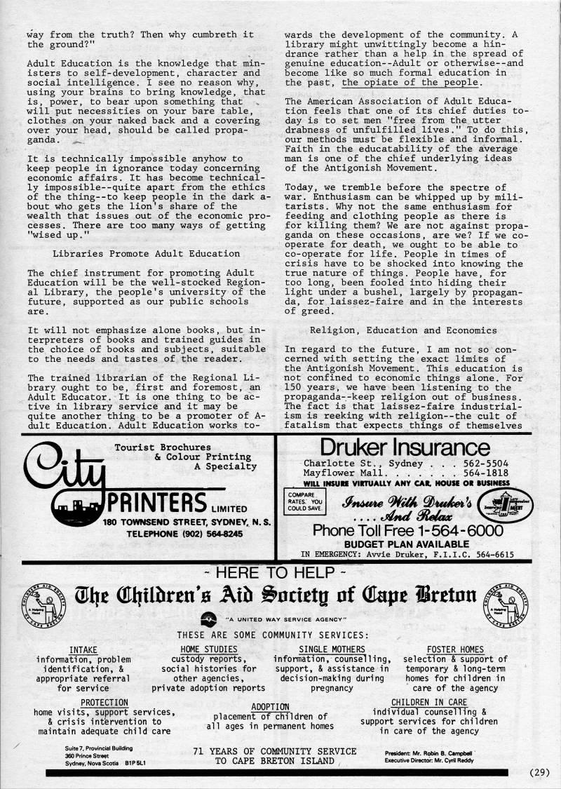Published by Ronald Caplan on 1985/8/1 (343 reads)way from the truth? Then why cumbreth it the ground?" Adult Education is the knowledge that min? isters to self-development, character and social intelligence. I see no reason why, using your brains to bring knowledge, that is, power, to bear upon something that will put necessities on your bare table, clothes on your naked back and a covering over your head, should be called propa? ganda. _ It is technically impossible anyhow to keep people in ignorance today concerning economic affairs. It has become technical? ly impossible--quite apart from the ethics of the thing--to keep people in the dark a- bout who gets the lion's share of the wealth that issues out of the economic pro? cesses. There are too many ways of getting "wised up." Libraries Promote Adult Education The chief instrument for promoting Adult Education will be the well-stocked Region? al Library, the people's university of the future, supported as our public schools It will not emphasize alone books, but in? terpreters of books and trained guides in the choice of books and subjects, suitable to the needs and tastes of the reader. The trained librarian of the Regional Li? brary ought to be, first and foremost, an Adult Educator. It is one thing to be ac? tive in library service and it may be quite another thing to be a promoter of A- dult Education. Adult Education works to? wards the development of the community. A library might unwittingly become a hin? drance rather than a help in the spread of genuine education--Adult or otherwise--and become like so much formal education in the past, the opiate of the people. The American Association of Adult Educa? tion feels that one of its chief duties to? day is to set men "free from the utter drabness of unfulfilled lives." To do this, our methods must be flexible and informal. Faith in the educatability of the average man is one of the chief underlying ideas of the Antigonish Movement. Today, we tremble before the spectre of war. Enthusiasm can be whipped up by mili? tarists. Why not the same enthusiasm for feeding and clothing people as there is for killing them? We are not against propa? ganda on these occasions, are we? If we co? operate for death, we ought to be able to co-operate for life. People in times of crisis have to be shocked into knowing the true nature of things. People have, for too long, been fooled into hiding their light under a bushel, largely by propagan? da, for laissez-faire and in the interests of greed. Religion, Education and Economics In regard to the future, I am not so con? cerned with setting the exact limits of the Antigonish Movement. This education is not confined to economic things alone. For 150 years, we have been listening to the propaganda • keep religion out of business. The fact is that laissez-faire industrial? ism is reeking with religion--the cult of fatalism that expects things of themselves Tourist Brochures & Colour Printing A Specialty PRINTERS LIMITED 180 TOWNSEND STREET, SYDNEY, N. S. TELEPHONE (902) 5644245 Druker Insurance Charlotte St., Sydney . . .562-5504 Mayflower Mall. ...... 564-1818 Will tNSUM VIRTUALLY ANY CAR, HOUSE OR BUSINESS COMPARE RATES.' YOU COULD SAVE. .... fj'nd 9te(ax Phone Toll Free 1-564-6000 BUDGET PLAN AVAILABLE IN EMERGENCY: Awie Druker, F.I.I.C. 564-6615 - HERE TO HELP - ?i|e • i|tli??ren*fi Ati 'ottctg of CHapc Breton '% ' SERVICE AGENCY INTAKE information, problem identification, & appropriate referral for service PROTECTION home visits, support services, & crisis intervention to maintain adequate child care Suite?, Provincial Building 360 Prince Street Sydney, Nova Scotia 81P 5L1 THESE ARE SOME COMMUNITY SERVICES: HOME STUDIES SINGLE MOTHERS custody reports, information, counselling, social histories for support, & assistance in other agencies, decision-making during private adoption reports pregnancy FOSTER HOMES selection & support of temporary & long-term homes for children in care of the agency ADOPTION placement of children of all ages in permanent homes CHILDREN IN CARE individual counselling & support services for children in care of the agency 71 YEARS OF COMMUNITY SERVICE TO CAPE BRETON ISLAND r. Robin B. Campbell Executive Director Mr. Cyril Reddy (29)