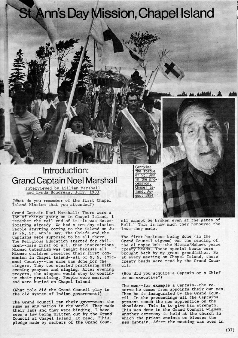 Published by Ronald Caplan on 1985/8/1 (1528 reads)nn's Day Mission, Cliapei Island Introduction: Grand Captain Noel Marshall Interviewed by Lillian Marshall and Lynda Boudreau, July, 1983 (What do you remember of the first Chapel Island Mission that you attended?) Grand Captain Noel Marshall: There were a lot of things going on In Chapel Island. I remember the tail end of it--it was deter? iorating already. We had a ten-day mission. People starting coming to the island on Ju? ly 26, St. Ann's Day. The Chiefs and.the Captains were supposed to be all there. The Religious Education started for chil- dren--mass first of all, then instructions. Micmac Catechism was taught because all Micmac children received their first com? munion in Chapel Island--all of N. S, (Mic? mac) Country--the same was done for the singers. They too started practising with evening prayers and singing. After evening prayers, the singers would stay to contin? ue choir practising. People were married and were buried on Chapel Island. (What role did the Grand Council play in the old system of Indian government?) The Grand Council ran their government the same as any nation in the world. They made their laws and they were binding. I have seen a law being written out by the Grand Council at Chapel Island. It read, "This pledge made by members of the Grand Coun? cil cannot be broken even at the gates of Hell." This is how much they honoured the laws they made. The first business being done (in the Grand Council wigwam) was the reading of the el nopse kuk--the Micmac/Mohawk peace treaty beads. Those special beads were brought back by my great-grandfather. So at every meeting on Chapel Island, those treaty beads were read by the Grand Coun? cil. (How did you acquire a Captain or a Chief or an executive?) The men--for example a Captain--the re? serve he comes from appoints their own man. Then he is inaugurated by the Grand Coun? cil. In the proceedings all the Captains present touch the new apprentice on the shoulders. This is to give him strength. This was done in the Grand Council wigwam. Another ceremony is held at the church in which the priest anoints or blesses the new Captain. After the meeting was over in (31)
