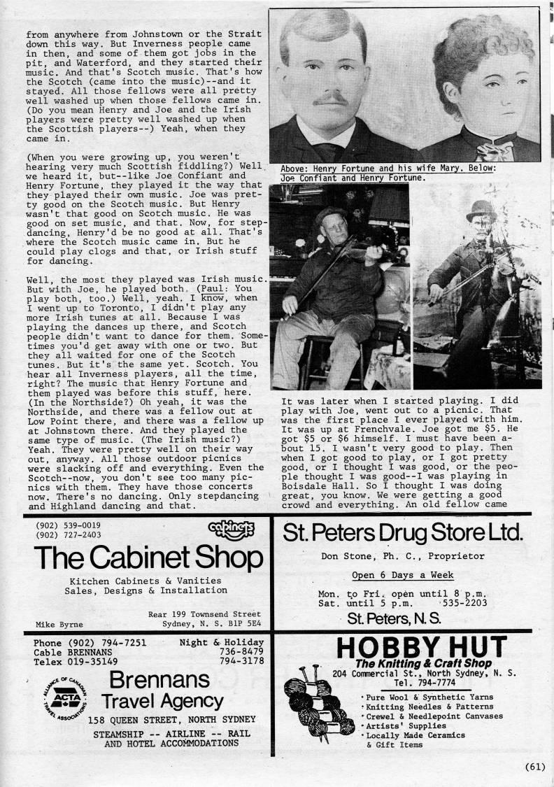 Published by Ronald Caplan on 1985/8/1 (276 reads)from anywhere from Johnstown or the Strait down this way. But Inverness people came in then, and some of them got jobs in the pit, and Waterford, and they started their music. And that's Scotch music. That's how the Scotch (came into the music)--and it stayed. All those fellows were all pretty well washed up when those fellows came in. (Do you mean Henry and Joe and the Irish players were pretty well washed up when the Scottish players--) Yeah, when they came in. (When you were growing up, you weren't hearing very much Scottish fiddling?) Well, we heard it, but--like Joe Confiant and Henry Fortune, they played it the way that they played their own music. Joe was pret? ty good on the Scotch music. But Henry wasn't that good on Scotch music. He was good on set music, and that. Now, for step- dancing, Henry'd be no good at all. That's where the Scotch music came in. But he could play clogs and that, or Irish stuff for dancing. Well, the most they played was Irish music, But with Joe, he played both • (Paul: You play both, too.) Well, yeah. I know, when I went up to Toronto, I didn't play any more Irish tunes at all. Because I was playing the dances up there, and Scotch people didn't want to dance for them. Some? times you'd get away with one or two. But they all waited for one of the Scotch tunes. But it's the same yet. Scotch. You hear all Inverness players, all the time, right? The music that Henry Fortune and them played was before this stuff, here. (In the Northside?) Oh yeah, it was the Northside, and there was a fellow out at Low Point there, and there was a fellow up at Johnstown there. And they played the same type of music. (The Irish music?) Yeah. They were pretty well on their way out, anyway. All those outdoor picnics were slacking off and everything. Even the Scotch--now, you don't see too many pic? nics with them. They have those concerts now. There's no dancing. Only stepdancing and Highland dancing and that. Above: Henry Fortune and his wife Mary. Below: JoQ Confiant and Henry Fortune. It was later when I started playing. I did play with Joe, went out to a picnic. That was the first place I ever played with him. It was up at Frenchvale. Joe got me $5. He got $5 or $6 himself. I must have been a- bout 15. I wasn't very good to play. Then when I got good to play, or I got pretty good, or I thought I was good, or the peo? ple thought I was good--I was playing in Bbisdale Hall. So I thought I was doing great, you know. We were getting a good crowd and everything. An old fellow came (902) 539-0019 (902) 727-2403 The Cabinet Shop Kitchen Cabinets & Vanities Sales, Designs & Installation Mike Byrne Rear 199 Townsend Street Sydney, N. S. BIP 5E4 St. Peters Drug Store Ltd. Don Stone, Ph. C, Proprietor Open 6 Days a Week Mon. to Fri. open until 8 p.m. Sat. until 5 p.m. -535-2203 St. Peters. N.S. Phone (902) 794-7251 Cable BRENNANS Telex 019-35149 Night 6c Holiday 736-8479 794-3178 '';' Brennans ??SS&j; Travel Agency ' 'ssoc>*" 158 QUEEN STREET, NORTH SYDNEY STEAMSHIP -- AIRLINE • RAIL AND HOTEL ACCOMODATIONS HOBBY HUT The Knitting & Craft Shop 204 Coimiercial St., North Sydney, N. S. Tel. 794-7774 • Pure Wool & Synthetic Yams • Knitting Needles & Patterns • Crewel & Needlepoint Canvases • Artists' Supplies • Locally Made Ceramics & Gift Items (61)