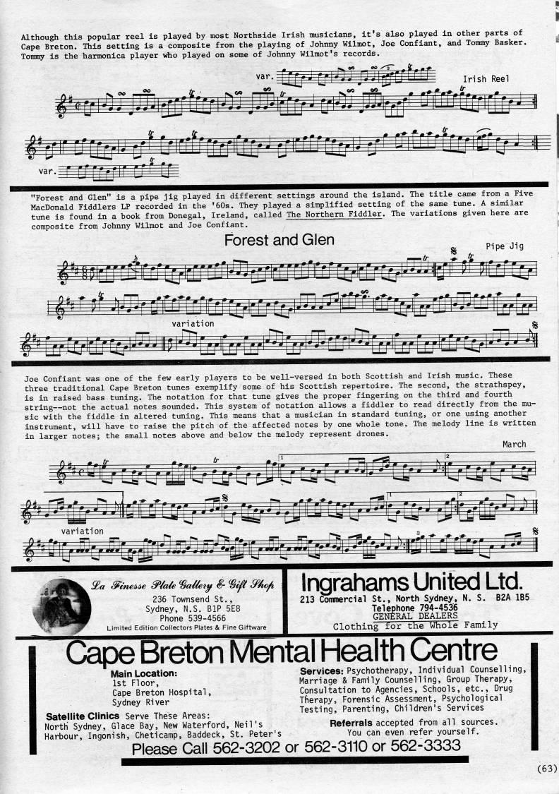 Published by Ronald Caplan on 1985/8/1 (230 reads)Although this popular reel is played by most Northside Irish musicians, it's also played in other parts of Cape Breton. This setting is a composite from the playing of Johnny Wilmot, Joe Confiant, and Tommy Basker. Tommy is the harmonica player who played on some of Johnny Wilmot's records. Irish Reel Forest and Glen Pipe Jig BT'f m [rrrrrrri[r.rc:fi[ir[iri''i''i''[??r'i''''''%' "Forest and Glen" is a pipe jig played in different settings around the island. The title came from a Five MacDonald Fiddlers LP recorded in the '60s. They played a simplified setting of the same tune. A similar tune is found in a book from Donegal, Ireland, called The Northern Fiddler. The variations given here are composite from Johnny Wilmot and Joe Confiant. Joe Confiant was one of the few early players to be well-versed in both Scottish and Irish music. These three traditional Cape Breton tunes exemplify some of his Scottish repertoire. The second, the strathspey, is in raised bass tuning. The notation for that tune gives the proper fingering on the third and fourth string • not the actual notes sounded. This system of notation allows a fiddler to read directly from the mu? sic with the fiddle in altered tuning. This means that a musician in standard tuning, or one using another instrument, will have to raise the pitch of the affected notes by one whole tone. The melody line is written in larger notes; the small notes above and below the melody represent drones. March M ''w 236 Townsend St., Sydney, N.S. BIP 5E8 Phone 539-4566 ited Edition Collectors Plates & Fine Giftware Ingrahams United Ltd. 213 Commercial St., North Sydney, N. S. B2A 1B5 Telephone 794-4536 GENERAL DEALERS Clothing for the Whole Family Cape Breton Mental Health Centre Main Location: 1st Floor, Cape Breton Hospital, Sydney River Satellite Clinics Serve These Areas: North" Sydney, Glace Bay, New Waterford, Harbour, Ingonish, Cheticamp, Baddeck, Neil's St. Peter's Services: Psychotherapy, Individual Counselling, Marriage & Family Counselling, Group Therapy, Consultation to Agencies, Schools, etc.. Drug Tfierapy, Forensic Assessment, Psychological Testing, Parenting, Children's Services Referrals accepted from all sources. You can even refer yourself. Please Gall 562-3202 or 562-3110 or 562-3333 (63)