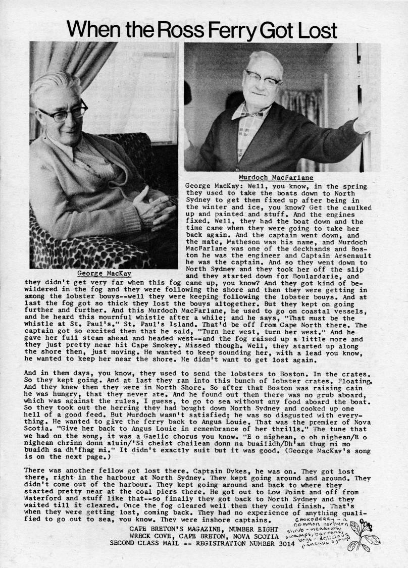 Published by Ronald Caplan on 1974/6/1 (4856 reads)When the Ross Ferry Got Lost Murdoch MacParlane George MacKay: Well, you know, in the spring they used to take the boats down to North Sydney to get them fixed up after being in the winter and ice, you know? Get the caulked up and painted and stuff. And the engines fixed. Well, they had the boat down and the time came when they were going to take her back again. And the captain went down, and the mate, Matheson was his name, and Murdoch MacFarlane was one of the deckhands and Bos? ton he was the engineer and Captain Arsenault he was the captain. And so they went down to North Sydnev and they took her off the slip George MacKay and they started down for Boulardarie, and they didn't get very far when this fog came up, you know? And they got kind of be? wildered in the fog and they were following the shore and then they were getting in among the lobster bouys • well they were keeping following the lobster bouys. And at last the fog got so thick they lost the bouys altogether. But they kept on going further and further. And this Murdoch MacFarlane, he used to go on coastal vessels, and he heard this mournful whistle after a while; and he says, "That must be the whistle at St, Paul's," St, Paul's Island, That'd be off from Cape North there. The captain got so excited then that he said, "Turn her west, turn her west." And he gave her full steam ahead and headed west • and the fog raised up a little more and they just pretty near hit Cape Smokey. Missed though. Well, they started up along the shore then, just moving. He wanted to keep sounding her, with a lead you know, he wanted to keep her near the shore. Ke didn't want to get lost again. And in them days, you know, they used to send the lobsters to Boston. In the crates. So they kept going. And at last they ran into this bunch of lobster crates. Floating, And they knew then they were in North Shore. So after that Boston was raising cain he was hungry, that they never ate. And he found out then there xvas no grub aboard, which was against the rules, I guess, to go to sea without any food aboard the boat. So they took out the herring they had bought down North Sydney and cooked up one hell of a good feed. But Murdoch wasn't satisfied; he was so disgusted with every? thing. He wanted to give the ferry back to Angus Louie. That was the premier of Nova Scotia. "Give her back to Angus Louie in remembrance of her thrills," The tune that we had on the song, it was a Gaelic chorus you know. "E o nighean, o oh nighean/B o nighean chrinn donn aluin/'Si cheist chailean donn na buailidh/Dh'an thug mi mo buaidh sa dh'fhs' mi," It didn't exactly suit but it was good, (George MacKav's song is on the next page,) There was another fellow got lost there. Captain Dykes, he was on. They got lost there, right in the harbour at North Sydney. They kept going around and around. They didn't come out of the harbour. They kept going around and back to where they started pretty near at the coal piers there. He got out to Low Point and off from Waterford and stuff like that • so finally they got back to North Sydney and they waited till it cleared. Once the fog cleared well then they could finish. That's when they were getting lost, coming back. They had no experience of anything quali? fied to go out to sea, vou know, Thev were inshore captains, (;k't • 5t*'i' ??-< CAPB BRETON'S MAGAZINE, NUMBER EIGHT ''.c''o - ''''''''''t'ij WRECK COVE, CAPB BRETON, NOVA SCOTIA ''-??"'''.'.dzW-'"/' SECOND CLASS MAIL • REGISTRATION NUMBER 3014 *".; i.'-'-''*' ''