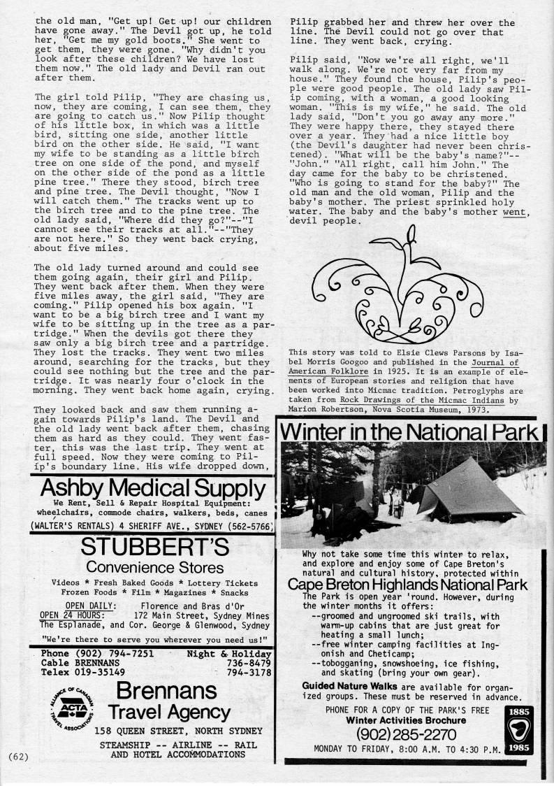 Published by Ronald Caplan on 1986/1/1 (154 reads)the old man, "Get up! Get up! our children have gone away." The Devil got up, he told her, "Get me my gold boots." She went to get them, they were gone. "Why didn't you look after these children? We have lost them now." The old lady and Devil ran out after them. The girl told Pilip, "They are chasing us, now, they are coming, I can see them, they are going to catch us." Now Pilip thought of his little box, in which was a little bird, sitting one side, another little bird on the other side. He said, "I want my wife to be standing as a little birch tree on one side of the pond, and myself on the other side of the pond as a little pine tree." There they stood, birch tree and pine tree. The Devil thought, "Now I will catch them." The tracks went up to the birch tree and to the pine tree. The old lady said, "Where did they go?"--"I cannot see their tracks at all."--"They are not here." So they went back crying, about five miles. The old lady turned around and could see them going again, their girl and Pilip. They went back after them. When they were five miles away, the girl said, "They are coming." Pilip opened his box again. "I want to be a big birch tree and I want my wife to be sitting up in the tree as a par? tridge." When the devils got there they saw only a big birch tree and a partridge. They lost the tracks. They went two miles around, searching for the tracks, but they could see nothing but the tree and the par? tridge. It was nearly four o'clock in the morning. They went back home again, crying. They looked back and saw them running a- gain towards Pilip's land. The Devil and the old lady went back after them, chasing them as hard as they could. They went fas? ter, this was the last trip. They went at full speed. Now they were coming to Pil? ip ' s boundary line. His wife dropped down. Pilip grabbed her and threw her over the line. The Devil could not go over that line. They went back, crying. Pilip said, "Now we're all right, we'll walk along. We're not very far from my house." They found the house, Pilip's peo? ple were good people. The old lady saw Pil? ip coming, with a woman, a good looking woman, "This is my wife," he said. The old lady said, "Don't you go away any more." They were happy there, they stayed there over a year. They had a nice little boy (the Devil's daughter had never been chris? tened). "What will be the baby's name?"-- "John." "All right, call him John." The day came for the baby to be christened. "Who is going to stand for the baby?" The old man and the old woman, Pilip and the baby's mother. The priest sprinkled holy water. The baby and the baby's mother went, "devil people. This story was told to Elsie Clews Parsons by Isa? bel Morris Googoo and published in the Journal of American Folklore in 1925. It is an example of ele? ments of European stories and religion that have been worked into Micmac tradition. Petroglyphs are taken from Rock Drawings of the Micmac Indians by Marion Robertson, Nova Scotia Museum, 1973. Ashby Medical Supply We Rent, Sell & Repair Hospital Equipment: wheelchairs, conmode chairs, walkers, beds, canes (WALTER'S RENTALS) 4 SHERIFF AVE.. SIDNEY (562-5766) Winter In the National STUBBERT'S Convenience Stores Videos * Fresh Baked Goods * Lottery Tickets Frozen Foods * Film * Magazines * Snacks OPEN DAILY: Florence and Bras d'Or 172 Main Street, Sydney Mines OPEN 24 HOURS: The Esplanade, and Cor. George & Glenwood, Sydney "We're there to serve you wherever you need us! Phone (902) 794-7251 Cable BRENNANS Telex 019-35149 Night & Holiday 736-8479 : 794-3178 (62) ''' Brennans ''??Si'j Travel Agency '