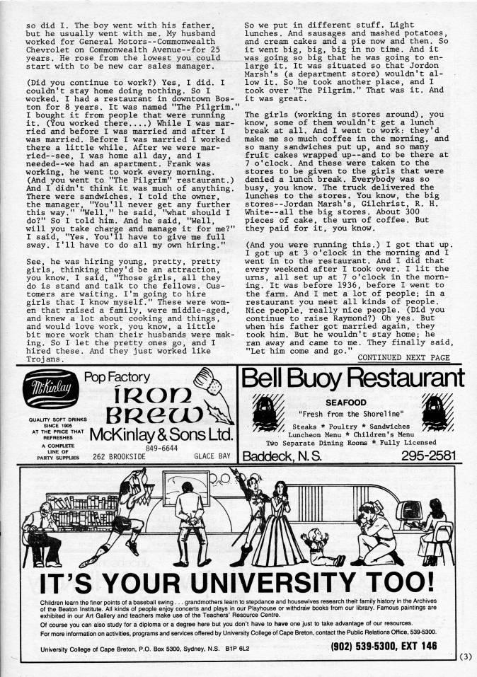 Published by Ronald Caplan on 1986/6/1 (365 reads)so did I, The boy went with his father, but he usually went with me. My husband worked for General Motors--Commonwealth Chevrolet on Commonwealth Avenue--for 25 years. He rose from the lowest you could' start with to be new car sales manager. (Did you continue to work?) Yes, I did. I couldn't stay home doing nothing. So I worked. I had a restaurant in downtown Bos? ton for 8 years. It was named "The Pilgrim.' I bought it from people that were running it. (You worked there....) While I was mar? ried and before I was married and after I was married. Before I was married I worked there a little while. After we were mar? ried- -see, I was home all day, and I needed--we had an apartment, Frank was working, he went to work every morning. (And you went to "The Pilgrim" restaurant.) And I didn't think it was much of anything. There were sandwiches. I told the owner, the manager, "You'll never get any further this way." "Well," he said, "what should I do?" So I told him. And he said, "Well, will you take charge and manage it for me?" I said, "Yes. You'll have to give me full sway. I'll have to do all my own hiring." See, he was hiring young, pretty, pretty girls, thinking they'd be an attraction, you know. I said, "Those girls, all they do is stand and talk to the fellows. Cus? tomers are waiting. I'm going to hire girls that I know myself." These were wom? en that raised a family, were middle-aged, and knew a lot about cooking and things, and would love work, you know, a little bit more work than their husbands were mak? ing. So I let the pretty ones go, and I hired these. And they just worked like Troj ans. So we put in different stuff. Light lunches. And sausages and mashed potatoes, and cream cakes and a pie now and then. So it went big, big, big in no time. And it was gpin' so big that he was going to en? large it. It was situated so that Jordon Marsh's (a department store) wouldn't al? low it. So he took another place, and I took over "The Pilgrim." That was it. And it was great. The girls (working in stores around), you know, some of them wouldn't get a lunch break at all. And I went to work: they'd make me so much coffee in the morning, and so many sandwiches put up, and so many fruit cakes wrapped up--and to be there at 7 o'clock. And these were taken to the stores to be given to the girls that were denied a lunch break. Everybody was so busy, you know. The truck delivered the lunches to the stores. You know, the big stores--Jordan Marsh's, Gilchrist, R. H. White--all the big stores. About 300 pieces of cake, the urn of coffee. But they paid for it, you know. (And you were running this.) I got that up. I got up at 3 o'clock in the morning and I went in to the restaurant. And I did that every weekend after I took over. I lit the urns, all set up at 7 o'clock in the morn? ing. It was before 1936, before I went to the farm. And I met a lot of people; in a restaurant you meet all kinds of people. Nice people, really nice people. (Did you continue to raise Ra3nnond?) Oh yes. But when his father got married again, they took him. But he wouldn't stay home; he ran away and came to me. They finally said, "Let him come and go." CONTINUED NEXT PAGE ty&% QUALITY SOFT DRINKS SINCE 1905 AT THE PRICE THAT REFRESHES A COMPLETE LINE OF PARTY SUPPLIES Pop Factory iRon BTZGUJ McKinlay &Sons; Ltd. 849-6644 262 BROOKSIDE GLACE BAY Bell Buoy Restaurant yM'// SEAFOOD yA "Fresh from the Shoreline" Steaks * Poultry * Sandwiches Luncheon Menu * Children's Menu Two Separate Dining Rooms * Fully Licensed Baddeck, N. 8. 295-2581 IT'S YOUR UNIVERSITY TOO! Children learn the finer points of a baseball swing ... grandmothers learn to stepdance and housewives research their family history in the Archives of the Beaton Institute. All kinds of people enjoy concerts and plays in our Playhouse or withdraw books from our library. Famous paintings are exhibited in our Art Gallery and teachers make use of the Teachers' Resource Centre. Of course you can also study for a diploma or a degree here but you don't have to have one just to take advantage of our resources. For more information on activities, programs and services offered by University College of Cape Breton, contact the Public Relations Office, 539-5300. University College of Cape Breton, P.O. Box 5300, Sydney, N.S. BIP 6L2 (902) 539-5300. EXT 146 (3)
