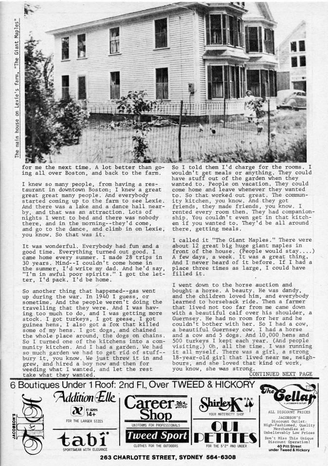 Published by Ronald Caplan on 1986/6/1 (338 reads)GL for me the next time. A lot better than go? ing all over Boston, and back to the farm. I knew so many people, from having a res? taurant in downtown Boston; I knew a great great great many people. And everybody started coming up to the farm to see Lexie. And there was a lake and a dance hall near? by, and that was an attraction. Lots of nights I went to bed and there was nobody there, and in the moming--they' d come, and go to the dance, and climb in on Lexie, you know. So that was it. It was wonderful. Everybody had fun and a good time. Everything turned out good. I came home every summer. I made 28 trips in 30 years. Mind--I couldn't come home in the summer, I'd write my dad. And he'd say, "I'm in awful poor spirits." I got the let? ter, I'd pack. I'd be home. So another thing that happened--gas went up during the war. In 1940 I guess, or sometime. And the people weren't doing the travelling that they were. And I was hav? ing too much to do, and I was getting more stock. I got turkeys, I got geese, I got guinea hens. I also got a fox that killed some of my hens, I got dogs, and chained the whole place around, the dogs on chains. So I turned one of the kitchens into a com? munity kitchen. And I had a garden. We had so much garden we had to get rid of stuff-- bury it, you know. We just threw it in and grew, and hired a boy now and then for weeding what I wanted, and let the rest take what they wanted. So I told them I'd charge for the rooms. I wouldn't get meals or anything. They could have stuff out of the garden when they wanted to. People on vacation. They could come home and leave whenever they wanted to. So that worked out great. The commun? ity kitchen, you know. And they got friends, they made friends, you know. I rented every room then. They had companion? ship. You couldn't even get in that kitch? en if you wanted to. They'd be all around ' there, getting meals. I called it "The Giant Maples." There were about 12 great big huge giant maples in front of the house. (People would stay....) A few days, a week. It was a great thing. And I never heard of it before. If I had a place three times as large, I could have filled it. I went down to the horse auction and bought a horse. A beauty. He was dandy, and the children loved him, and everybody learned to horseback ride • Then a farmer that lived not too far from me came down with a beautiful calf over his shoulder, a Guernsey. He had no room for her and he couldn't bother with her. So I had a cow, a beautiful Guernsey cow. I had a horse and a cow and 5 dogs. And 10,000 hens and 500 turkeys I kept each year. (And people visiting.) Oh, all the time. I was running it all myself? There was a girl, a strong 18-year-old girl that lived near me, neigh? bours, and she loved that kind of work, you know, she was strong. CONTINUED NEXT PAGE 6 Boutiques Under 1 Roof: 2nd FL, Over TWEED & HICKORY 'ditim'lc FOR THE LARGER SIZES 'tabi* SPORTSWEAR WITH ELEGANCE Tweed Sport CLOTHES FOR THE OUTDOORS YOUR MATERNITY SHOP • LJI rCTITCS FOR THE 5'2" AND UNDER ALL DISCOUNT PRICES JACOBSON'S Discount Outlet: High-Fashioned, Quality Merchandise at Unbelievably Low Prices Don't Miss This Unique Discount Operation! 40 Pitt Street under Tweed & Hickory 263 CHARLOTTE STREET, SYDNEY 564-6308