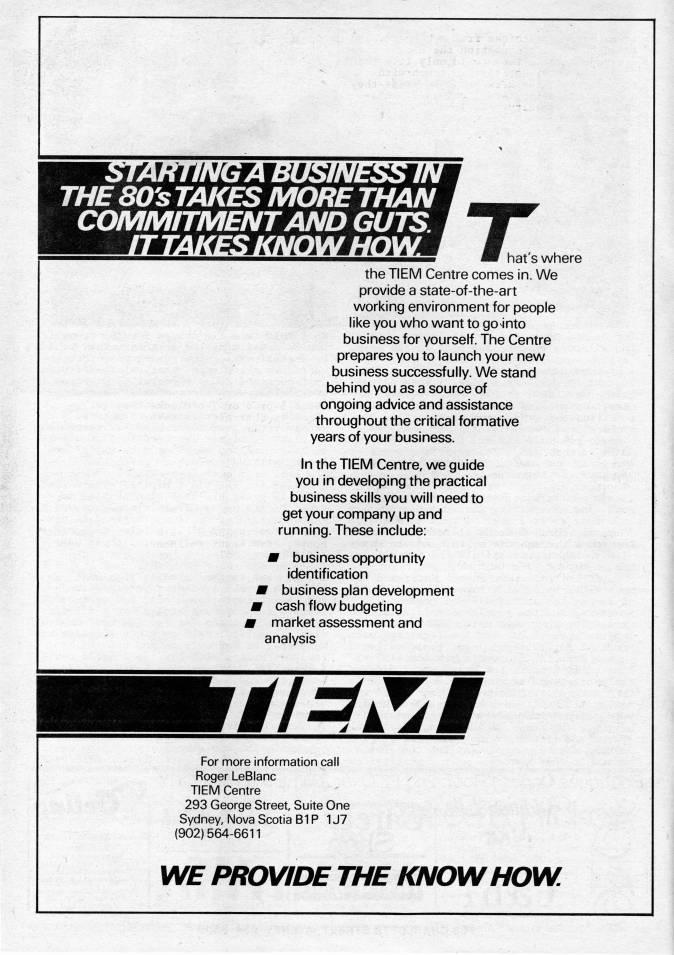 Published by Ronald Caplan on 1986/6/1 (371 reads)fl 'IMll'iefi W:ifA'/i'/=fi*ci/tU THE 80's TAKES MORE THAN COMMTTMENT AND GUTS. '??W'mvfIM??WMZiiy' hat's where the TIEM Centre comes in. We provide a state-of-the-art working environment for people like you who want to go'nto business for yourself. The Centre prepares you to launch your new business successfully. We stand behind you as a source of ongoing advice and assistance throughout the critical formative years of your business. In the TIEM Centre, we guide you in developing the practical business skills you will need to get your company up and running. These include: M business opportunity identification w business plan development r cash flow budgeting market assessment and analysis #/'i'# For more information call Roger LeBlanc TIEM Centre 293 George Street Suite One Sydney, Nova Scotia BIP 1J7 (902)564-6611 WE PROVIDE THE KNOW HOW.