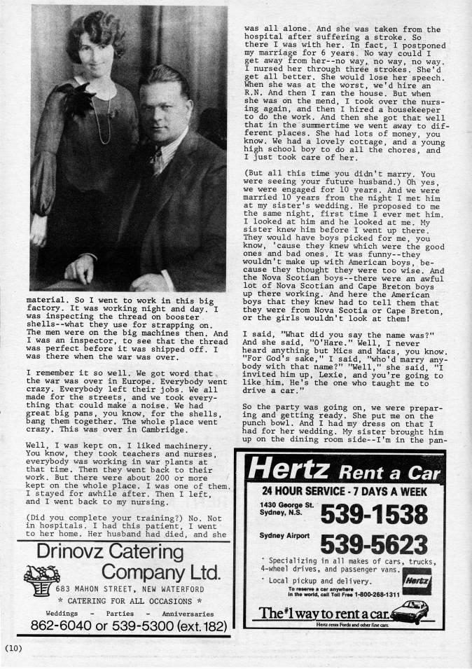 Published by Ronald Caplan on 1986/6/1 (338 reads)material. So I went to work in this big factory. It was working night and day. I was inspecting the thread on booster shells--what they use for strapping on. The men were on the big machines then. And I was an inspector, to see that the thread was perfect before it was shipped off. I was there when the war was over. I remember it so well. We got word that the war was over in Europe. Everybody went crazy. Everybody left their jobs. We all made for the streets, and we took every? thing that could make a noise. We had great big pans, you know, for the shells, bang them together. The whole place went crazy. This was over in Cambridge. Well, I was kept on. I liked machinery. You know, they took teachers and nurses, everybody was working in war plants at that time. Then they went back to their work. But there were about 200 or more kept on the whole place. I was one of them. I stayed for awhile after. Then I left, and I went back to my nursing. (Did you complete your training?) No. Not in hospitals. I had this patient, I went to her home. Her husband had died, and she Drinovz Catering Company Ltd. 583 MAHON STREET, NEW WATERFORD - CATERING FOR ALL OCCASIONS '' Weddings - Parties - Anniversaries 862-6040 or 539-5300 (ext 182) was all aloneo And she was taken from the hospital after suffering a stroke. So there I was with her. In fact, I postponed my marriage for 6 years o No way could I get away from her--no way, no way, no way. I nursed her through thr'e strokes. She'd get all better. She would lose her speech. When she was at the worst, we'd hire an R.N. And then I ran the house. But when she was on the mend, I took over the nurs? ing again, and then I hired a housekeeper to do the work. And then she got that well that in the summertime we went away to dif? ferent places. She had lots of money, you know. We had a lovely cottage, and a young high school boy to do all the chores, and I just took care of her. (But all this time you didn't marry. You were seeing your future husband.) Oh yes, we were engaged for 10 years. And we were married 10 years from the night I met him at my sister's wedding. He proposed to me the same night, first time I ever met him. I looked at him and he looked at me. My sister knew him before I went up there. They would have boys picked for me, you know, 'cause they knew which were the good ones and bad ones. It was funny--they wouldn't make up with American boys, be? cause they thought they were too wise. And the Nova Scotian boys--there were an awful lot of Nova Scotian and Cape Breton boys up there working. And here the American boys that they knew had to tell them that they were from Nova Scotia or Cape Breton, or the girls wouldn't look at them! I said, "What did you say the name was?" And she said, "O'Hare." Well, I never heard anything but Mies and Macs, you know. "For God's sake," I said, "who'd marry any? body with that name?" "Well," she said, "I invited him up, Lexie, and you're going to like himc He's the one who taught me to drive a car." So the party was going on, we were prepar? ing and getting ready. She put me on the punch bowl. And I had my dress on that I had for her wedding. My sister brought him up on the dining room side--I'm in the pan- HottZ Rent a Car 1430 George St. Sydney, N.S. Sydney Airport 24 HOUR SERVICE - 7 DAYS A WEEK 539-1538 539-5623 • Specializing in all makes of cars, trucks, 4-wheel drives, and passenger vans.i • Local pickup and delivery. fMifftzi To reserve a car anywhere in the worid, caii Toil Free 1-800-268-1311 The*l way to rent a can Flenz rents Fords and other fine cars. (10)