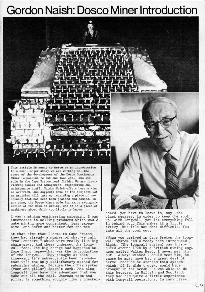 Gordon Naish: Dosco Miner Introduction This article is meant to serve as an introduction to a much longer story we are working on • the story of the development of the Dosco Continuous Miner (a machine to cut and load coal) and its role in the Cape Breton coal fields. We are inter? viewing miners and management, engineering and maintenance staff. Gordon Naish offers here a kind of overview, and suggests some of the subjects lat? er articles will take up regarding a piece of ma? chinery that has been both praised and damned. In any case, the Dosco Miner made for major reorgani? zation of the work of mining, and it is a piece of machinery about which too little is known. I was a mining engineering salesman. I was interested in selling products which would make mining more convenient, less expen? sive, and safer and better for the men. At that time that I came to Cape Breton, they had already a number of what we call "coal cutters," which were really like big chain saws. And these undercut the long- wall face. The big change had happened be? fore I got here--that was the introduction of the longwall. They thought at that time--and it's subsequently been proved-- that it's the only satisfactory method for submarine mining. Because the other system (room-and-pillar) doesn't work. And also, longwall does have the advantage that you take out all the coal. Whereas room-and- pillar is something roughly like a checker? board- -you have to leave in, say', the black squares, in order to keep the roof up. With longwall, you let everything fall in behind you. This makes it a little tricky, but it's not that difficult. You take all the coal out. (When you arrived in Cape Breton the long- wall system had already been introduced.) Right. (The longwall system) was intro? duced around 1928 by a British mining engi? neer called Walter Herd. I never met him, but I always wished I could meet him, be? cause he must have had a great deal of nerve. Because he started this system which, if it didn't work, could have brought in the ocean. He was able to do this because, in Britain and Scotland, they had had quite a little experience with longwall operations. In many cases, (17)