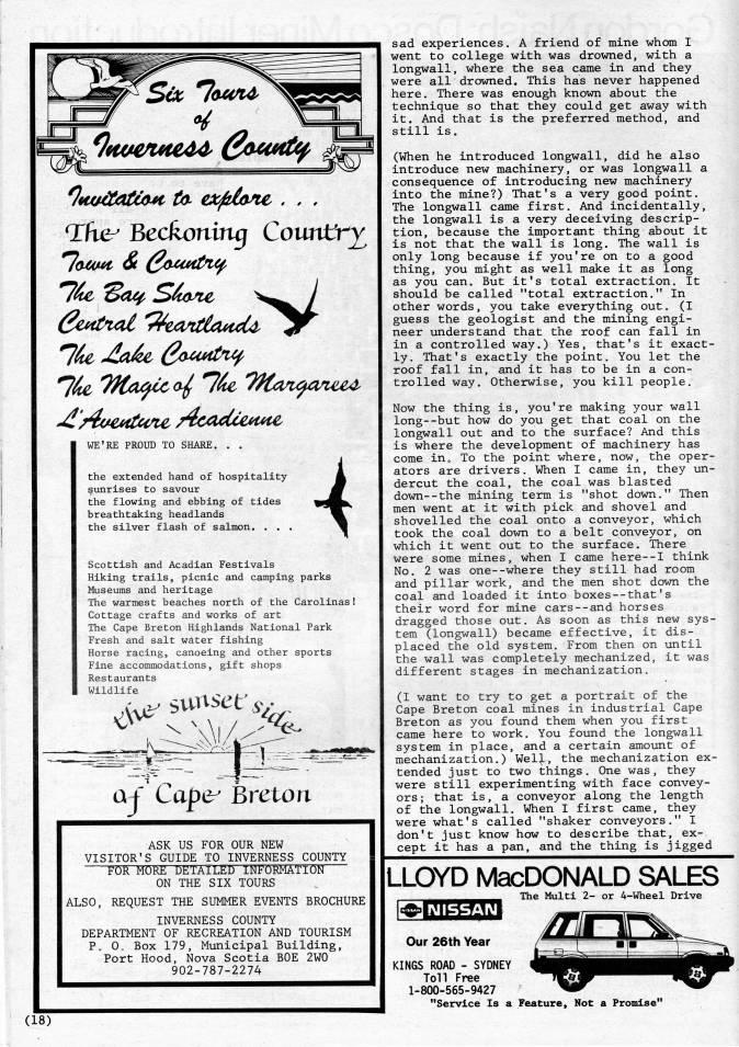 Published by Ronald Caplan on 1986/6/1 (349 reads)'??U/ • nH • 44' 'MiHUff Tfiier' Beckoning Coimtry' WE'RE PROUD TO SHARE. . . the extended hand of hospitality sunrises to savour the flowing and ebbing of tides breathtaking headlands the silver flash of salmon. . . . Scottish and Acadian Festivals Hiking trails, picnic and camping parks Museums and heritage The warmest beaches north of the Carolinas! Cottage crafts and works of art The Cape Breton Highlands National Park Fresh and salt water fishing Horse racing, canoeing and other sports Fine accommodations, gift shops Restaurants Wildlife a4 Cape" Bretori ASK US FOR OUR NEW VISITOR'S GUIDE TO INVERNESS COUNTY FOR MOR?? DETAILED INFORMATION ON THE SIX TOURS ALSO, REQUEST THE SUMMER EVENTS BROCHURE INVERNESS COUNTY DEPARTMENT OF RECREATION AND TOURISM P • 0. Box 179, Municipal Building, Port Hood, Nova Scotia BOE 2W0 902-787-2274 sad experiences. A friend of mine whom I went to college with was drowned, with a longwall, where the sea came in and they were all drowned. This has never happened here. There was enough known about the technique so that they could get away with it. And that is the preferred method, and still is. (When he introduced longwall, did he also introduce new machinery, or was longwall a consequence of introducing new machinery into the mine?) That's a very good point. The longwall came first. And incidentally, the longwall is a very deceiving descrip? tion, because the important thing about it is not that the wall is long. The wall is only long because if you're on to a good thing, you might as well make it as long as you can. But it's total extraction. It should be called "total extraction." In other words, you take everything out. (I guess the geologist and the mining engi? neer understand that the roof can fall in in a controlled way.) Yes, that's it exact? ly. That's exactly the point. You let the roof fall in, and it has to be in a con? trolled way. Otherwise, you kill people. Now the thing is, you're making your wall long--but how do you get that coal on the longwall out and to the surface? And this is where the development of machinery has come ino To the point where, now, the oper? ators are drivers. When I came in, they un? dercut the coal, the coal was blasted down--the mining term is "shot down." Then men went at it with pick and shovel and shovelled the coal onto a conveyor, which took the coal down to a belt conveyor, on which it went out to the surface. There were some mines, when I came here--I think No. 2 was one--where they still had room and pillar work, and the men shot down the coal and loaded it into boxes--that's their word for mine cars--and horses dragged those out. As soon as this new sys? tem (longwall) became effective, it dis? placed the old system. From then on until the wall was completely mechanized, it was different stages in mechanization. (I want to try to get a portrait of the Cape Breton coal mines in industrial Cape Breton as you found them when you first came here to work. You found the longwall system in place, and a certain amount of mechanization.) Wel', the mechanization ex? tended just to two things. One was, they were still experimenting with face convey? ors ; that is, a conveyor along the length of the longwall. When I first came, they were what's called "shaker conveyors." I don't just know how to describe that, ex? cept it has a pan, and the thing is jigged LLOYD MacDONALD SALES O NISSAN The Multi 2- or 4-Wheel Drive Our 26th Year KINGS ROAD - SYDNEY Toll Free 1-800-565-9427 "Service Is a Feature?? Not a Promise" (18)