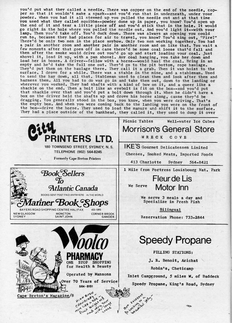 Published by Ronald Caplan on 1974/6/1 (715 reads)you'd put what they called a needle. There was copper on the end of the needle, cop? per so that it wouldn't make a spark • and you'd run that in underneath, under your powder. When you had it all stemmed up you pulled the needle out and at that time you used what they called squibbs • powder done up in paper, you know? You'd open up the end of it and tear a little piece off and you'd stick that in the hole. It would go right in the hole where you pulled the needle out. And you'd light it • with your lamp. Then you'd take off. You'd duck down. There was always an opening you could run to, because they had places for air to travel, you know? You'd sing out, "Firel" There'd be only two men in the place anyhow. Only two men working together. You had a pair in another room and another pair in another room and on like that. You wait a few moments after that goes off in case there'd be some coal loose that'd fall and then after the smoke would drive out you'd go up and start loading your coal. Just shovel it, load it up, with a pan shovel. Any coal hanging, you take her down and load her in boxes. A driver • fellow with a horse • would haul the coal. Bring in an empty and he'd take the full one out. They'd go to the pit bottom, rope haulage. They'd put them on the haulage there. They call it a grab. Then it was hoist to the surface. I drove for a while. There was a stable in the mine, and a stableman. Used to send the hay down, all that. Stableman used to clean them and look after them and harness them. All you had to do was go in and take them out, down to the landing or wherever you v/orked. They had shafts with a kind of bow on it, and a queer like a shackle on the end. Then a bolt like an eyebolt is fit on the box • and you'd put that shackle over that and you'd put a bolt down through it. When he didn't have a box on the driver held the shafts up and drove his horse along, cause they'd be dragging. You generally stood in the box, you know, when you were driving. That's the empty box. And when you were coming back to the landing you were on the front of the box • drive the horse. They used to load the manure and shift it to the surface. They had a place outside of the bankhead, they called it, they used to dump it over e% PRINTERS LTD. 180 TOWNSEND STREET, SYDNEY, N.S. TELEPHONE (902) 564-8245 Formerly Cape Breton Printers Picnic Tables Well-water Ice Cubes Morrison's General Store RECK COVE I KE S Gourmet Delicatessen Limited Cheeses, Smoked Meats, Imported Foods 413 Charlotte Sydney 564-8421 "booksellers To Atlantic Canada BOOKS SENT POST PAID ANYWHERE IN THE WORLD BAYERS ROAD SHOPPING CENTRE HALIFAX 453-1095 1 Mile from Portress Louisbourg Nat, Park FleurdeLis We serve ['q'q' y'' We serve 3 meals a day and Specialize in Fresh Fish Bilingual Reservation Phone: 733-2844 M volw PHARMACY ONE STOP SHOPPING for Health & Beauty Operated by Mansons Over 70 Years of Service 564-8151 Speedy Propane FILLING STATIONS: J, E. Benoit, Arichat Robin's, Cheticamp Inlet Campground, 5 miles W, of Baddeck Speedy Propane, King's Road, Sydney Cape Breton's Magazine/8 .'''
