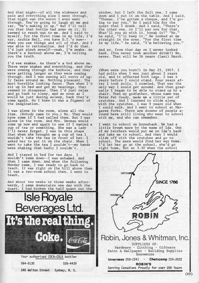 And that night--of all the sickness and pain and everything else I went through, that night was the worst I ever went through. You're going to laugh at me and say, "He's making it up." But I'll tell you that that bottle had arms on it. It seemed to reach out to me. And I said to myself, for the first time in my life, I'd say, Archie Neil, you have D.T.'s now-- when you see things and all of that. And I was able to rationalize. And I'd do that. I'd just pinch myself--yeah, I'm awake. As there's a Saviour above me, I'm telling you the truth. I'd see snakes. As there's a God above me. There were snakes and everything, and they were coming through the keyhole, and they were getting larger as they were coming through. And I was seeing all sorts of ug? ly faces around me. Nothing pleasant. The most horrible looking faces. Then when I'd sit up in bed and get my bearings, they seemed to disappear. Then I'd just relax and go back to sleep, and as soon as I would be just dozing asleep, back they'd come again. So I knew it was a figment of the imagination. I was alone in the room, alone all the time. (Nobody came to you.) No. They would have come if I had called them. But I was alone in the room. And Mrs. Deveau would come up now and again to see if I wanted a cup of tea or something. She was a lady I'll never forget. I was in this shape that when she brought me a cup of tea I wouldn't take the tea in front of her. I asked her to put it on the chair. When I went to take the tea I couldn't--my hands were shaking that badly I_couldn't. And I stayed in bed for two days. I wouldn't come down--I was ashamed. And then I came down. And when the following Monday came, I was ready to go back to teach. It was right on the hill above them. It was a two-room school then. I went to teach. And about two weeks or three weeks after? wards, I came downstairs one day with the quarts I had broken the half quart out the Isle Royale Beverages Ltd. It's the real thing. Coke. OfillWH Your authorized COCA-COLA bottler 564-8130 526-4439 245 Welton Street Sydney, N, S, window, but I left the full one. I came down and I put it on the table. And I said, "Thomas, I've gotten a cheque, and I'm go? ing to pay you." So I paid him for the quart that I drank. And I said, "There's the other one, or I'll pay you for that. What'11 you do with it, break it?" "No," he said, "I'll keep it." He looked at me straight in the eyes. "For the first time in my life," he said, "I'm believing you." And so, from that day on I never looked back. (You never took another drink?) No, never. That will be 36 years (last) March. (When were you bom?) In May 25, 1907. I had polio when I was just about 5 years old, and it affected both legs. I was 4 years before I could stand. Four years af? ter I took polio, I crawled. That was the only way I could get around. And then grad? ually I began to be able to stand up by a chair. Then my godfather, whose name was Peter Pat Coady, made me a little set of crutches. And I learned to slide along with the crutches • I was 9 years old when I could walk. And I went to school at Mar? garee Forks. There are dozens of people a- round here still living who went to school with me, and who can remember. I went to school on horseback. We had a little brown mare by the name of Ida. One of my brothers would put me on Ida's back and take me to school. And then I would slide off with the crutches and go to school. The mare would find her way home. I'd let her go at the school, she'd go right home. But at 3:30 when the school CHETICAMI SINCE 1766 INVERNES; Robin, Jones & Whitman, Inc. SUPPLIERS OF: Hardware • Clothing • Giftware Paint 6e Wallpaper ?? Building Supplies Souvenirs Inverness 258-2241 • Cheticamp 224-2022 ROBIN'S Serving Canadians Proudly for over 200 Years (69)