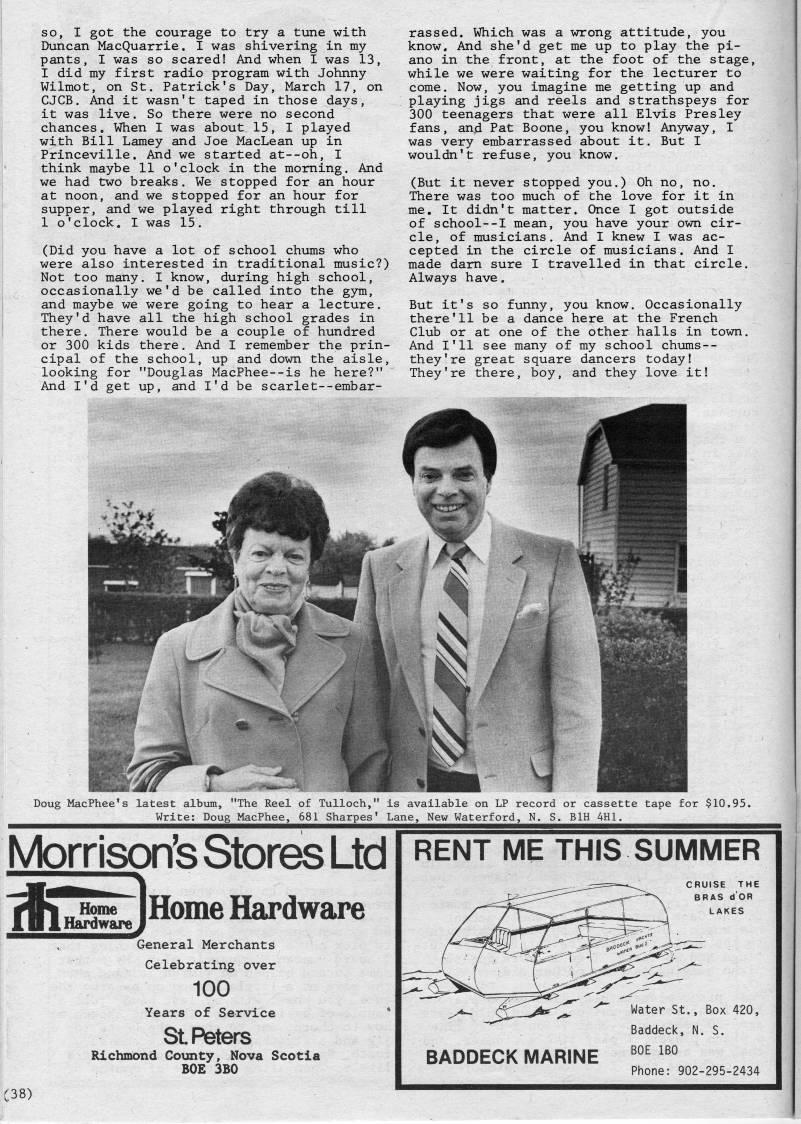 Published by Ronald Caplan on 1986/8/1 (399 reads)so, I got the courage to try a tune with Duncan MacQuarrie. I was shivering in my pants, I was so scared! And when I was 13, I did my first radio program with Johnny Wilmot, on St. Patrick's Day, March 17, on CJCB. And it wasn't taped in those days, it was live. So there were no second chances. When I was about 15, I played with Bill Lamey and Joe MacLean up in Princeville. And we started at--oh, I think maybe 11 o'clock in the morning. And we had two breaks. We stopped for an hour at noon, and we stopped for an hour for supper, and we played right through till 1 o'clock. I was 15. (Did you have a lot of school chums who were also interested in traditional music?) Not too many. I know, during high school, occasionally we'd be called into the gym, and maybe we were going to hear a lecture. They'd have all the high school grades in there. There would be a couple of hundred or 300 kids there. And I remember the prin? cipal of the school, up and down the aisle, looking for "Douglas MacPhee--is he here?" And I'd get up, and I'd be scarlet--embar- rassed. Which was a wrong attitude, you know. And she'd get me up to play the pi? ano in the front, at the foot of the stage, while we were waiting for the lecturer to come. Now, you imagine me getting up and playing jigs and reels and strathspeys for 300 teenagers that were all Elvis Presley fans, and Pat Boone, you know! An5rway, I was very embarrassed about it. But I wouldn't refuse, you know. (But it never stopped you.) Oh no, no. There was too much of the love for it in me. It didn't matter. Once I got outside of school--I mean, you have your own cir? cle, of musicians. And I knew I was ac? cepted in the circle of musicians. And I made dam sure I travelled in that circle. Always have. But it's so funny, you know. Occasionally there'll be a dance here at the French Club or at one of the other halls in town. And I'll see many of my school chums-- they're great square dancers today! They're there, boy, and they love it! Doug MacPhee's latest album, "The Reel of Tulloch," is available on LP record or cassette tape for $10.95. Write; Doug MacPhee, 681 Sharpes' Lane, New Waterford, N. S. BIH 4H1. Morrison' Stores Ltd Home Hardware Hardware General Merchants Celebrating over 100 Years of Service StPeters Richmond County, Nova Scotia BOE 3B0 (.38) RENT ME THIS SUMMER CRUISE THE BRAS d'OR LAKES BADDECK MARINE Water St., Box 420, Baddeck, N. S. BOE IBO Phone: 902-295-2434