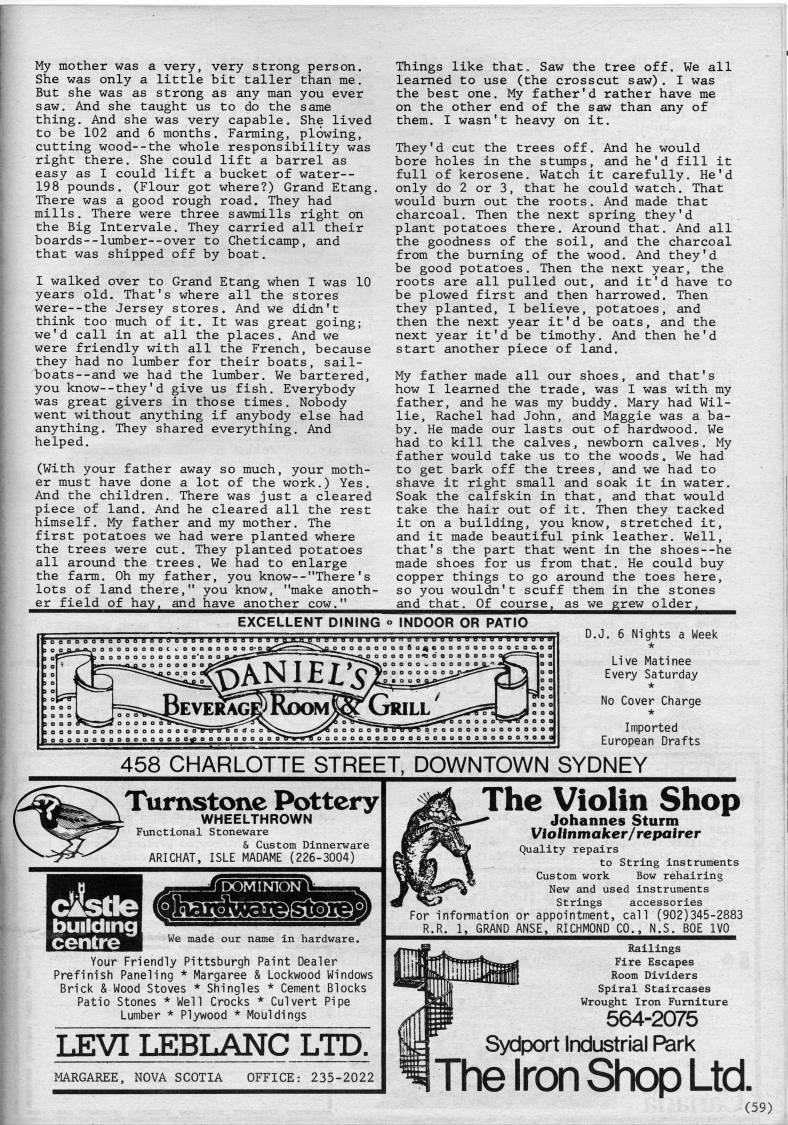 Published by Ronald Caplan on 1986/8/1 (167 reads)My mother was a very, very strong person. She was only a little bit taller than me. But she was as strong as any man you ever saw. And she taught us to do the same thing. And she was very capable. She lived to be 102 and 6 months. Farming, plowing, cutting wood--the whole responsibility was right there. She could lift a barrel as easy as I could lift a bucket of water-- 198 pounds. (Flour got where?) Grand Etang. There was a good rough road. They had mills. There were three sawmills right on the Big Intervale. They carried all their boards--lumber--over to Cheticamp, and that was shipped off by boat. I walked over to Grand Etang when I was 10 years old. That's where all the stores were--the Jersey stores. And we didn't think too much of it. It was great going; we'd call in at all the places. And we were friendly with all the French, because they had no lumber for their boats, sail? boats --and we had the lumber. We bartered, you know--they'd give us fish. Everybody was great givers in those times. Nobody went without anything if anybody else had anything. They shared everything. And helped. (With your father away so much, your moth? er must have done a lot of the work.) Yes. And the children.. There was just a cleared piece of land. And he cleared all the rest himself. My father and my mother. The first potatoes we had were planted where the trees were cut. They planted potatoes all around the trees. We had to enlarge the farm. Oh my father, you know--"There's lots of land there," you know, "make anoth- er field of hay, and have another cow." Things like that. Saw the tree off. We all learned to use (the crosscut saw). I was the best one. My father'd rather have me on the other end of the saw than any of them. I wasn't heavy on it. They'd cut the trees off. And he would bore holes in the stumps, and he'd fill it full of kerosene. Watch it carefully. He'd only do 2 or 3, that he could watch. That would bum out the roots. And made that charcoal. Then the next spring they'd plant potatoes there. Around that. And all the goodness of the soil, and the charcoal from the burning of the wood. And they'd be good potatoes. Then the next year, the roots are all pulled out, and it'd have to be plowed first and then harrowed. Then they planted, I believe, potatoes, and then the next year it'd be oats, and the next year it'd be timothy. And then he'd start another piece of land. My father made all our shoes, and that's how I learned the trade, was I was with my father, and he was my buddy. Mary had Wil? lie, Rachel had John, and Maggie was a ba? by. He made our lasts out of hardwood. We had to kill the calves, newborn calves. My father would take us to the woods. We had to get bark off the trees, and we had to shave it right small and soak it in water. Soak the calfskin in that, and that would take the hair out of it. Then they tacked it on a building, you know, stretched it, and it made beautiful pink leather. Well, that's the part that went in the shoes--he made shoes for us from that. He could buy copper things to go around the toes here, so you wouldn't scuff them in the stones and that. Of course, as we grew older, EXCELLENT DINING <> INDOOR OR PATIO r b o o o D 6 ft ri BBBBBBB'BBBBBBBBB D.J. 6 Nights a Week * Live Matinee Every Saturday * No Cover Charge * Imported European Drafts 458 CHARLOTTE STREET, DOWNTOWN SYDNEY Turnstone Pottery WHEELTHROWN Functional Stoneware & Custom Dinnerware ARICHAT, ISLE MADAME {226-3004} 53gi>?S??5 We made our name in hardware. dtetle building centre I Your Friendly Pittsburgh Paint Dealer Prefinish Paneling * Margaree & Lockwood Windows Brick & Wood Stoves * Shingles * Cement Blocks Patio Stones * Well Crocks * Culvert Pipe Lumber * Plywood * Mouldings LEVmiBLANC LTD. MARGAREE, NOVA SCOTIA OFFICE: 235-2022 The Violin Shop ' Johannes Sturm VioUnmaker/repairer Quality repairs to String instruments Custom work Bow rehairing New and used instruments Strings accessories For information or appointment, call (902)345-2883 R.R. 1, GRAND ANSE, RICHMOND CO., N.S. BOE IVO Railings Fire Escapes Room Dividers Spiral Staircases Wrought Iron Furniture 564-2075 Sydport Industrial Park The Iron Shop Ltd. (59)