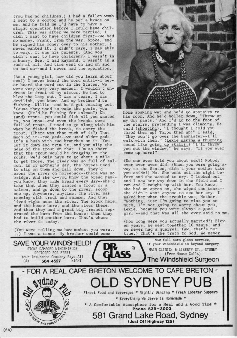 (You had no children.) I had a fallen womb. I went to a doctor and he put a brace on me. And he told me I'd have to have a slight operation before I could have chil? dren. This was after we were married, I didn't want to have children first--we had no money, Frank, from the war, broke, and he signed his money over to his mother. I never wanted it, I didn't care, I was able to work. It was his parents. (And you didn't want to have children?) I wasn't in a hurry. See, I had Raymond. I wasn't in a rush at all. And time went on and on and on and on--and I never had the operation. (As a young girl, how did you learn about sex?) I never heard the word until--I nev? er heard the word sex in the States. We were very very very modest. I wouldn't un? dress in front of my sister. We had to blow the lamp out. I was a tease, I was devilish, you know. And my brother'd be fishing--Willie--and he'd get soaking wet. 'Cause they used to wade the pools, you know. (He'd be fishing for salmon?) Oh, (and) trout--you could fish all you wanted to, you know--and even the brooks were full of trout. I used to go along with him when he fished the brook, to carry the trout. (There was that much of it?) That much of it--two gads--we used alder gads. It's a bush with two branches on it. You cut it down and trim it, and you slip the head of the trout on that. I'm so short that the trout would be dragging on the rocks. We'd only have to go about a mile to get those. The river was so full of sal? mon, in my mother's day, the horses used to slip on them and fall down. They'd cross the river on horseback--there was no bridge. And she'd--you know the bread pan-- you know, they made bread every day--she'd take that when they wanted a trout or a salmon, and go down to the river, scoop one up. An3Aft7here, anytime. The river was teeming with trout and salmon. And they lived right near the river. The brook here, and the house here, and the river there. And then they had a great big freshet sep? arated the bam from the house; then they had to build another bam. That's where the river is today. (You were telling me how modest you were.. ..) I was a tease. My brother would come home soaking wet and he'd go upstairs to his room. And he'd holler down, "Throw up my dry pants." And I'd go to the foot of the stairs, pretending I was climbing. He said (shouting), "I thought I told you throv? them up! Throw them up!" I said, "They won't go over the bannister--I'11 walk with them." (Lexie making a thumping up stairs.) "I'll throw "if you ever sound like going up "Ee~ ;ays, you out the window, come up here!" (No one ever told you about sex?) Nobody ever ever ever did. (When you were going a- way to the States, didn't your mother take you aside?) No. She went out the night be? fore and she wanted to cry. I looked out and I saw her way down in the field and I ran and I caught up with her. You know, she had an apron on, she wiped the tears-- she didn't want anyone to see her cry. I asked her what the trouble was. Mother. "Nothing, just I'm going to miss you so much. I m not going to worry about you, Lexie, because you were always a good girl"--and that was all she ever said to me. (How long were you actually married?) Elev? en years. We went together 10 years. And we never had a quarrel. (Aw, that's not true.) That's the truth to God. We never SAVE YOUR WINDSHIELD! STONE DAMAGED WINDSHIELDS RESTORED FOR FREE! Your Insurance Company Pays All DAY 564-4527 NIGHT f' Now full auto .glass service, if your windshield is beyond surgery MAIN CLINIC: 6 LIBERTY ST., SYDNEY (Free House Calls) The Windshield Surgeon - FOR A REAL CAPE BRETON WELCOME TO CAPE BRETON - %l4Kf.* OLD SYDNEY PUB vT' Finest Food and Beverages * Nightly Dancing * Fresh Lobster Suppers * Everything We Serve Is Homemade * * A Comfortable Atmosphere for a Meal and a Good Time * Phone 539-3003 581 Grand Lake Road, Sydney '' 'hTrh''' ' < J"s* O*' Highway 125)