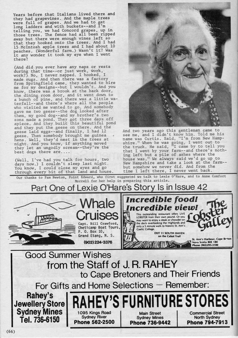 Published by Ronald Caplan on 1986/8/1 (172 reads)Years before that Italians lived there and they had grapevines. And the maple trees were full of grapes. And we had to get long ladders and with buckets--and I'm telling you, we had Concord grapes, up in those trees, The fence had all been ripped away but there were enough vines left so that they hooked onto the trees. And I had 15 Mcintosh apple trees and I had about 10 peaches. (Wonderful farm.) Wasn't it? Was it any wonder it took my eye when I went there? (And did you ever have any naps or rests during that time--or just work, work, work?) No, I never napped. I hooked, I made rugs. And then there was a factory from Springfield came, they wanted to hire me for my designs--but I wouldn't. And you know, there was a brook at the back door, the dining room door, and it went down to a bunch of pine, and there was a little wa- terfall--and there's where all the people who visited me wanted to go. And somebody gave me two geese--the dog looked after them, my good dog--and my brother's two sons made a pond. They got three days off apiece. And they built this beautiful pond and they put the geese on there. And the geese laid eggs--and finally, I had 12 geese. Then somebody brought me guinea hens. Well, they'd nest in the trees at night. And you know, if anything moved they let an ungodly seream--they're the best dogs there are.... (Well, I've had you talk for hours, two days now.) I couldn't sleep last night • You know, I could close my eyes and go through every bit of that land and house. And two years ago this gentleman came to see me, and I didn't know him. Told me his name was Curtis. Said, "I'm from New Hamp? shire." When he was going, I went out to the truck. He said, "I came by to tell you that I went by your farm--and there's noth? ing left but a pile of ashes where the house was." We always said we'd go up to New Hampshire and take a look at the farm-- but somehow we never did. And from the time I left there, I never went back. Our thanks to Pam Newton, Point Edward, who first suggested we talk to Lexie O'Hare, and to Anne Comfort Morrell for her help in preparing this article. Part One of Lexie O'Hare's Story Is in Issue 42 Whale Cruises Capt. Bill Crawford, Cheticamp Boat Tours. P. 0. Box 10. Grand Etang, N. S. (902)'224-3376 Incredible food! Incredible view! This outstanding restaurant offers LIVE LOBSTER from their own pound. Or you may want to enjoy a steak or chowder on the deck overlooking the Highlands and only a 5 minute walk to historic St. Ann's Gaelic College. EXIT 11 SOUTH HAVEN on the Cabot Trail att' mm St. Ann's Harbour, Cape Br>ton I Nova Scotia BOE IBO Phone (902)295-3100 Good Summer Wishes from the Staff of J. R. RAHEY to Cape Bretoners and Their Friends For Gifts and Home Selections • Remember: Rahey's Jewellery Store Sydney Mines Tel. 736-6150 RAHEY'S FURNITURE STORES 1095 Kings Road Sydney River Phone 562-2500 Main Street Sydney Mines Phone 736-9442 Commercial Street North Sydney Phone 794-7913 (66)
