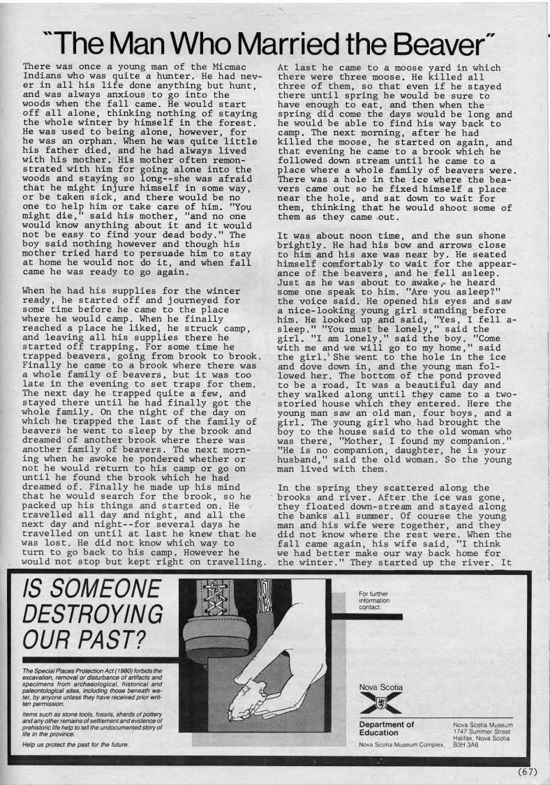 Published by Ronald Caplan on 1986/8/1 (151 reads)The Man Who Married the Beaver' There was once a young man of the Micmac Indians who was quite a hunter. He had nev? er in all his life done anything but hunt, and was always anxious to go into the woods when the fall came. He would start off all alone, thinking nothing of staying the whole winter by himself in the forest. He was used to being alone, however, for he was an orphan. When he was quite little his father died, and he had always lived with his mother. His mother often remon? strated with him for going alone into the woods and staying so long--she was afraid that he might injure himself in some way, or be taken sick, and there would be no one to help him or take care of him. "You might die," said his mother, "and no one would know anything about it and it would not be easy to find your dead body." The boy said nothing however and though his mother tried hard to persuade him to stay at home he would not do it, and when fall came he was ready to go again. When he had his supplies for the winter ready, he started off and journeyed for some time before he came to the place where he would camp. When he finally reached a place he liked, he struck camp, and leaving all his supplies there he started off trapping. For some time he trapped beavers, going from brook to brook. Finally he came to a brook where there was a whole family of beavers, but it was too late in the evening to set traps for them. The next day he trapped quite a few, and stayed there until he had finally got the whole family. On the night of the day on which he trapped the last of the family of beavers he went to sleep by the brook and dreamed of another brook where there was another family of beavers. The next morn? ing when he awoke he pondered whether or not he would return to his camp or go on until he found the brook which he had dreamed of. Finally he made up his mind that he would search for the brook, so he packed up his things and started on. He travelled all day and night, and all the next day and night--for several days he travelled on until at last he knew that he was lost. He did not know which way to turn to go back to his camp. However he would not stop but kept right on travelling. At last he came to a moose yard in which there were three moose. He killed all three of them, so that even if he stayed there until spring he would be sure to have enough to eat, and then when the spring did come the days would be long and he would be able to find his way back to camp. The next morning, after he had killed the moose, he started on again, and that evening he came to a brook which he followed down stream until he came to a place where a whole family of beavers were. There was a hole in the ice where the bea? vers came out so he fixed himself a place near the hole, and sat down to wait for them, thinking that he would shoot some of them as they came .out. It was about noon time, and the sun shone brightly. He had his bow and arrows close to him and his axe was near by. He seated himself comfortably to wait for the appear? ance of the beavers, and he fell asleep. Just as he was about to awake,, he heard some one speak to him. "Are you asleep?" the voice said. He opened his eyes and saw a nice-looking young girl standing before him. He looked up and said, "Yes, I fell a- sleep." "You must be lonely," said the girl. "I am lonely," said the boy. "Come with me and we will go to my home," said the girl.'- She went to the hole in the ice and dove down in, and the young man fol? lowed her. The bottom of the pond proved to be a road. It was a beautiful day and they walked along until they came to a two- storied house which they entered. Here the young man saw an old man, four boys, and a girl. The young girl who had brought the boy to the house said to the old woman who was there, "Mother, I found my companion." "He is no companion, daughter, he is your husband," said the old woman. So the young man lived with them. In the spring they scattered along the brooks and river. After the ice was gone, they floated down-stream and stayed along the banks all summer. Of course the young man and his wife were together, and they did not know where the rest were. When the fall came again, his wife said, "I think we had better make our way back home for the winter." They started up the river. It IS SOMEONE IMlBlll DESTROYING iM'P' OUR PAST? Y'''' Ttie special Places Protection Act (1980) forbids ttie '''??e- --JY / i / excavation, removal or disturbance of artifacts and ''''B '/' /aL-.' -*/ /x specimens from arctiaeological, historical and ''''H .' >?{ 'O / X' ' paleontological sites, including those beneath wa- ''''B * /y'
