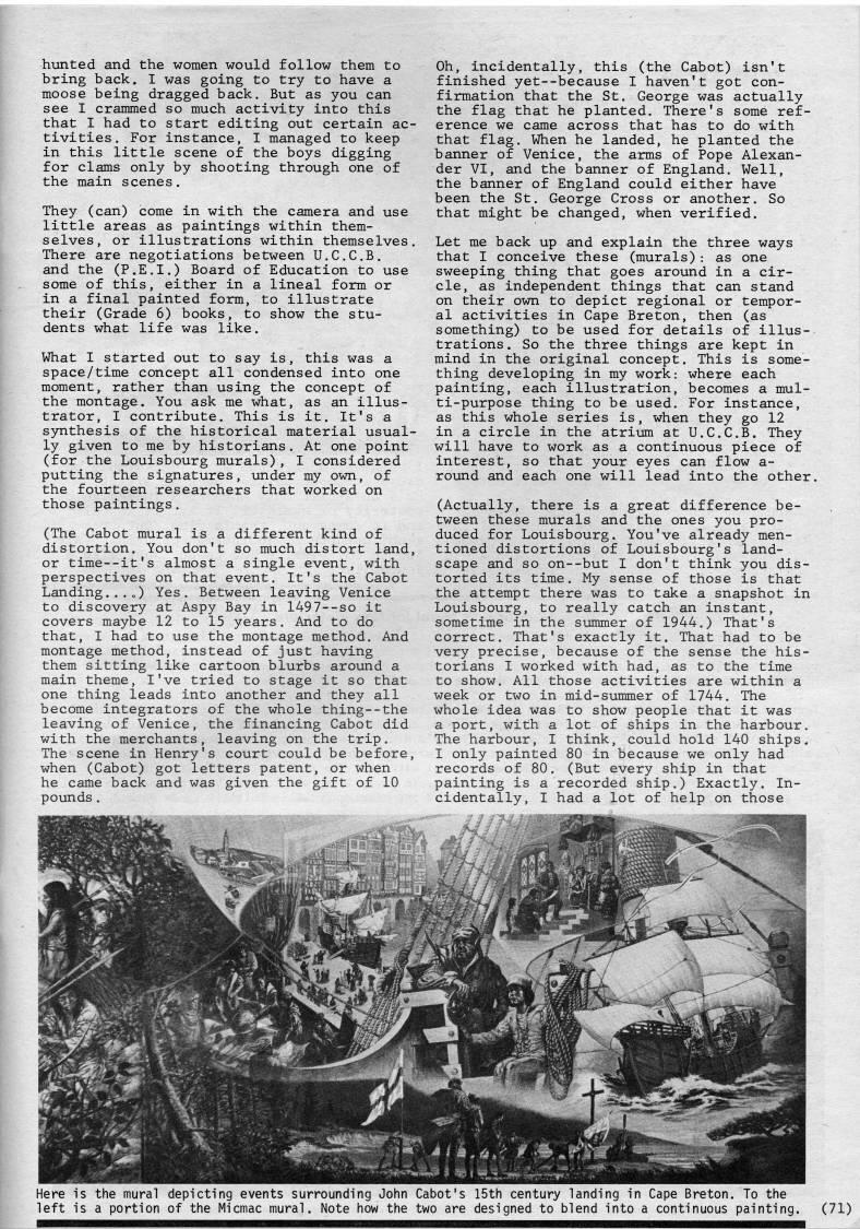 Published by Ronald Caplan on 1986/8/1 (236 reads)hunted and the women would follow them to bring back. I was going to try to have a moose being dragged back. But as you can see I crammed so much activity into this that I had to start editing out certain ac? tivities. For instance, I managed to keep in this little scene of the boys digging for clams only by shooting through one of the main scenes. They (can) come in with the camera and use little areas as paintings within them? selves, or illustrations within themselves. There are negotiations between U.C.CB. and the (P.E.I.) Board of Education to use some of this, either in a lineal form or in a final painted form, to illustrate their (Grade 6) books, to show the stu? dents what life was like. What I started out to say is, this was a space/time concept all condensed into one moment, rather than using the concept of the montage. You ask me what, as an illus? trator, I contribute. This is it. It's a S5mthesis of the historical material usual? ly given to me by historians. At one point (for the Louisbourg murals), I considered putting the signatures, under my own, of the fourteen researchers that worked on those paintings. (The Cabot mural is a different kind of distortion. You don't so much distort land, or time--it's almost a single event, with perspectives on that event. It's the Cabot Landing...,) Yes. Between leaving Venice to discovery at Aspy Bay in 1497--so it covers maybe 12 to 15 years. And to do that, I had to use the montage method. And montage method, instead of just having them sitting like cartoon blurbs around a main theme, I've tried to stage it so that one thing leads into another and they all become integrators of the whole thing--the leaving of Venice, the financing Cabot did with the merchants, leaving on the trip. The scene in Henry's court could be before, when (Cabot) got letters patent, or when he came back and was given the gift of 10 pounds. Oh, incidentally, this (the Cabot) isn't finished yet--because I haven't got con? firmation that the St. George was actually the flag that he planted. There's some ref? erence we came across that has to do with that flag. When he landed, he planted the banner of Venice, the arms of Pope Alexan? der VI, and the banner of England. Well, the banner of England could either have been the St. George Cross or another. So that might be changed, when verified. Let me back up and explain the three ways that I conceive these (murals): as one sweeping thing that goes around in a cir? cle, as independent things that can stand on their own to depict regional or tempor? al activities in Cape Breton, then (as something) to be used for details of illus? trations . So the three things are kept in mind in the original concept. This is some? thing developing in my work: where each painting, each illustration, becomes a mul? ti-purpose thing to be used. For instance, as this whole series is, when they go 12 in a circle in the atrium at U.C.C.B. They will have to work as a continuous piece of interest, so that your eyes can flow a- round and each one will lead into the other. (Actually, there is a great difference be? tween these murals and the ones you pro? duced for Louisbourg. You've already men? tioned distortions of Louisbourg's land? scape and so on--but I don't think you dis? torted its time. My sense of those is that the attempt there was to take a snapshot in Louisbourg, to really catch an instant, sometime in the simmer of 1944.) That's correct. That's exactly it. That had to be very precise, because of the sense the his? torians I worked with had, as to the time to show. All those activities are within a week or two in mid-summer of 1744. The whole idea was to show people that it was a port, with a lot of ships in the harbour. The harbour, I think, could hold 140 ships. I only painted 80 in because we only had records of 80, (But every ship in that painting is a recorded ship.) Exactly. In? cidentally, I had a lot of help on those Here is the mural depicting events surrounding John Cabot's 15th century landing in Cape Breton. To the left is a portion of the Micmac mural. Note how the two are designed to blend into a continuous painting.