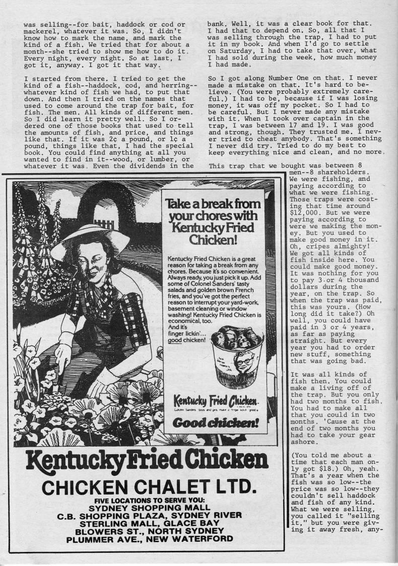 Published by Ronald Caplan on 1986/8/1 (323 reads)was selling--for bait, haddock or cod or mackerel, whatever it was. So, I didn't know how to mark the name, and mark the kind of a fish. We tried that for about a month--she tried to show me how to do it. Every night, every night. So at last, I got it, an3A?7ay. I got it that way. I started from there. I tried to get the kind of a fish--haddock, cod, and herring-- whatever kind of fish we had, to put that down. And then I tried on the names that used to come around the trap for bait, for fish. The men. All kinds of different men. So I did leam it pretty well. So I or? dered one of those books that used to tell the amounts of fish, and price, and things like that. If it was 2c a pound, or Ic a pound, things like that, I had the special book. You could find anything at all you wanted to find in it--wood, or lumber, or whatever it was • Even the dividends in the Kgdtiicl'EtiedCliickeii CHICKEN CHALET LTD. FIVE LOCATIONS TO SERVE YOU: SYDNEY SHOPPING MALL CB. SHOPPING PLAZA, SYDNEY RIVER STERLING MALL, GLACE BAY BLOWERS ST., NORTH SYDNEY PLUMMER AVE., NEW WATERFORD bank. Well, it was a clear book for that, I had that to depend on. So, all that I was selling through the trap, I had to put it in my book. And when I'd go to settle on Saturday, I had to take that over, what I had sold during the week, how much money I had made. So I got along Number One on that. I never made a mistake on that. It's hard to be? lieve. (You were probably extremely care? ful,) I had to be, because if I was losing money, it was off my pocket. So I had to be careful. But I never made any mistake with it. When I took over captain in the trap, I was between 17 and 19. I was good and strong, though. They trusted me. I nev? er tried to cheat anybody. That's something I never did try. Tried to do my best to keep everything nice and clean, and no more. This trap that we bought was between 8 I men--8 shareholders. We were fishing, and paying according to what we were fishing. Those traps were cost? ing that time around $12,000. But we were paying according to were we making the mon? ey. But you used to make good money in it. Oh, cripes almighty! We got all kinds of fish inside here. You could make good money. It was nothing for you to pay 3-or 4 thousand dollars during the year, on the trap. So when the trap was paid, this was yours. (How long did it take?) Oh well, you could have paid in 3 or 4 years, as far as paying straight. But every year you had to order new stuff, something that was going bad. It was all kinds of fish then. You could make a living off of the trap. But you only had two months to fish, You had to make all that you could in two months. 'Cause at the end of two months you had to take your gear ashore, (You told me about a time that each man on? ly got $18.) Oh, yeah. That's a year when the fish was so low--the price was so low--they couldn't sell haddock and fish of any kind. What we were selling, you called it "selling it," but you were giv? ing it away fresh, any-