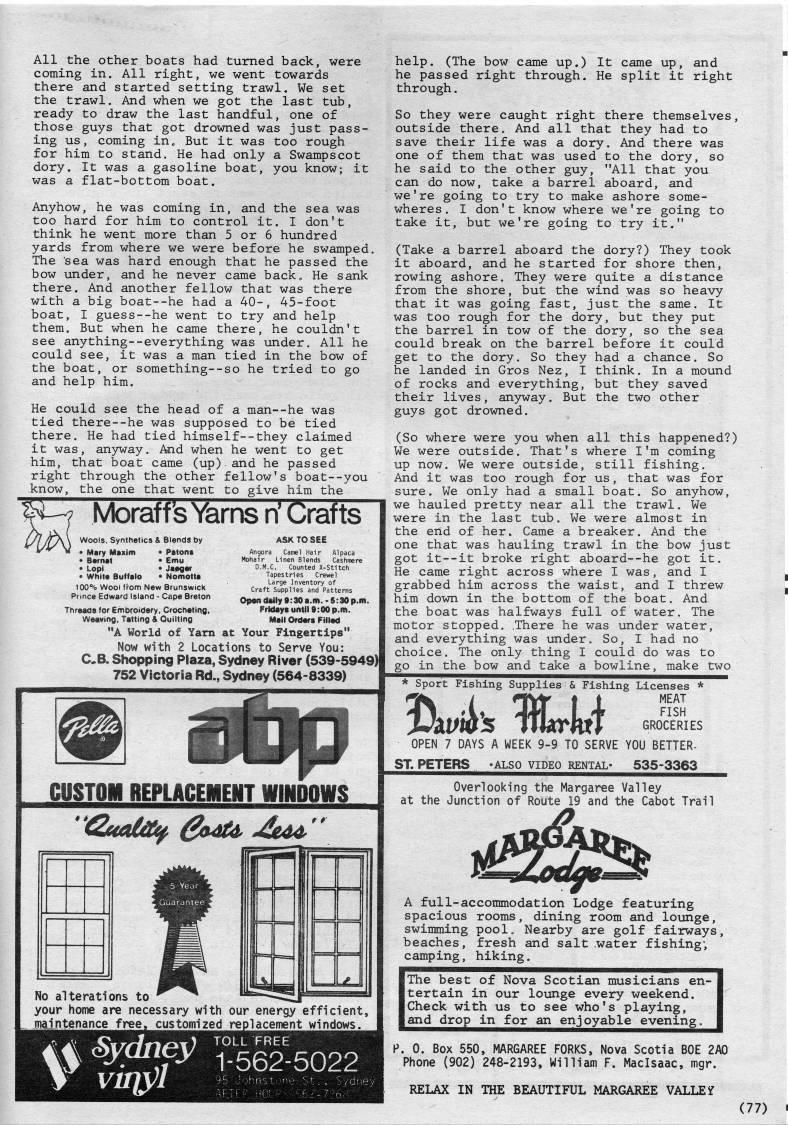Published by Ronald Caplan on 1986/8/1 (176 reads)All the other boats had turned back, were coming in. All right, we went towards there and started setting trawl. We set the trawl. And when we got the last tub, ready to draw the last handful, one of those guys that got drowned was just pass? ing us, coming in. But it was too rough for him to stand. He had only a Swampscot dory. It was a gasoline boat, you know; it was a flat-bottom boat. Anyhow, he was coming in, and the sea was too hard for him to control it. I don't think he went more than 5 or 6 hundred yards from where we were before he swamped. The sea was hard enough that he passed the bow under, and he never came back • He sank there. And another fellow that was there with a big boat--he had a 40-, 45-foot boat, I guess--he went to try and help them. But when he came there, he couldn't see anything--everything was under. All he could see, it was a man tied in the bow of the boat, or something--so he tried to go and help him. He could see the head of a man--he was tied there--he was supposed to be tied there. He had tied himself--they claimed it was, anyway, .'d when he went to get him, that boat came (up) and he passed right through the other fellow's boat--you know, the one that went to give him the Moraf f's Yarns n' Crafts Wools. Synthetics & Blends by • Mary Maxim • Patont • Bernal • Emu • Lopi • Jaeger • White Buffalo • Nomolta 100% Wool from New Brunswick Prince Edward Island - Cape Breton Threads for Embroidery, Crocheting- Weaving, Tatting & Ouilting ASK TO SEE Angora Camel Hair Alpaca Mohair Linen Blends Cashmere D.M.C. Counted X-Stitch Tapestries Crewel Large Inventory of Craft Supplies and Patterns Open daily 9:30 a.m. • 5:30 p.m. Friday* until 9:00 p.m. Mall Orders Filled "A World of Yam at Your Fingertips" Now with 2 Locations to Serve You: CB. Shopping Plaza, Sydney River (539-5949) 752 Victoria Rd., Sydney (564-8339) *'QmtlUbf. ('a4U '4M4e'' No alterations to your home are necessary with our energy efficient, maintenance free, customized replacement windows. help. (The bow came up.) It came up, and he passed right through. He split it right through. So they were caught right there themselves, outside there. And all that they had to save their life was a dory. And there was one of them that was used to the dory, so he said to the other guy, "All that you can do now, take a barrel aboard, and we're going to try to make ashore some? wheres. I don't know where we're going to take it, but we're going to try it." (Take a barrel aboard the dory?) They took it aboard, and he started for shore then, rowing ashore. They were quite a distance from the shore, but the wind was so heavy that it was going fast, just the same. It was too rough for the dory, but they put the barrel in tow of the dory, so the sea could break on the barrel before it could get to the dory. So they had a chance. So he landed in Gros Nez, I think. In a mound of rocks and everything, but they saved their lives, anyway. But the two other guys got drowned. (So where were you when all this happened?) We were outside. That's where I'm coming up now. We were outside, still fishing. And it was too rough for us, that was for sure. We only had a small boat. So anyhow, we hauled pretty near all the trawl. We were in the last tub. We were almost in the end of her. Came a breaker. And the one that was hauling trawl in the bow just got it--it broke right aboard--he got it. He came right across where I was, and I grabbed him across the waist, and I threw him down in the bottom of the boat. And the boat was halfways full of water. The motor stopped. .There he was under water, and everything was under. So, I had no choice. The only thing I could do was to go in the bow and take a bowline, make two f Sydney 1-562-5022 * Sport Fishing Supplies & Fishing Licenses 3Uv ' '' - ILU GROCERIES OPEN 7 DAYS A WEEK 9-9 TO SERVE YOU BETTER- ST. PETERS -ALSO video rental- 535-3363 Overlooking the Margaree Valley at the Junction of Route 19 and the Cabot Trail A full-accommodation Lodge featuring spacious rooms, dining room and lounge, swimming pool • Nearby are golf fairways, beaches, fresh and salt .water fishing; camping, hiking. The best of Nova Scotian musicians en? tertain in our lounge every weekend. Check with us to see who's playing, and drop in for an enjoyable evening. P. 0. Box 550, MARGAREE FORKS, Nova Scotia BOE 2A0 Phone (902) 248-2193, William F. Maclsaac, mgr. RELAX IN THE BEAUTIFUL MARGAREE VALLEf (77)