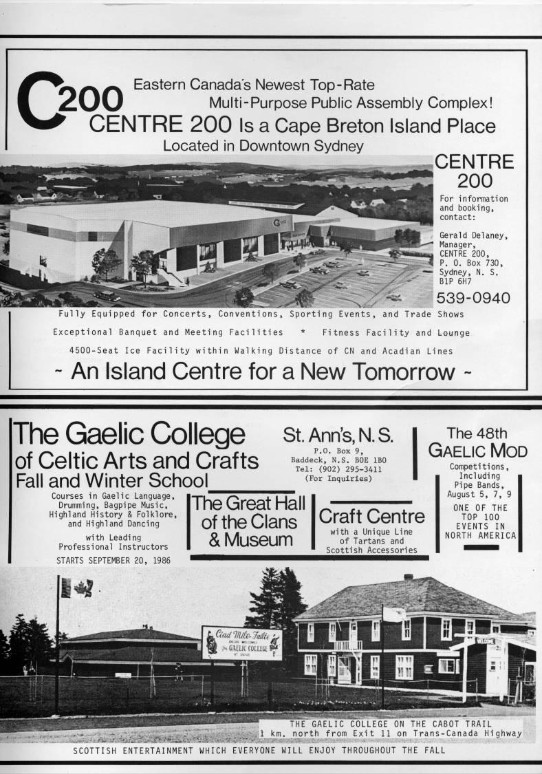 Published by Ronald Caplan on 1986/8/1 (138 reads)c y%ff Eastern Canada's Newest Top-Rate 'JJ Multi-Purpose Public Assembly Complex! CENTRE 200 Is a Cape Breton Island Place Located in Downtown Sydney CENTRE 200 For information and booking, contact: Gerald Delaney, Manager, CENTRE 200, P. 0. Box 730, • Sydney, N. S. BIP 6H7 539-0940 Fully Equipped for Concerts, Conventions, Sporting Events, and Trade Shows Exceptional Banquet and Meeting Facilities * Fitness Facility and Lounge 4500-Seat Ice Facility within Walking Distance of CN and Acadian Lines - An Island Centre for a New Tomorrow - The Gaelic College st. Anns, n. s. of Celtic Arts and Crafts Fall and Winter School P.O. Box 9, Baddeck, N.S. BOE IBO Tel: (902) 295-3411 (For Inquiries) Courses in Gaelic Language, Drumming, Bagpipe Music, Highland History & Folklore, and Highland Dancing with Leading Professional Instructors STARTS SEPTEMBER 20, 1986 The Great Hall of the Clans & Museum Craft Centre with a Unique Line of Tartans and Scottish Accessories The 48th Gaelic Mod Competitions, Including Pipe Bands, August 5, 7, 9 ONE OF THE TOP 100 EVENTS IN NORTH AMERICA THE GAELIC COLLEGE ON THE CABOT TRAIL _ - ., ';.::,w' • .'-'*>-??-. • • • ? ' 1 km. north from Exit 11 on Trans-Canada Highway SCOTTISH ENTERTAINMENT WHICH EVERYONE WILL ENJOY THROUGHOUT THE FALL