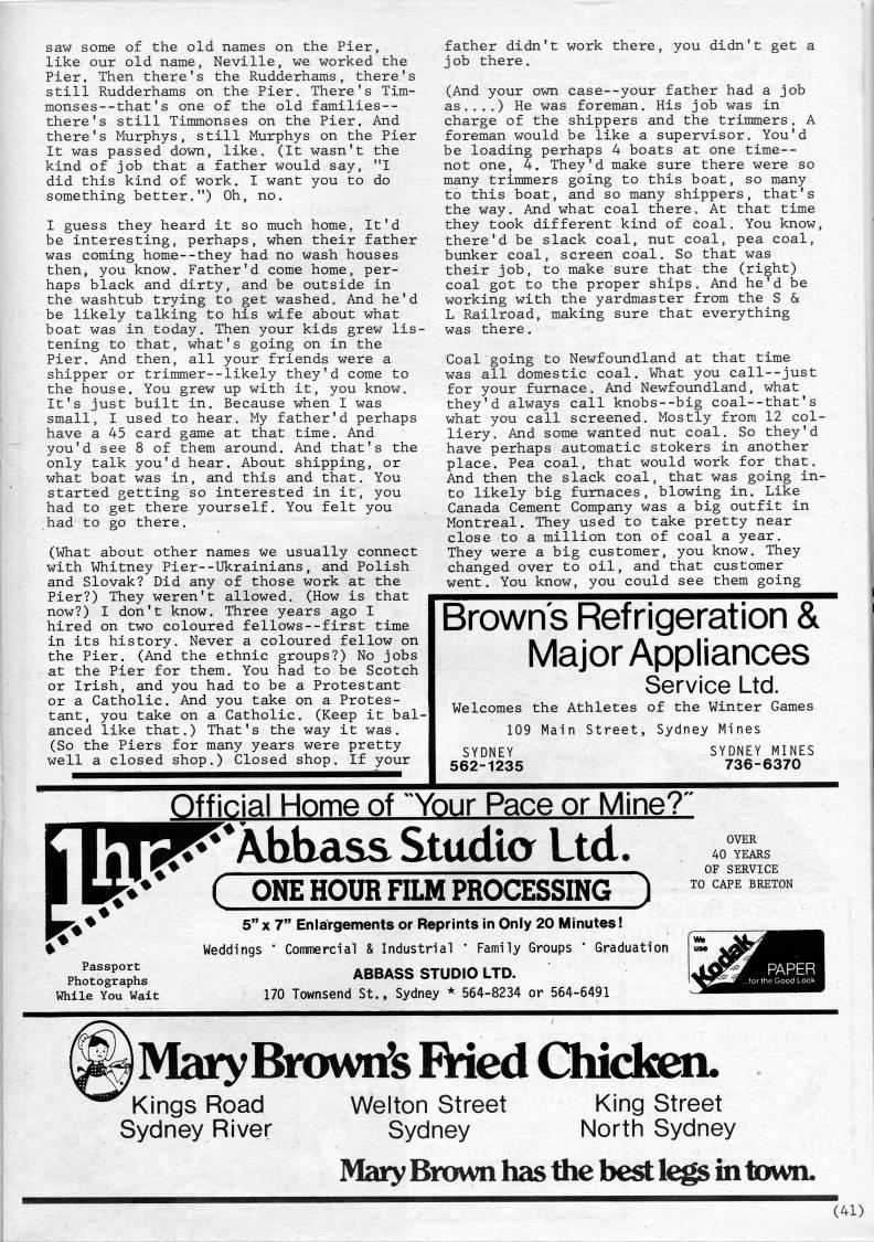 Published by Ronald Caplan on 1987/1/1 (343 reads)saw some of the old names on the Pier, like our old name, Neville, we worked the Pier. Then there's the Rudderhams, there's still Rudderhams on the Pier. There's Tim? mons es-- that ' s one of the old families-- there's still Timmonses on the Pier. And there's Murphys, still Murphys on the Pier It was passed down, like. (It wasn't the kind of job that a father would say, "I did this kind of work. I want you to do something better.") Oh, no. I guess they heard it so much home, It'd be interesting, perhaps, when their father was coming home--they had no wash houses then, you know. Father'd come home, per? haps black and dirty, and be outside in the washtub trying to get washed. And he'd be likely talking to his wife about what boat was in today. Then your kids grew lis? tening to that, what's going on in the Pier. And then, all your friends were a shipper or trimmer--likely they'd come to the house. You grew up with it, you know. It's just built in. Because when I was small, I used to hear. My father'd perhaps have a 45 card game at that time. And you'd see 8 of them around. And that's the only talk you'd hear. About shipping, or what boat was in, and this and that. You started getting so interested in it, you had to get there yourself. You felt you had to go there. (What about other names we usually connect with Whitney Pier--Ukrainians, and Polish and Slovak? Did any of those work at the Pier?) They weren't allowed. (How is that now?) I don't know. Three years ago I hired on two coloured fellows--first time in its history. Never a coloured fellow on the Pier. (And the ethnic groups?) No jobs at the Pier for them. You had to be Scotch or Irish, and you had to be a Protestant or a Catholic. And you take on a Protes? tant, you take on a Catholic. (Keep it bal? anced like that.) That's the way it was. (So the Piers for many years were pretty well a closed shop.) Closed shop. If your father didn't work there, you didn't get a job there. (And your own case--your father had a job as....) He was foreman. His job was in charge of the shippers and the trimmers. A foreman would be like a supervisor. You'd be loading perhaps 4 boats at one time-- not one, 4. They'd make sure there were so many trimmers going to this boat, so many to this boat, and so many shippers, that's the way. And what coal there • At that time they took different kind of coal. You know, there'd be slack coal, nut coal, pea coal, bunker coal, screen coal. So that was their job, to make sure that the (right) coal got to the proper ships. And he'd be working with the yardmaster from the S & L Railroad, making sure that everything was there. Coal going to Newfoundland at that time was all domestic coal. What you call--just for your furnace. And Newfoundland, what they'd always call knobs--big coal--that's what you call screened. Mostly from 12 col? liery. And some wanted nut coal. So they'd have perhaps automatic stokers in another place. Pea coal, that would work for that. And then the slack coal, that was going in? to likely big furnaces, blowing in. Like Canada Cement Company was a big outfit in Montreal. They used to take pretty near close to a million ton of coal a year. They were a big customer, you know. They changed over to oil, and that customer went. You know, you could see them going Brown's Refrigeration & Major Appliances Service Ltd. Welcomes the Athletes of the Winter Games 109 Main Street, Sydney Mines SYDNEY 562-1235 SYDNEY MINES 736-6370 Passport Photographs While You Wait Official Home of "Your Pace or Mine? l''Khhass Studta Ltd. ONE HOUR FILM PROCESSING' 5" X 7" Enlargements or Reprints in Only 20 Minutes! Weddings * Commercial & Industrial ' Family Groups * Graduation ABBASS STUDIO LTD. 170 Townsend St., Sydney * 564-8234 or 564-6491 OVER 40 YEARS OF SERVICE TO CAPE BRETON Mary Bixnvrfs FHed Chicken. Kings Road Sydney River Welton Street Sydney King Street Nortii Sydney Maify Brown has the best 1' in towiL