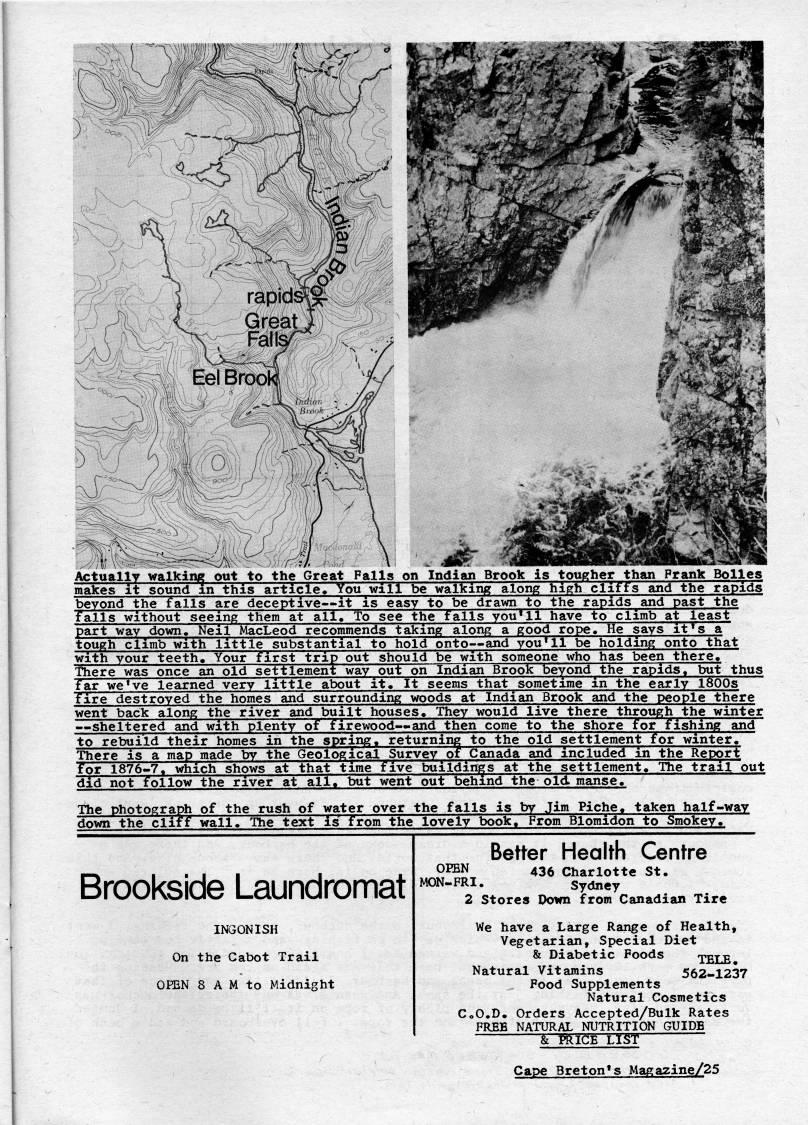 Published by Ronald Caplan on 1974/6/1 (759 reads)walking out to the Great Falls on Indian Brook is tougher than Prank Bolles sound in this article. You will be walking along high cliffs and the rapids e falls are deceptive • it is easy to be drawn to the rapids and past the makes it '_' '_ beyond the falls are deceptive--it is easy to be drawn to the rapids'and past falls without seeing them at all. To see the falls you'll have to climb at least" part way down. Neil MacLeod recommends taking along a good rope. He says it's a tough climb with little substantial to hold onto--and you'll be holding onto that with vour teeth. Your first trip out should be with someone who has been there. There was once an old settlement way out on Indian Brook beyond the rapids, but thus far we've learned very little about it. It seems that sometime in the early 1800s fire destroyed the homes and surrounding woods at Indian Brook and the people there " " * ' ??' river a - ?? - • • • - plenty to rebuild their homes in the spring, returning ' There is a map made by the Geological Survey of Canada and included in the Report for 1876-7. which shows at that time five buildings at the settlement. The trail ou did not follow the river at all, but went out behind the old manseT The photograph of the rush of water over the falls is by Jim Piche. taken half-way down the cliff wall. The text is from the lovely book. Prom Blomidon to Smokey. went back along the river and built houses. They would live there through the winter • sheltered and with plenty of firewood • and then come to the shore for fishing and returning to the old settlement for winter. Brookside Laundromat INGONISH On the Cabot Trail OPEN 8 A M to Midnight Better Health Centre OPEN 436 Charlotte St. MON-FRI. Sydney 2 Stores Down from Canadian Tire We have a Large Range of Health, Vegetarian, Special Diet & Diabetic Poods TELE Natural Vitamins 562-1237 Pood Supplements Natural Cosmetics CoO.D. Orders Accepted/Bulk Rates FREE NATURAL NUTRITION GUIDE & Mice List Cape Breton's Magazine/25