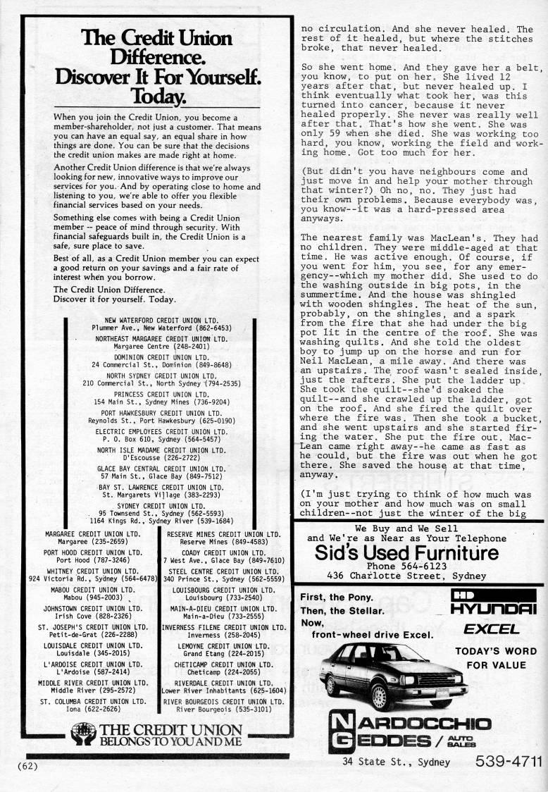Published by Ronald Caplan on 1987/1/1 (211 reads)Hie Credit Union Difference. EMscover It For'burself. Today. When you join the Credit Union, you become a member-shareholder, not just a customer. That means you can have an equal say, an equal share in how things are done. You can be sure that the decisions the credit union makes are made right at home. Another Credit Union difference is that we're always looking for new, innovative ways to improve our services for you. And by operating close to home and listening to you, we're able to offer you flexible financial services based on your needs. Something else comes with being a Credit Union member ~ peace of mind through security. With financial safeguards built in, the Credit Union is a safe, sure place to save. Best of all, as a Credit Union member you can expect a good return on your savings and a fair rate of interest when you borrow. The Credit Union Difference. Discover it for yourself. Today. NEW WATERFORD CREDIT UNION LTD. Plummer Ave., New Waterford (862-6453) NORTHEAST MARGAREE CREDIT UNIO'f LTD. Margaree Centre (248-2401) DOMINION CREDIT UNION LTD. 24 Commercial St., Dominion (849-8648) NORTH SYDNEY C~REDIT UNION LTD. 210 Commercial St., North Sydney (794-2535) PRINCESS CREDIT UNION LTD. 154 Main St., Sydney Mines (736-9204) PORT HAWKESBURY CREDIT UNION LTD. Reynolds St., Port Hawkesbury (625-0190) ELECTRIC EMPLOYEES CREDIT UNION LTD. P. 0. Bo)< 610, Sydney (564-5457) NORTH ISLE MADAME CREDIT UNION LTD. D'Escousse (226-2722) GLACE BAY CENTRAL CREDIT UNION LTD. 57 Main St., Glace Bay (849-7512) BAY ST. LAWRENCE CREDIT UNION LTD. St. Margarets Village (383-2293) SYDNEY CREDIT UNION LTD. . 95 Townsend St., Sydney (562-5593) 1164 Kings Rd., Sydney River (539-1684) MARGAREE CREDIT UNION LTD. Margaree (235-2659) PORT HOOD CREDIT UNION LTD. Port Hood (787-3246) WHITNEY CREDIT UNION LTD. 924 Victoria Rd., Sydney (564-6478) MABOU CREDIT UNION LTD. Mabou (945-2003) ' JOHNSTOWN CREDIT UNION LTD. Irish Cove (828-2326) ST. JOSEPH'S CREDIT UNION LTD. Petit-de-Grat (226-2288) LOUISDALE CREDIT UNION LTD. Louisdale (345-2015) L'ARDOISE CREDIT UNION LTD. L'Ardoise (587-2414) MIDDLE RIVER CREDIT UNION LTD. Middle River (295-2572) ST. COLUMBA CREDIT UNION LTD. lona (622-2626) RESERVE MINES CREDIT UNION LTD. Reserve Mines (849-4583) COADY CREDIT UNION LTD. 7 West Ave., Glace Bay (849-7610) STEEL CENTRE CREDIT UNION LTD. 340 Prince St., Sydney (562-5559) LOUISBOURG CREDIT UNION LTD. Louisbourg (733-2540) MAIN-A-DIEU CREDIT UNION LTD. Main-a-Dieu (733-2555) INVERNESS FILENE CREDIT UNION LTD. Inverness (258-2045) LEMOYNE CREDIT UNION LTD. Grand Etang (224-2015) CHETICAMP CREDIT UNION LTD. Cheticamp (224-2055) RIVERDALE CREDIT UNION LTD. Lower River Inhabitants (625-1604) RIVER BOURGEOIS CREDIT UNION LTD. River Bourgeois (535-3101) THE CREDIT UNION BELONGS TO YOU AND ME no circulation. And she never healed. The rest of it healed, but where the stitches broke, that never healed. So she went home. And they gave her a belt, you know, to put on her • She lived 12 years after that, but never healed up. I think eventually what took her, was this turned into cancer, because it never healed properly. She never was really well after that. That's how she went. She was only 59 when she died. She was working too hard, you know, working the field and work? ing home. Got too much for her. (But didn't you have neighbours come and just move in and help your mother through that winter?) Oh no, no. They just had their own problems. Because everybody was, you know--it was a hard-pressed area an57ways. The nearest family was MacLean's. They had no children. They were middle-aged at that time. He was active enough. Of course, if you went for him, you see, for any emer? gency- -which my mother did. She used to do the washing outside in big pots, in the siramertime. And the house was shingled with wooden shingles. The heat of the sun, probably, on the shingles, and a spark from the fire that she had under the big pot lit in the centre of the roof. She was washing quilts. And she told the oldest boy to jump up on the horse and run for Neil MacLean, a mile away. And there was an upstairso The roof wasn't sealed inside, just the rafters. She put the ladder up • She took the quilt--she'd soaked the quilt--and she crawled up the ladder, got on the roof. And she fired the quilt over where the fire was. Then she took a bucket, and she went upstairs and she started fir? ing the water. She put the fire out. Mac- Lean came right away--he came as fast as he could, but the fire was out when he got there. She saved the house at that time, anyway. (I'm just trying to think of how much was on your mother and how much was on small children--not just the winter of the big We Buy and We Sell and We're as Near as Your Telephone Sid s Used Furniture Phone 564-6123 436 Charlotte Street, Sydney First, the Pony. Then, the Stellar. Now, front-wheel drive Excel. (62) HYUnOPII EXCEL TODAY'S WORD FOR VALUE 34 State St 539-4711
