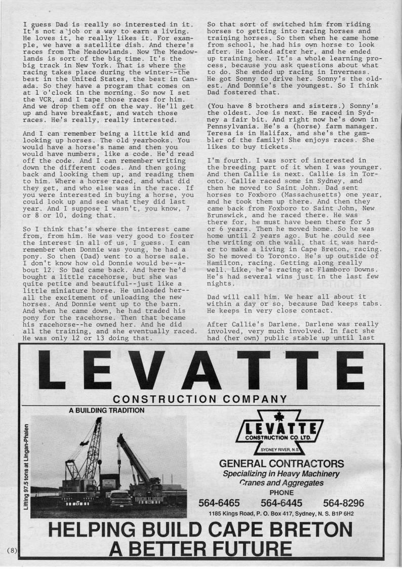 I guess Dad is really so interested in it. It's not a'job or a way to earn a living. He loves it, he really likes it. For exam? ple, we have a satellite dish. And there's races from The Meadowlands. Now The Meadow- lands is sort of the big time. It's the big track in New York. That is where the racing takes place during the winter--the best in the United States, the best in Can? ada. So they have a program that comes on at 1 o'clock in the morning. So now I set the VCR, and I tape those races for him. And we drop them off on the way. He'll get up and have breakfast, and watch those races. He's really, really interested. And I can remember being a little kid and looking up horses, The old yearbooks. You would have a horse's name and then you would have numbers, like a code. He'd read off the code. And I can remember writing down the different codes. And then going back and looking them up, and reading them to him. Where a horse raced, and what did they get, and who else was in the race. If you were interested in buying a horse, you could look up and see what they did last year. And I suppose I wasn't, you know, 7 or 8 or 10, doing that. So I think that's where the interest came from, from him. He was very good to foster the interest in all of us, I guess. I can remember when Donnie was young, he had a pony. So then (Dad) went to a horse sale. I don't know how old Donnie would be--a- bout 12. So Dad came back. And here he'd bought a little racehorse, but she was quite petite and beautiful--just like a little miniature horse. He unloaded her-- all the excitement of unloading the new horses. And Donnie went up to the barn. And when he came down, he had traded his pony for the racehorse. Then that became his racehorse--he owned her. And he did all the training, and she eventually raced. He was only 12 or 13 doing that. So that sOrt of switched him from riding horses to getting into racing horses and training horses. So then when he came home from school, he had his own horse to look after. He looked after her, and he ended up training her. It's a whole learning pro? cess, because you ask questions about what to do. She ended up racing in Inverness. He got Sonny to drive her. Sonny's the old? est. And Donnie's the youngest. So I think Dad fostered that. (You have 8 brothers and sisters.) Sonny's the oldest. Joe is next. He raced in Syd? ney a fair bit. And right now he's down in Pennsylvania. He's a (horse) farm manager. Teresa is in Halifax, and she's the gam? bler of the family! She enjoys races. She likes to buy tickets, I'm fourth. I was sort of interested in the breeding part of it when I was younger. And then Callie is next. Callie is in Tor? onto. Callie raced some in Sydney, and then he moved to Saint John. Dad sent horses to Foxboro (Massachusetts) one year, and he took them up there. And then they came back from Foxboro to Saint John, New Brunswick, and he raced there. He was there for, he must have been there for 5 or 6 years. Then he moved home. So he was home until 2 years ago. But he could see the writing on the wall, that it, was hard? er to make a living in Cape Breton, racing. So he moved to Toronto. He's up outside of Hamilton, racing. Getting along really well. Like, he's racing at Flamboro Downs. He's had several wins just in the last few nights. Dad will call him. We hear all about it within a day or so, because Dad keeps tabs. He keeps in very close contact. After Callie's Darlene. Darlene was really involved, very much involved. In fact she had (her own) public stable up until last LEVATTE CONSTRUCTION COMPANY / CONSTI LEVATTE CONSTRUCTION CO. LTD. SYDNEY RIVER, N.S? GENERAL CONTRACTORS Specializing in Heavy Machinery Cranes and Aggregates PHONE 564-6465 564-6445 564-8296 1185 Kings Road, P. O. Box 417, Sydney, N. S. B1P 6H2 HELPING BUILD CAPE BRETON A BETTER FUTURE