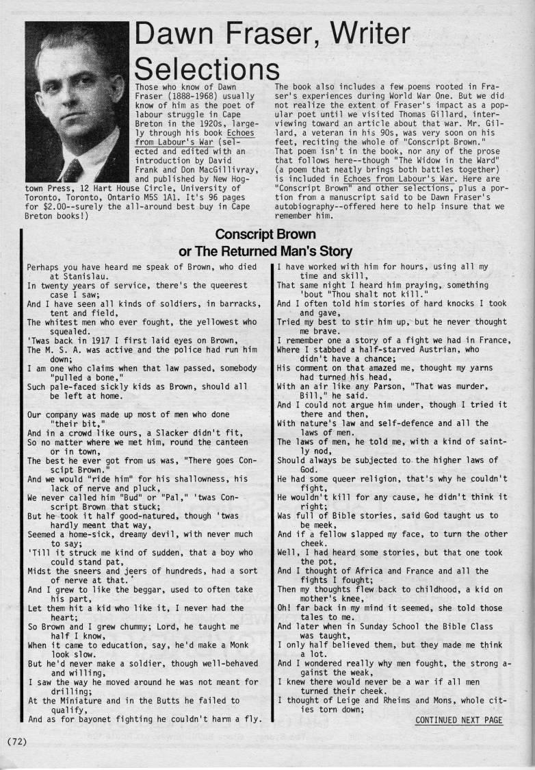 Published by Ronald Caplan on 1987/6/1 (802 reads)Dawn Fraser, Writer Selections Those who know of Dawn Fraser (1888-1968) usually know of him as the poet of labour struggle in Cape Breton in the 1920s, large? ly through his book Echoes from Labour's War (sel? ected and edited with an introduction by David Frank and' Don MacGillivray, and published by New Hog- town Press, 12 Hart House Circle, University of Toronto, Toronto, Ontario MBS lAl. It's 96 pages for $2.00--surely the all-around best buy in Cape Breton books!) The book also includes a few poems rooted in Fra? ser's experiences during World War One. But we did not realize the extent of Fraser's impact as a pop? ular poet until we visited Thomas Gillard, inter? viewing toward an article about that war. Mr. Gil? lard, a veteran in his 90s, was very soon on his feet, reciting the whole of "Conscript Brown." That poem isn't in the book, nor any of the prose that follows here--though "The Widow in the Ward" (a poem that neatly brings both battles together) is included in Echoes from Labour's War. Here are "Conscript Brown" and other selections, plus a por? tion from a manuscript said to be Dawn Fraser's autobiography • offered here to help insure that we remember him. Conscript Brown or The Returned Man's Story Perhaps you have heard me speak of Brown, who died at Stanislau. In twenty years of service, there's the queerest case I saw; And I have seen all kinds of soldiers, in barracks, tent and field, The whitest men who ever fought, the yellowest who squealed. 'Twas back in 1917 I first laid eyes on Brown, The M. S. A. was active and the police had run him down; I am one who claims when that law passed, somebody "pulled a bone," Such pale-faced sickly kids as Brown, should all be left at home. Our company was made up most of men who done "their bit," And in a crowd like ours, a Slacker didn't fit. So no matter where we met him, round the canteen or in town. The best he ever got from us was, "There goes Con- scipt Brown." And we would "ride him" for his shallowness, his lack of nerve and pluck. We never called him "Bud" or "Pal," 'twas Con? script Brown that stuck; But he took it half good-natured, though 'twas hardly meant that way. Seemed a home-sick, dreamy devil, with never much to say; 'Till it struck me kind of sudden, that a boy who could stand pat. Midst the sneers and jeers of hundreds, had a sort of nerve at that.' And I grew to like the beggar, used to often take his part. Let them hit a kid who like it, I newer had the heart; So Brown and I grew chummy; Lord, he taught me half I know. When it came to education, say, he'd make a Monk look slow. But he'd never make a soldier, though well-behaved and willing, I saw the way he moved around he was not meant for drilling; At the Miniature and in the Butts he failed to qualify, And as for bayonet fighting he couldn't harm a fly. I have worked with him for hours, using all my time and skill, That same night I heard him praying, something 'bout "Thou Shalt not kill." And I often told him stories of hard knocks I took and gave. Tried my best to stir him up, but he never thought me brave. I remember one a story of a fight we had in France, Where I stabbed a half-starved Austrian, who didn't have a chance; His comment on that amazed me, thought my yarns had turned his head. With an air like any Parson, "That was murder. Bill," he said. And I could not argue him under, though I tried it there and then. With nature's law and self-defence and all the laws of men. The laws of men, he told me, with a kind of saint? ly nod. Should always be subjected to the higher laws of God. He had some queer religion, that's why he couldn't fight. He wouldn't kill for any cause, he didn't think it right; Was full of Bible stories, said God taught us to be meek. And if a fellow slapped my face, to turn the other cheek. Well, I had heard some stories, but that one took the pot. And I thought of Africa and France and all the fights I fought; Then my thoughts flew back to childhood, a kid on mother's knee. Oh! far back in my mind it seemed, she told those tales to me. And later when in Sunday School the Bible Class was taught, I only half believed them, but they made me think a lot. And I wondered really why men fought, the strong a- gainst the weak, I knew there would never be a war if all men turned their cheek. I thought of Leige and Rheims and Mons, whole cit? ies torn down; CONTINUED NEXT PAGE (72)