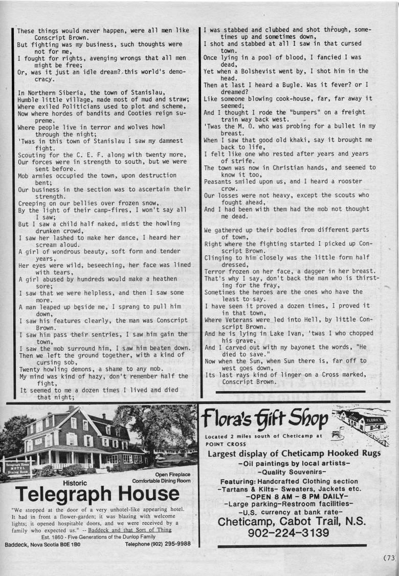 Published by Ronald Caplan on 1987/6/1 (269 reads)These things would never happen, were all men like Conscript Brown. But fighting was my business, such thoughts were not for me, I fought for rights, avenging wrongs that all men might be free; Or, was it just an idle dream?-this world's demo? cracy. In Northern Siberia, the town of Stanislau, Humble little village, made most of mud and straw; Where exiled Politicians used to plot and scheme. Now where hordes of bandits and Cooties reign su? preme . Where people live in terror and wolves howl through the night; 'Twas in this town of Stanislau I saw my damnest fight. Scouting for the C. E. F. along with twenty more. Our forces were in strength to south, but we were sent before. Mob armies occupied the town, upon destruction bent; Our business in the section was to ascertain their strength. Creeping on our bellies over frozen snow,. By the light of their camp-fires, I won't say all I saw; But I saw a child half naked, midst the howling drunken crowd, I saw her lashed to make her dance, I heard her scream aloud. A girl of wondrous beauty, soft form and tender years, Her eyes were wild, beseeching, her face was lined with tears, A girl abused by hundreds would make a heathen sore; I saw that we were helpless, and then I saw some more. A man leaped up beside me, I sprang to pull him down, I saw his features clearly, the man was Conscript Brown. I saw him pass their sentries, I saw him gain the town, I saw the mob surround him, I saw him beaten down. Then we left the ground together, with a kind of cursing sob. Twenty howling demons, a shame to any mob. My mind was kind of hazy, don't remember half the fight. It seemed to me a dozen times I lived and died that night; I was stabbed and clubbed and shot through, some? times up and sometimes down, I shot and stabbed at all I saw in that cursed town. Once lying in a pool of blood, I fancied I was dead. Yet when a Bolshevist went by, I shot him in the head. Then at last I heard a Bugle. Was it fever? or I dreamed? Like someone blowing cook-house, far, far away it seemed; And I thought I rode the "bumpers" on a freight train way back west. , 'Twas the M. 0. who was probing for a bullet in my breast. When I saw that good old khaki, say it brought me back to life, I felt like one who rested after years and years of strife. The town was now in Christian hands, and seemed to know it too. Peasants smiled upon us, and I heard a rooster crow. Our losses were not heavy, except the scouts who fought ahead. And I had been with them had the mob not thought me dead. We gathered up their bodies from different parts of town. Right where the fighting started I picked up Con? script Brown. Clinging to him closely was the little form half dressed. Terror frozen on her face, a dagger in her breast. That's why I say, don't back the man who is thirst? ing for the fray. Sometimes the heroes are the ones who have the least to say. I have seen it proved a dozen times, I proved it in that town. Where Veterans were led into Hell, by little Con? script Brown. And he is lying in Lake Ivan, 'twas I who chopped his grave. And I carved out with my bayonet the words, "He died to save." Now when the Sun, when Sun there is, far off to west goes down. Its last rays kind of linger on a Cross marked. Conscript Brown. Historic Comfortable Dining Room Telegraph House "We stopped at the door of a very unhotel-like appearing hotel. It had in front a flower-garden; it was blazing with welcome lights; it opened hospitable doors, and we were received by a family who expected us." - Baddeck and that Sort of Thing Est. 1860 - Five Generations of the Dunlop Family Baddeck, Nova Scotia BOE 1 BO Telephone (902) 295-9988 fora*s'??iftShop Located 2 miles south of Cheticamp at POINT CROSS Largest display of Cheticamp Hooked Rugs -Oil paintings by local artists- -Quality Souvenirs- Featuring: Handcrafted Clothing section -Tartans & Kilts- Sweaters, Jackets etc. -OPEN 8 AM - 8 PM DAILY- -Large parking-Restroom facllitles- -U.S. currency at bank rate- Cheticamp, Cabot Trail, N.S. 902-224-3139 (73: