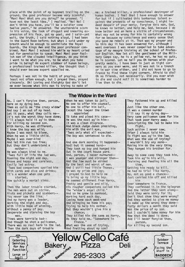 Published by Ronald Caplan on 1987/6/1 (171 reads)place with the point of my bayonet trailing on the ground, the good professor became wery scornful. "Man! Man! What are you doing?" he groaned; "I have not the least idea," I replied. "No! No! I don't think you have, you'll be a soldier come twelve years," he answered. The unutterable scorn in his voice, the look of disgust and sneering ex? pression of his face, got my goat, and I said--yet wait, the truth, I said nothing aloud, I had been in the Guard Room before; but what I said under my breath would be enough to annihilate the Royal Guards, the Kings Awn and the poor professor com? bined. Man! Man! I echoed him while my heart cried out for permission to speak. Man! Man! poor fool? ish man of the clouded intelligence, do you think I want to be what you are, to be what you take pride in being? An expert stabber of human beings, a professional trained killer, the thought that I should ever become expert appalled me. Perhaps I was not in the habit of praying, at least not often enough, but I prayed then, prayed sincerely. Oh! Loving and Almighty God don't let me ever become what this man is trying to make of me: a trained killer, a professional destroyer of human bodies. I feel that I have enough to answer for but if I cultivated this barbarous talent a- gainst the protests of my conscience, I might in? deed despair of your mercy. Forgive this man, God, he knows no better, and help me, God, because I do know better and am here a victim of circumstances. What may not be wrong for him is certainly wrong for me because my conscience and every sense that you gave me rebels at it. That was my prayer and to this day it has been answered for, although I went overseas I was never compelled to take advan? tage of my meagre training at the school of Profes? sor English. Now let all the gentlemen of the Mili? tary Camps say, he is a yellow rat, he has no guts, he is scared, llet me tell you Oh Heroes with your pretty medals, I have been in just as tight cor? ners as you ever were, and it was not in a trench or in war time either, and I did not have to go to France to find these tight corners. Afraid to die? Oh no friends, not necessarily. Did you ever wish to die and could not? It is sometimes harder to live than to die. No, I can't forgive them, parson. Here on my dying bed. Them as calls me "the crazy widow" And say I am out of my head. Let it pass, what they calls me-- It's not the worst they have done; I'll always hold it ag'in them For killing my second son. With Harry, he was different, I know the boy was wild; Maybe I was most to blame. When he was a little child. Maybe I was over-kind And let him run too free; But they don't understand a mother-- He was always kind to me. 'Twas full of life the lad was. Roaming the night and day. Brave and happy and careless. Easily led astray. 'Twas bad companions spoiled him With cards and dice and drinks; It's a wonder when one gets started. How quickly a mortal sinks. Then the labor trouble started. The men were out on strike. Riots and pickets and scabbers-- You never saw the like. ' And my Harry was a leader. Working the night and day. With little hope of winning. Without a penny of pay. Desperate and starving the boy was. Times were terrible bad-- And though he shot a policeman, There was no real harm in the lad. Then the dark days of trouble The Widow in the Ward When he was taken to jail; No one to offer him counsel. No one to offer him bail. Except the lawyer the Crown appointed To take and plead his case-- He was the most ag'in him-- It was a clean disgrace. And black Judge James presiding. Him with the evil eye, 'Twas only what all expected-- The boy was sentenced to die. And one dark morning it happened • God! but it seemed hard-- They took my boy and hanged him Out in the court house yard. And, parson, I never murmured-- I was younger and stronger then-- And the law must be abided By the best and worst of men. And I still had little Thomas, He was my pride and joy; I prayed to God to help me To bring up my little boy. He seemed different from Harry, Pretty and gentle and mild. His rougher companions called him The "widow's angel child." And so he grew to manhood, Working hard each day. Coming home each week-end And bringing me home his pay; Trying to help his mother. But they wouldn't give him a chance; They killed him the same as Harry, As they told me, "Somewhere in France." What was the use of trying. And fretting about my son? They fattened him up and killed him Just like the other one. It was a common murder I'll say it my dying day- Very same policeman came for him That took poor Harry away. Conscripting the lad to make him fight. Such action I never saw; After I always told him To fight was ag'in the law. What was the use of trying? I wouldn't try any more- Making him do the very thing They hanged his brother for. Away to some camp they took him. Took him ag'in his will, Training and feeding him all the time. Getting him ready to kill. He had no trial like Harry, No, not as good a chance-- Just carried him off and killed him Over somewhere in France. They confessed it in the telegram And the letter they sent along-- Said they were sorry for it; Don't that show they were wrong? And they wanted to give me money To make up the wrong they done-- Forty dollars a month they said Was the price of my son. But I couldn't take money for him Now that the deed is done; And I'll never forgive them, parson, For killing my second son. r-'iii' Catering J Services I 1 for Any f J Function I I Large or i >J*' Yellow Cello Cafe Bakery''' Pizza Dell "' / 296-2303 '"' ?*?? Outdoor Terrace I 'e* jFacing thef '' < Wharf in > 3[>' [baddeck] ??(7j