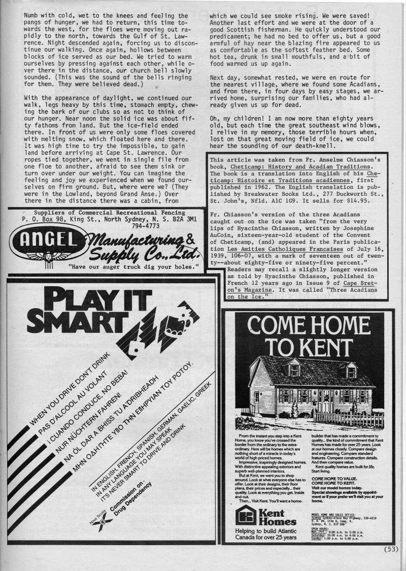 Numb with cold, wet to the knees and feeling the pangs of hunger, we had to return, this time to? wards the west, for the floes were moving out ra? pidly to the north, towards the Gulf of St. Law? rence. Night descended again, forcing us to discon? tinue our walking. Once again, hollows between blocks of ice served as our bed. We tried to warm ourselves by pressing against each other, while o- ver there in the distance, our church bell slowly sounded. (This was the sound of the bells ringing for them. They were believed dead.) With the appearance of daylight, we continued our walk, legs heavy by this time, stomach empty, chew? ing the bark of our clubs so as not to think of our hunger. Near noon the solid ice was about fif? ty fathoms from land. But the ice-field ended there. In front of us were only some floes covered with melting snow, which floated here and there. It was high time to try the impossible, to gain land before arriving at Cape St. Lawrence. Our ropes tied together, we went in single file from one floe to another, afraid to see them sink or turn over under our weight. You can imagine the feeling and joy we experienced when we found our? selves on firm ground. But, where were we? (They were in the Lowland, beyond Grand Anse.) Over there in the distance there was a cabin, from Suppliers of Commercial Recreational Fencing P. 0. Box 98, King St., North Sydney, N. S. B2A 3M1 794-4773 "Have our auger truck dig your holes." JPuarir ' ' -' ''' '''o>''!.<.'? which we could see smoke rising. We were saved! Another last effort and we were at the door of a good Scottish fisherman. He quickly understood our predicament; he had no bed to offer us, but a good armful of hay near the blazing fire appeared to us as comfortable as the softest feather bed. Some hot tea, drunk in small mouthfuls, and a bit of food warmed us up again. Next day, somewhat rested, we were en route for the nearest village, where we found some Acadians, and from there, in four days by easy stages, we ar? rived home, surprising our families, who had al? ready given us up for dead. Oh, my children! I am now more than eighty years old, but each time the great southeast wind blows, I relive in my memory, those terrible hours when, lost on that great moving field of ice, we could hear the sounding of our death-knell. This article was taken from Fr. Anselme Chiasson's book, Cheticamp; History and Acadian Traditions. The book is a translation into English of his Che? ticamp; Histoire et Traditions acadiennes, first published in 1962. The English translation is pub? lished by Breakwater Books Ltd., 277 Duckworth St., St. John's, Nfld. AlC 109. It sells for $14.95. Fr. Chiasson's version of the three Acadians caught out on the ice was taken "from the very lips of Hyacinthe Chiasson, written by Josephine AuCoin, sixteen-year-old student of the Convent of Cheticamp, (and) appeared in the Paris publica? tion Les Amities Catholiques Francaises of July. 16, 1939, 106-07, with a mark of seventeen out of twen? ty • about eighty-five or ninety-five percent." Readers may recall a slightly longer version as told by Hyacinthe Chiasson, published in French 12 years ago in Issue 9 of Cape Bret? on's Magazine. It was called "Three Acadians 11 o'.# ''.< Ion the Ice." COME HOME TO KENT From the instant you step into a Kent Home, you know you ve crossed the border from the ordinary to the extra? ordinary Here will be homes which are nothing short of a miracle in today s world of high priced homes Impressive, inspiringly designed homes With distinctive appealing extenors and superb well-planned interiors. But at Kent, we want you to shop around. Look at what everyone else has to offer. Look at their designs, their floor plans, their prices and especially... their quality. Look at eveiything you get Inskle TTien.. Vistt Kent Youll want a home- Kent Homes Helping to build Atlantic Canada for over 25 years builder that has made a commitment to quality the kind of commitment that Kent Homes has made for over 25 years Look at our homes closely Compare design and engineering Compare standard features. Compare construction details And then compare value Kent quality nomes are duik for jife. Start living. COME HOME TO VALUE. COME HOI?iffi TO KEMT. Visit our model homes today. Special showings avalabie by appoint? ment or If your prefte well visit you at your (53) '