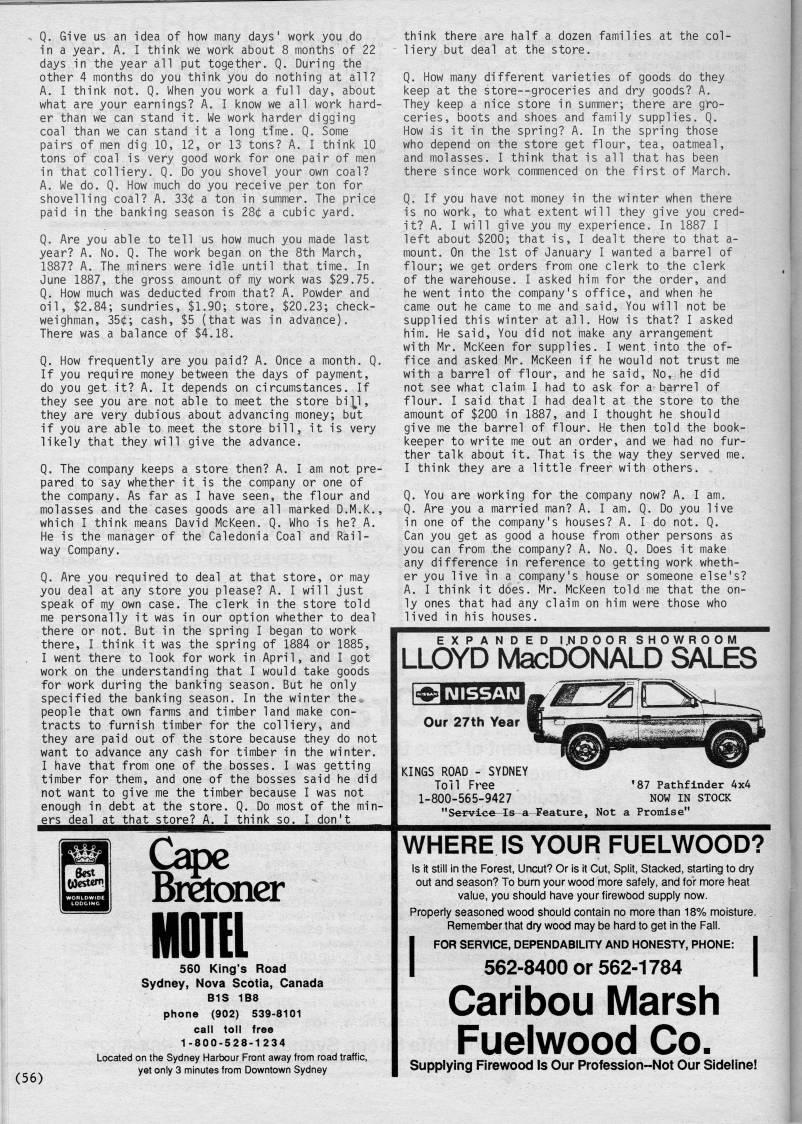 Published by Ronald Caplan on 1987/8/1 (187 reads). Q. Give us an idea of how many days' work you do in a year. A. I think we work about 8 months of 22 days in the year all put together. Q. During the other 4 months do you think you do nothing at all? A. I think not. Q. When you work a full day, about what are your earnings? A. I know we all work hard? er than we can stand it. We work harder digging coal than we can stand it a long time. Q. Some pairs of men dig 10, 12, or 13 tons? A. I think 10 tons of coal is wery good work for one pair of men in that colliery. Q. Do you shovel your own coal? A. We do. Q. How much do you receive per ton for shovelling coal? A. 33(t a ton in summer. The price paid in the banking season is ZSt a cubic yard. Q. Are you able to tell us how much you made last year? A. No. Q. The work began on the 8th March, 1887? A. The miners were idle until that time. In June 1887, the gross amount of my work was $29.75. Q. How much was deducted from that? A. Powder and oil, $2.84; sundries, $1.90; store, $20.23; check- weighman, 35(/:; cash, $5 (that was in advance). There was a balance of $4.18. Q. How frequently are you paid? A. Once a month. Q. If you require money between the days of payment, do you get it? A. It depends on circumstances. If they see you are not able to meet the store biy, they are wery dubious about advancing money; but if you are able to meet the store bill, it is very likely that they will give the advance. Q. The company keeps a store then? A. I am not pre? pared to say whether it is the company or one of the company. As far as I have seen, the flour and molasses and the cases goods are all marked D.M.K., which I think means David McKeen. Q. Who is he? A. He is the manager of the Caledonia Coal and Rail? way Company. Q. Are you required to deal at that store, or may you deal at any store you please? A. I will just speak of my own case. The clerk in the store told me personally it was in our option whether to deal there or not. But in the spring I began to work there, I think it was the spring of 1884 or 1885, I went there to look for work in April, and I got work on the understanding that I would take goods for work during the banking season. But he only specified the banking season. In the winter the. people that own farms and timber land make con? tracts to furnish timber for the colliery, and they are paid out of the store because they do not want to advance any cash for timber in the winter. I have that from one of the bosses. I was getting timber for them, and one of the bosses said he did not want to give me the timber because I was not enough in debt at the store. Q. Do most of the min- ers deal at that store? A. I think so. I don't think there are half a dozen families at the col- - liery but deal at the store. Q. How many different varieties of goods do they keep at the store--groceries and dry goods? A. They keep a nice store in summer; there are gro? ceries, boots and shoes and family supplies. Q. How is it in the spring? A. In the spring those who depend on the store get flour, tea, oatmeal, and molasses. I think that is all that has been there since work commenced on the first of March. Q. If you have not money in the winter when there is no work, to what extent will they give you cred? it? A. I will give you my experience. In 1887 I left about $200; that is, I dealt there to that a- mount. On the 1st of January I wanted a barrel of flour; we get orders from one clerk to the clerk of the warehouse. I asked him for the order, and he went into the company's office, and when he came out he came to me and said. You will not be supplied this winter at all. How is that? I asked him. He said. You did not make any arrangement with Mr. McKeen for supplies. I went into the of? fice and asked Mr. McKeen if he would not trust me with a barrel of flour, and he said. No, he did not see what claim I had to ask for a barrel of flour. I said that I had dealt at the store to the amount of $200 in 1887, and I thought he should give me the barrel of flour. He then told the book? keeper to write me out an order, and we had no fur? ther talk about it. That is the way they served me. I think they are a little freer with others. Q. You are working for the company now? A. I am. Q. Are you a married man? A. I am. Q. Do you live in one of the company's houses? A. I do not. Q. Can you get as good a house from other persons as you can from the company? A. No. Q. Does it make any difference in reference to getting work wheth? er you live in a company's house or someone else's? A. I think it does. Mr. McKeen told me that the on? ly ones that had any claim on him were those who lived in his houses. EXPANDED I.N DOOR SHOWROOM LLOYD MacDONALD SALES KINGS ROAD - SYDNEY Toll Free 1-800-565-9427 "Serviee-Is'-a-Feature, Not '87 Pathfinder 4x4 NOW IN STOCK Promise" Bretoner MOTEL (56) 560 King's Road Sydney, Nova Scotia, Canada B1S 1B8 phone (902) 539-8101 call toll free 1-800-528-1234 Located on the Sydney Harbour Front away from road traffic, yet only 3 minutes from Downtown Sydney WHERE IS YOUR FUELWOOD? Is it still in the Forest, Uncut? Or is it Cut, Split, Stacked, starting to dry out and season? To burn your wood more safely, and for more heat value, you should have your firewood supply now. Properly seasoned wood should contain no more than 18% moisture. Remember that dry wood may be hard to get in the Fall. IFOR SERVICE, DEPENDABILITY AND HONESTY, PHONE: I 562-8400 or 562-1784 | Caribou Marsh Fuelwood Co. Supplying Firewood Is Our Profession-Not Our Sideline!
