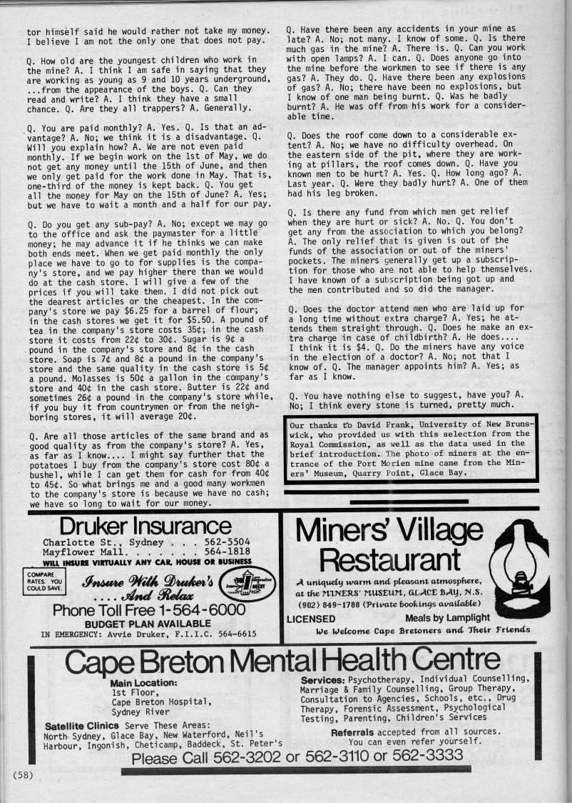 tor himself said he would rather not take my money. I believe I am not the only one that does not pay. Q. How old are the youngest children who work in the mine? A. I think I am safe in saying that they are working as young as 9 and 10 years underground, ...from the appearance of the boys. Q. Can they read and write? A. I think they have a small chance. Q. Are they all trappers? A. Generally. Q. You are paid monthly? A. Yes. Q. Is that an ad? vantage? A. No; we think it is a disadvantage. Q, Will you explain how? A. We are not even paid monthly. If we begin work on the 1st of May, we do not get any money until the 15th of June, and then we only get paid for the work done in May. That is, one-third of the money is kept back. Q. You get all the money for May on the 15th of June? A. Yes; but we have to wait a month and a half for our pay. Q. Do you get any sub-pay? A. No; except we may go to the office and ask the paymaster for a little money; he may advance it if he thinks we can make both ends meet. When we get paid monthly the only place we have to go to for supplies is the compa? ny's store, and we pay higher there than we would do at the cash store. I will give a few of the prices if you will take them. I did not pick out the dearest articles or the cheapest. In the com? pany's store we pay $6.25 for a barrel of flour; in the cash stores we get it for $5.50. A pound of tea in the company's store costs 35(t; in the cash store it costs from 22(t to 30t. Sugar is 9(t a pound in the company's store and Qi in the cash store. Soap is 7' and 8t a pound in the company's store and the same quality in the cash store is St a pound. Molasses is SOt a gallon in the company's store and 40(t in the cash store. Butter is 22(t and sometimes 26(j; a pound in the company's store while, if you buy it from countrymen or from the neigh? boring stores, it will average 20(t. Q. Are all those articles of the same brand and as good quality as from the company's store? A. Yes, as far as I know I might say further that the potatoes I buy from the company's store cost 80' a bushel, while I can get them for cash for from AQt to 45(1!:. So what brings me and a good many workmen to the company's store is because we have no cash; we have so long to wait for our money. Q. Have there been any accidents in your mine as late? A. No; not many. I know of some. Q. Is there much gas in the mine? A. There is. Q. Can you work with open lamps? A. I can. Q. Does anyone go into the mine before the workmen to see if there is any gas? A. They do. Q. Have there been any explosions of gas? A. No; there have been no explosions, but I know of one man being burnt. Q. Was he badly burnt? A. He was off from his work for a consider? able time. Q. Does the roof come down to a considerable ex? tent? A. No; we have no difficulty overhead. On the eastern side of the pit, where they are work? ing at pillars, the roof comes down. Q. Have you known men to be hurt? A. Yes. Q. How long ago? A. Last year. Q. Were they badly hurt? A. One of them had his leg broken. Q. Is there any fund from which men get relief when they are hurt or sick? A. No. Q. You don't get any from the association to which you belong? A. The only relief that is given is out of the funds of the association or out of the miners' pockets. The miners generally get up a subscrip? tion for those who are not able to help themselves. I have known of a subscription being got up and the men contributed and so did the manager. Q. Does the doctor attend men who are laid up for a long time without extra charge? A. Yes; he at? tends them straight through. Q. Does he make an ex? tra charge in case of childbirth? A. He does I think it is $4. Q. Do the miners have any voice in the election of a doctor? A. No; not that I know of. Q. The manager appoints him? A. Yes; as far as I know. Q. You have nothing else to suggest, have you? A. No; I think every stone is turned, pretty much. Our thanks fo David Frank, University of New Bruns? wick, who provided us with this selection from the Royal Commission, as well as the data used in the brief introduction. The photo of miners at the en? trance of the Port Morien mine came from the Min? ers' Museum, Quarry Point, Glace Bay. Druker Insurance Charlotte St., Sydney . . . 562-5504 Mayflower Mall. 564-1818 Will INSUK VIRTUALLY ANY CAR. HOUSE OR JUSINESS COMPARE. RATES. YOU COULD SAVE. Phone Toll Free 1-564-6000 BUDGET PLAN AVAILABLE IN EMERGENCY: Awie Druker, F.I.I.C. 564-6615 Miners' Village Restaurant A unuiueCi' tvarm antC pleasant attnosphcre, at tfi • ni>fEkS' nusEun, aL'cE B>'i), n.s. (902) 849-1788 (Private booftings available) LICENSED Meals by Lamplight We Welcome Cape Bretoners ancC Their friends Cape Breton Mental Health Centre Main Location: 1st Floor, Cape Breton Hospital, Sydney River Satellite Clinics Serve These Areas: North- Sydney, Glace Bay, New Waterford, Neil's Harbour, Ingonish, Cheticamp, Baddeck, St. Peter's Services: Psychotherapy, Individual Counselling, Marriage & Family Counselling, Group Therapy, Consultation to Agencies, Schools, etc.. Drug Therapy, Forensic Assessment, Psychological Testing, Parenting, Children's Services Referrals accepted from all sources. You can even refer yourself. Please Call 562-3202 or 562-3110 or 562-3333 (58)