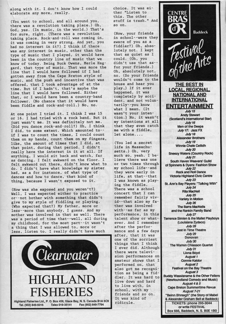 Published by Ronald Caplan on 1988/6/1 (227 reads)along with it. I don't know how I could elaborate any more, really. (You went to school, and all around you, there was a revolution taking place.) Oh, God, yes. (In music, in the world.) That's for sure, right. (There was a revolution taking place. Rock-a.nd-roll was coming in, it was coming in very strong. And yet, you had no interest in it?) I think if there was any interest in music, other than the type of music that I played, it would have been in the country line of music that we know of today. Being Buck Owens, Merle Hag? gard, that type of music. That was more the line that I would have followed if I had gotten away from the Cape Breton style of music, and the push and incentive that was offered, that I took advantage of at the time. But if I hadn't, that's maybe the line that I would have followed. Either that, or I would have been a country-band follower. (No chance that it would have been fiddle and rock-and-roll.) No, no. At one point I tried it. I think I was 15 or 16. I had tried with a rock band. But it just wasn't me. It was definitely not me. (Did you dance rock-and-roll?) Uh, I think I did, to some extent. Which amounted to-- if I was to count the times, I could count them on my hands, count them on my fingers, like, the amount of times that I did, at that point, during that period. I didn't really have the interest in it at all. If anything, I would sit back and watch, far as dancing. I felt awkward on the floor. I felt awkward out there, didn't know what to do. I didn't have what knowledge my sister had, as a for instance, of what type of dances and how to dance, that kind of thing, because I wasn't exposed to it. (How was she exposed and you weren't?) Well. I was expected either to practice or--not bother with something that didn't give to my style of fiddling or playing. (Who expected that?) My father, more or less--more than anybody, I guess. And my mother was involved in that as well. There was a period of time that--well, all during my childhood, for the most part--it wasn't a thing that I was allowed to, more or less, listen to. I really didn't have much Clearwater HIGHLAND FISHERIES Highland Fisheries Ltd, P. O. Box 459, Glace Bay, N. S. Canada B1A 6C9 Tel. (902) 849-6016 Telex 019-35141 Fax (902) 849-7794 choice. It was ei? ther "Listen to this. The other stuff is trash." And so on. (Now, your friends in school--were they aware of you as a fiddler?) Oh, abso? lutely not. I kept that as quiet as I could. (Oh, you didn't use that as-- for your friends.) Oh, absolutely not, no. (So your friends wouldn't come to the house and hear you play.) If it ever happened, it was completely by acci? dent, and not volun? tarily- -you know what I mean. (It wasn't your inten? tion.) No, it wasn't my intentions at all that they even catch me with a fiddle, let alone.... (You led a secret life in Massachu? setts.) Oh, very much so, yeah. I be? lieve there was one or two times through my school life--and they were early in life, at that--that I was known as play? ing the fiddle. There was a school concert that I can remember fairly viv? id- -that also my fa? ther was involved with--as far as my performance, in this talent show or what? ever . And I remember after the perfor? mance and a few days after, that it was one of the sorriest things that I think I ever did. Although there were televi? sion performances on amateur shows that I performed on. that also got me recogni? tion as being a fid? dler. It was hard to live down and hard to live with, in school, with my friends and so on. It was kind of ridicule. THE BEST IN lOQAU RgQIQNAL NATIONAL AND INTERNATIONAL ENTERTAINMENT July 15 Andy Stewart (Scotland's Intemational Star) July 16 Men of the Deeps July 17: JazzFX July 18 Alexander Brothers July 19 Winnie Chaf6 Ceilidh July20 Sneezy Waters (Country Rock) July21 South Haven Weavers' Guild of Spinners & Dyers: Fashion Show July22 Rock and Roll Dance Vtetoria Highland Civic Centre July23 St. Ann's Bay Players: "Talking With" July24 Rita IVIacNeil July25 Variety in Motton July26 The Bana M?;Neils and the Rankin Family Band July27 Terrence Simien & the Mallet Playboys (Louisiana Zydeco) July28 Jest in Time Theatre July29 Donovan JulySO The Wan'n Chiasson Quartet July31 Ltona Boyd August 1 Connie Kaldor August 2 Festival on the Bay Theatre AugL'3 Buddy Wassisname & the Other Fellers (Newfoundland Comedy and Music) August 4& 5 Cape Breton Summertime Revue August 7-21 "Beinn Bhreagh" (the Story of IVIabel & Alexander Graham Bell at Baddeck) TICKETS: phone 295-3044 or write FESTIVAL Box666, Baddeck, N. S. BOE IBO