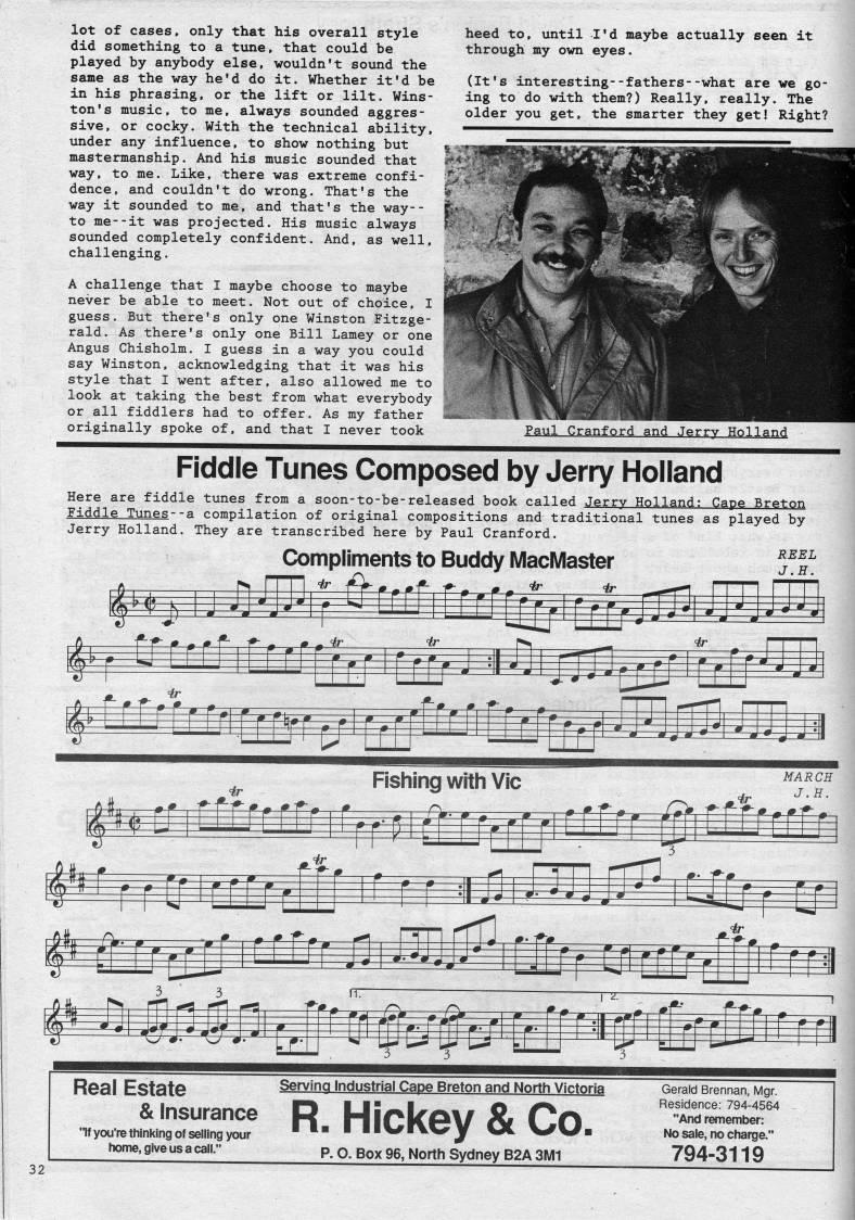 Published by Ronald Caplan on 1988/6/1 (297 reads)lot of cases, only that his overall style did something to a tune, that could be played by anybody else, wouldn't sound the same as the way he'd do it. Whether it'd be in his phrasing, or the lift or lilt. Wins? ton's music, to me, always sounded aggres? sive, or cocky. With the technical ability, under any influence, to show nothing but mastermanship. And his music sounded that way, to me. Like, there was extreme confi? dence, and couldn't do wrong. That's the way it sounded to me, and that's the way-- to me--it was projected. His music always sounded completely confident. And, as well, '' , /'' challenging. A challenge that I maybe choose to maybe never be able to meet. Not out of choice, I guess. But there's only one Winston Fitzge? rald. As there's only one Bill Lamey or one Angus Chisholm. I guess in a way you could say Winston, acknowledging that it was his style that I went after, also allowed me to look at taking the best from what everybody or all fiddlers had to offer. As my father originally spoke of, and that I never took heed to, until I'd maybe actually seen it through my own eyes. (It's interesting--fathers--what are we go? ing to do with them?) Really, really. The older you get, the smarter they get! Right? Paul Cranford and Jerry Holland Fiddle Tunes Composed by Jerry Holland Here are fiddle tunes from a soon-to-be-released book called Jerry Holland: Cape Breton Fiddle Tunes--a compilation of original compositions and traditional tunes as played by Jerry Holland. They are transcribed here by Paul Cranford. Compliments to Buddy MacMaster REEL J.H. Fishing with Vic MARCH J.H. iit i>-f. .ff irrTfr niHGffl irTfrf rrirrrrTfff 3 JJrj # 0 3 f- 11. 3 : ! ??'?? • • 1 #1 fL' ', ??- I 0 ' Real Estate & Insurance "If you're thinking of selling your home, give us a call." Serving Industrial Cape Breton and North Victoria R. Hickey & Co. p. O. Box 96, North Sydney B2A 3M1 Gerald Brennan, Mgr. Residence: 794-4564 "And remember: No sale, no charge." 794-3119