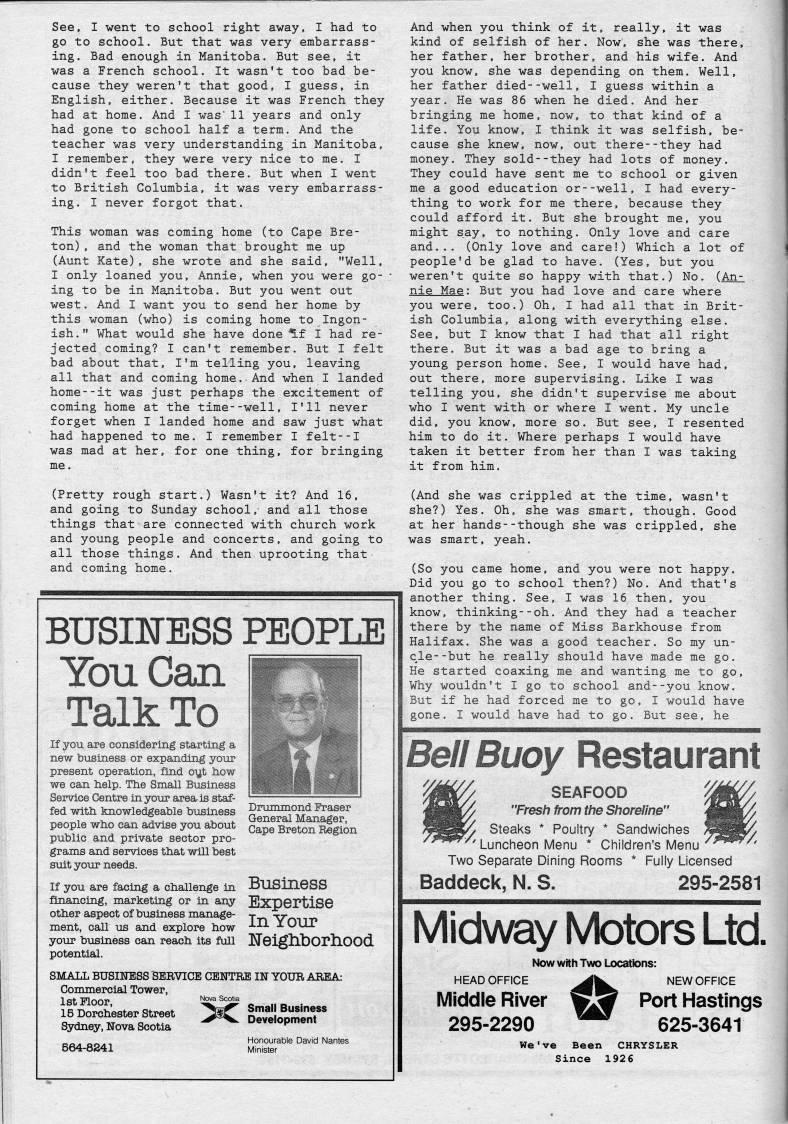 Published by Ronald Caplan on 1988/6/1 (290 reads)See, I went to school right away, I had to go to school. But that was very embarrass? ing. Bad enough in Manitoba. But see, it was a French school. It wasn't too bad be? cause they weren't that good, I guess, in English, either. Because it was French they had at home. And I was" 11 years and only had gone to school half a term. And the teacher was very understanding in Manitoba, I remember, they were very nice to me. I didn't feel too bad there. But when I went to British Columbia, it was very embarrass? ing. I never forgot that. This woman was coming home (to Cape Bre? ton) , and the woman that brought me up (Aunt Kate), she wrote and she said, "Well, I only loaned you, Annie, when you were go- • ing to be in Manitoba. But you went out west. And I want you to send her home by this woman (who) is coming home to Ingon? ish." What would she have done 'f I had re? jected coming? I can't remember. But I felt bad about that, I'm telling you, leaving all that and coming home.-And when I landed home--it was just perhaps the excitement of coming home at the time--well, I'll never forget when I landed home and saw just what had happened to me. I remember I felt--I was mad at her, for one thing, for bringing And when you think of it, really, it was kind of selfish of her. Now, she was there, her father, her brother, and his wife. And you know, she was depending on them. Well, her father died--well, I guess within a year. He was 86 when he died. And her bringing me home, now, to that kind of a life. You know, I think it was selfish, be? cause she knew, now, out there--they had money. They sold--they had lots of money. They could have sent me to school or given me a good education or--well, I had every? thing to work for me there, because they could afford it. But she brought me, you might say, to nothing. Only love and care and... (Only love and care!) Which a lot of people'd be glad to have. (Yes, but you weren't quite so happy with that.) No. (An? nie Mae: But you had love and care where you were, too.) Oh, I had all that in Brit? ish Columbia, along with everything else. See, but I know that I had that all right there. But it was a bad age to bring a young person home. See, I would have had, out there, more supervising. Like I was telling you, she didn't supervise me about who I went with or where I went. My uncle did, you know, more so. But see, I resented him to do it. Where perhaps I would have taken it better from her than I was taking it from him. (Pretty rough start.) Wasn't it? And 16, and going to Sunday school,- and all those things that are connected with church work and young people and concerts, and going to all those things. And then uprooting that and coming home. BUSINESS PEOPLE You Can Talk To If you are considering starting a new business or expanding your present operation, find oyt how we can help. The Small Business Service Centre in your area is staf? fed with knowledgeable business people who can advise you about public and private sector pro? grams and services that will best suit your needs. If you are facing a challenge in financing, marketing or in any other aspect of business manage? ment, call us and explore how your business can reach its full potential. SMALL BUSINESS 'SERVICE CENTRE IN YOUR AREA: Commercial Tower, 1st Floor, Drummond Fraser General Manager, Cape Breton Region Business Expertise InYoiir Neigliborliood 15 Dorchester Street ;>' 'mall Business Sydney, Nova Scotia 664-8241 Development (And she was crippled at the time, wasn't she?) Yes. Oh, she was smart, though. Good at her hands--though she was crippled, she was smart, yeah. (So you came home, and you were not happy. Did you go to school then?) No. And that's another thing. See, I was 16 then, you know, thinking--oh. And they had a teacher there by the name of Miss Barkhouse from Halifax. She was a good teacher. So my un? cle- -but he really should have made me go. He started coaxing me and wanting me to go. Why wouldn't I go to school and--you know. But if he had forced me to go, I would have gone. I would have had to go. But see, he Bell Buoy Restaurant SEAFOOD "Fresh from the Shoreline" yy Steaks * Poultry * Sandwiches '' Luncheon Menu * Children's Menu ' Two Separate Dining Rooms * Fully Licensed Baddecl<, N. S. 295-2581 MidA/ay Motors Ltd. htow with Tvwo Locations: HEAD OFFICE '' NEW OFFICE Middle River Wg Port Hastings 295-2290 '"' 625-3641 We've Been CHRYSLER Since 192 6