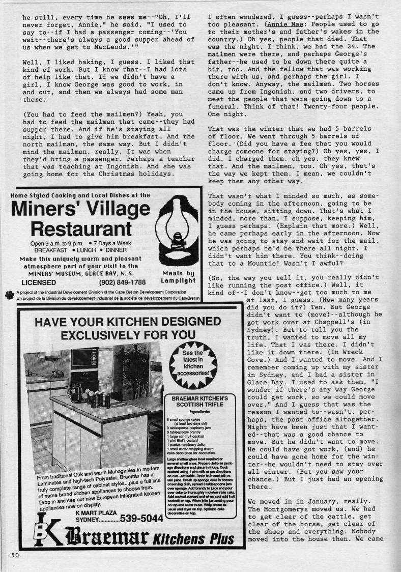 Published by Ronald Caplan on 1988/6/1 (165 reads)he still, every time he sees me--''Oh, I'll never forget, Annie," he said, "I used to say to--if I had a passenger coming--'You wait--there's always a good supper ahead of us when we get to MacLeods.'" Well, I liked baking, I guess. I liked that kind of work. But I know that--I had lots of help like that. If we didn't have a girl, I know George was good to work, in and out, and then we always had some man there. (You had to feed the mailmen?) Yeah, you had to feed the mailman that came--they had supper there. And if he's staying all night, I had to give him breakfast. And the north mailman, the same way. But I didn't mind the mailman, really. It was when they'd bring a passenger. Perhaps a teacher that was teaching at Ingonish. And she was going home for the Christmas holidays. Home Styled Cooking and Local Dishes at the Miners* Village Restaurant Open 9 a.m. to 9 p.m. • 7 Days a Week BREAKFAST • LUNCH • DINNER Make this uniquely warm and pleasant atmosphere part of your uisit to the MINERS' MUSEUM, GLflCE BflV, N. S. LICENSED (902)849-1788 Meals by Lamplight ' A project of the Industrial Development Division oJ the Cape Breton Development Corporation ?? Un project de la Division du developpement industriel de la societe de developpement du Cap-Breto HAVE YOUR KITCHEN DESIGNED EXCLUSIVELY FOR YOU appliances now on display. mmm, 1'' MA DTD • p""' KMARTPLAZA _'_ '''' JT' SYDNEY 539-5044 BRAEMAR KITCHEN'S SCOTTISH TRIFLE n am. rmprnm jeno w pai I age dbedonsuiil place in fridg*. Cook on cin_Mt aside. Drain IniH cockM; re? tain liioe. Bleak up sponge cate in bottom I ofservfcigdah'spreKiStafaleepoonslam r sponge. Add brandy to lutoe and pou' ??no wnsn cool add thjH cocklall on lopL When |e?o just aeUng pour on top and aHow to aet Whip cream aa iiaual and layer on topL Sprinkle cake ?? ' SYDNEY 539-5044 ' ' 'MtnzmUX Kitchens Plus I often wondered, I guess--perhaps I wasn't too pleasant. (Annie Mae: People used to go to their mother's and father's wakes in the country.) Oh yes, people that died. That was the night, I think, we had the 24. The mailmen were there, and perhaps George's father--he used to be down there quite a bit, too. And the fellow that was working there with us, and perhaps the girl. I don't know. Anyway, the mailmen. Two horses came up from Ingonish, and two drivers, to meet the people that were going down to a funeral. Think of that! Twenty-four people. One night. That was the winter that we had 5 barrels of floor. We went through 5 barrels of floor. (Did you have a fee that you would charge someone for staying?) Oh yes, yes, I did. I charged them, oh yes, they knew that. And the mailmen, too. Oh yes, that's the way we kept them. I mean, we couldn't keep them any other way. That wasn't what I minded so much, as some? body coming in the afternoon, going to be in the house, sitting down. That's what I minded, more than, I suppose, keeping him, I guess perhaps. (Explain that more.) Well, he came perhaps early in the afternoon. Now he was going to stay and wait for the mail, which perhaps he'd be there all night. I didn't want him there. You think--doing that to a Mountie! Wasn't I awful? (So, the way you tell it, you really didn't like running the post office.) Well, it kind of--I don't know--got too much to me at last, I guess. (How many years did you do it?) Ten. But George didn't want to (move)--although he got work over at Chappell's (in Sydney). But to tell you the truth, I wanted to move all my life. That I was there. I didn't like it down there. (In Wreck Cove.) And I wanted to move. And I remember coming up with my sister in Sydney, and I had a sister in Glace Bay. I used to ask them, "I wonder if there's any way George could get work, so we could move over." And I guess that was the reason I wanted to--wasn't, per? haps, the post office altogether. Might have been just that I want? ed- -that was a good chance to move. But he didn't want to move. He could have got work, (and) he could have gone home for the win? ter- -he wouldn't need to stay over all winter. (But you saw your chance.) But I just had an opening there. We moved in in January, really. The Montgomerys moved us. We had to get clear of the cattle, get clear of the horse, get clear of the sheep and everything. Nobody moved into the house then. We came (