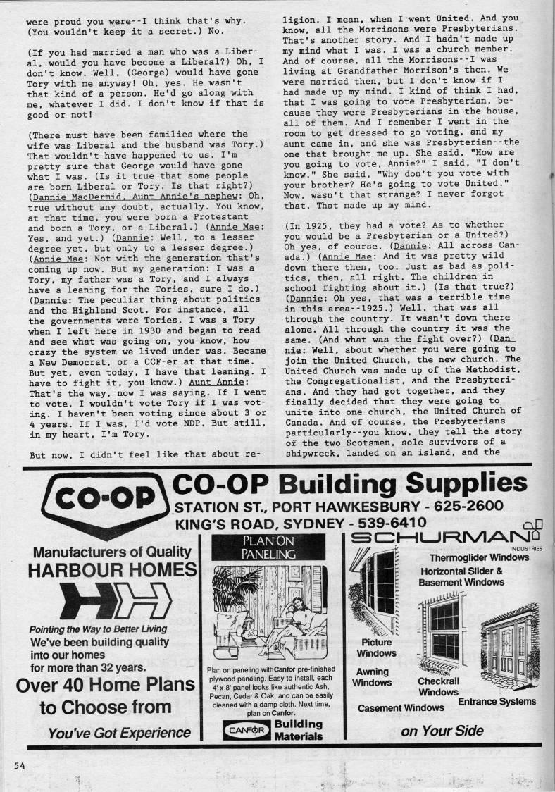 Published by Ronald Caplan on 1988/6/1 (154 reads)were proud you were--I think that's why. (You wouldn't keep it a secret.) No. (If you had married a man who was a Liber? al , would you have become a Liberal?) Oh, I don't know. Well, (George) would have gone Tory with me anyway! Oh, yes. He wasn't that kind of a person. He'd go along with me, whatever I did. I don't know if that is good or not! (There must have been families where the wife was Liberal and the husband was Tory.) That wouldn't have happened to us. I'm pretty sure that George would have gone what I was. (Is it true that some people are born Liberal or Tory. Is that right?) (Dannie MacDermid. Aunt Annie's nephew: Oh, true without any doubt, actually. You know, at that time, you were born a Protestant and born a Tory, or a Liberal.) (Annie Mae: Yes, and yet.) (Dannie: Well, to a lesser degree yet, but only to a lesser degree.) (Annie Mae: Not with the generation that's coming up now. But my generation: I was a Tory, my father was a Tory, and I always have a leaning for the Tories, sure I do.) (Dannie: The peculiar thing about politics and the Highland Scot. For instance, all the governments were Tories. I was a Tory when I left here in 1930 and began to read and see what was going on, you know, how crazy the system we lived under was. Became a New Democrat, or a CCF-er at that time. But yet, even today, I have that leaning. I have to fight it, you know.) Aunt Annie: That's the way, now I was saying. If I went to vote, I wouldn't vote Tory if I was vot? ing. I haven't been voting since about 3 or 4 years. If I was, I'd vote NDP. But still, in my heart, I'm Tory. But now, I didn't feel like that about re? ligion. I mean, when I went United. And you know, all the Morrisons were Presbyterians. That's another story. And I hadn't made up my mind what I was. I was a church member. And of course, all the Morrisons--I was living at Grandfather Morrison's then. We were married then, but I don't know if I had made up my mind. I kind of think I had, that I was going to vote Presbyterian, be? cause they were Presbyterians in the house, all of them. And I remember I went in the room to get dressed to go voting, and my aunt came in, and she was Presbyterian--the one that brought me up. She said, "How are you going to vote, Annie?" I said, "I don't know." She said, "Why don't you vote with your brother? He's going to vote United." Now, wasn't that strange? I never forgot that. That made up my mind. (In 1925, they had a vote? As to whether you would be a Presbyterian or a United?) Oh yes, of course. (Dannie: All across Can? ada.) (Annie Mae: And it was pretty wild down there then, too. Just as bad as poli? tics, then, all right. The children in school fighting about it.) (Is that true?) (Dannie: Oh yes, that was a terrible time in this area--1925.) Well, that was all through the country. It wasn't down there alone. All through the country it was the same. (And what was the fight over?) (Dan? nie: Well, about whether you were going to join the United Church, the new church. The United Church was made up of the Methodist, the Congregationalist, and the Presbyteri? ans. And they had got together, and they finally decided that they were going to unite into one church, the United Church of Canada. And of course, the Presbyterians particularly--you know, they tell the story of the two Scotsmen, sole survivors of a shipwreck, landed on an island, and the CT'TTX CO-OP Building Supplies ' V WK STATION ST., PORT HAWKESBURY - 625-2600 KING'S ROAD, SYDNEY - 539-6410 qD ' C3l-HL_IF'rVl>2